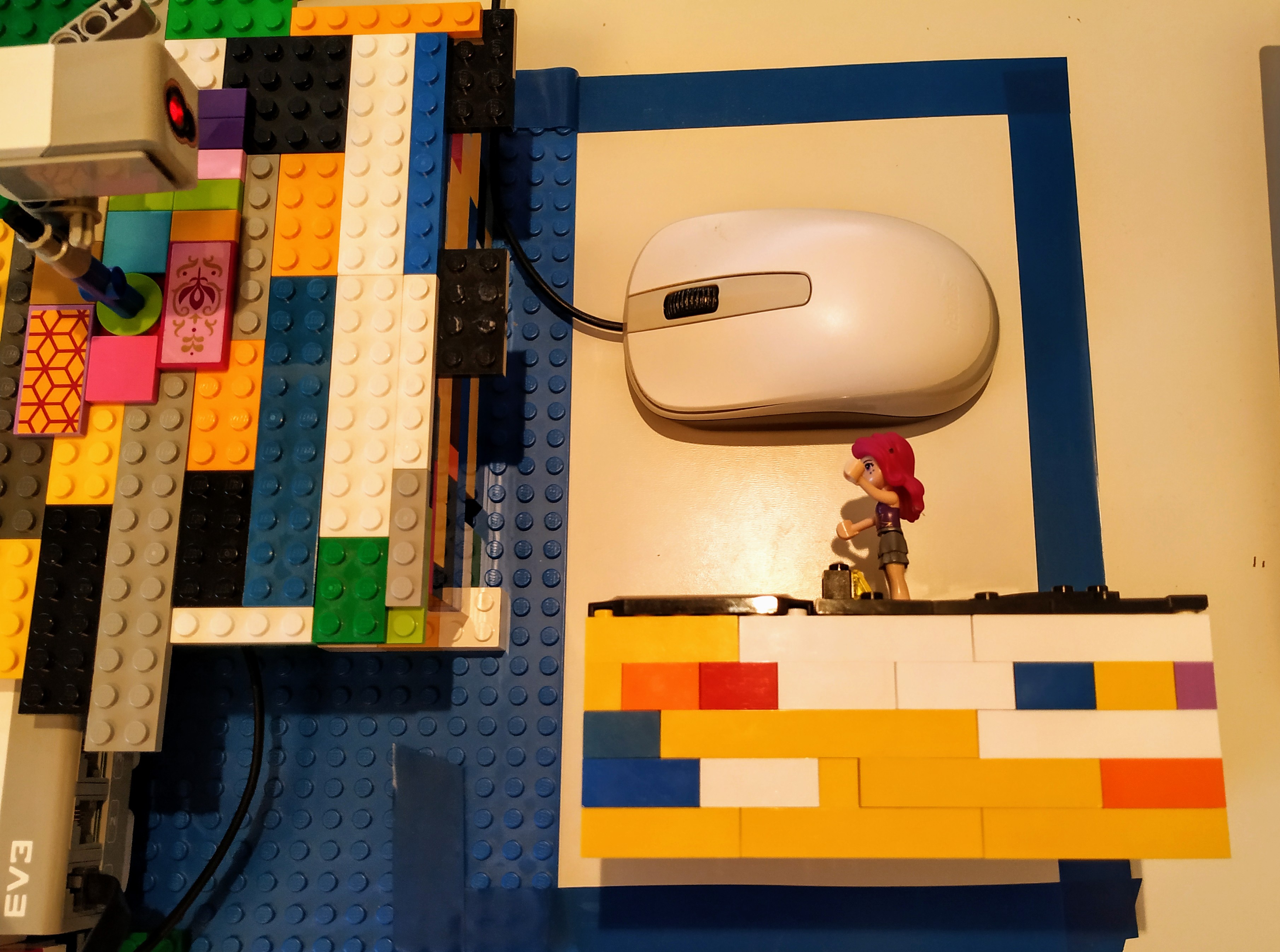 Program tohto robota je v pythóne a pozostáva z dvoch threads - v hlavnej vetve robot otáča svetielko (color senzor) smerom k figúrke podľa aktuálnej polohy myši, vedľajšia thread spracováva eventy myši a počíta jej aktuálnu polohu.