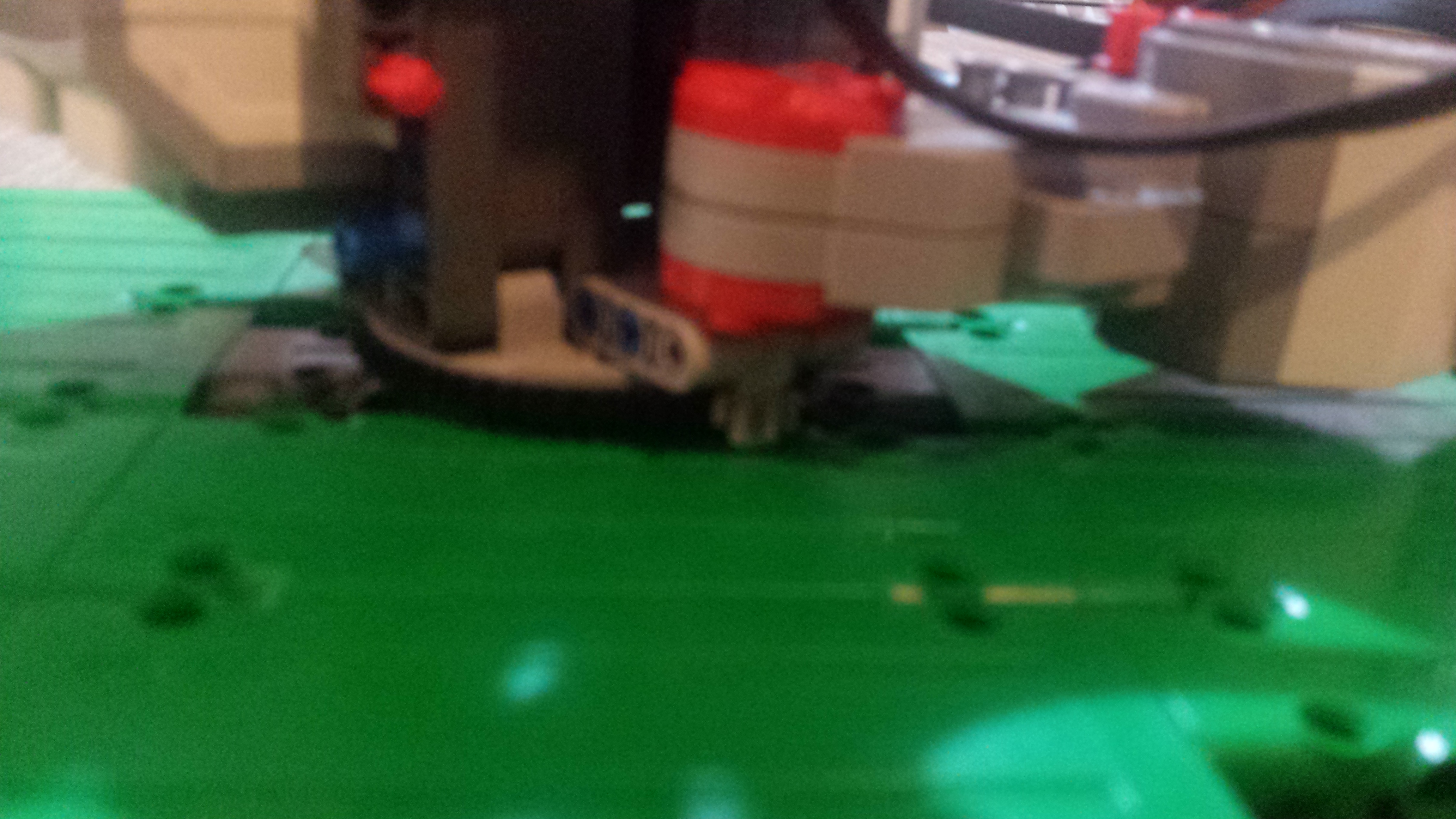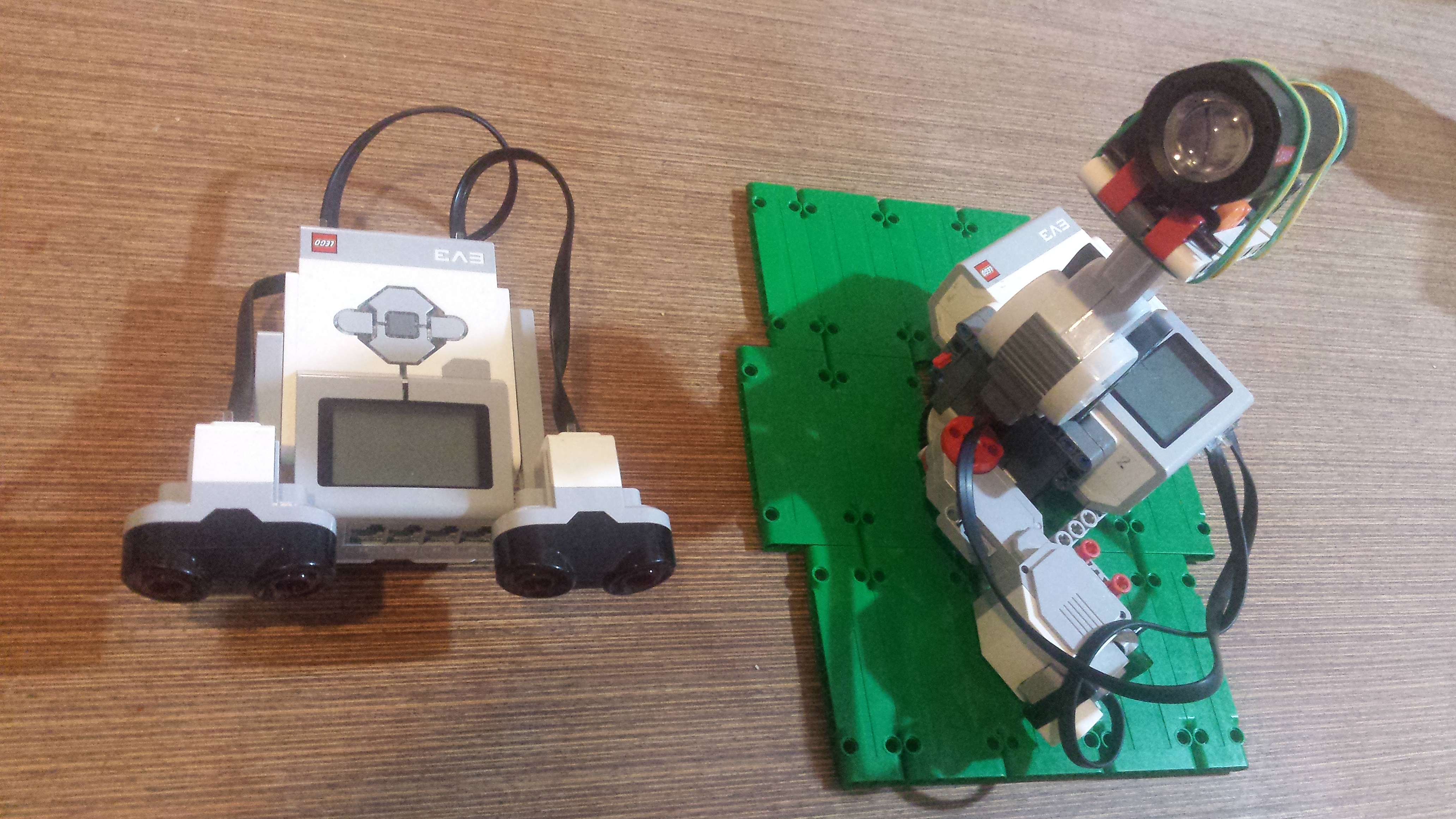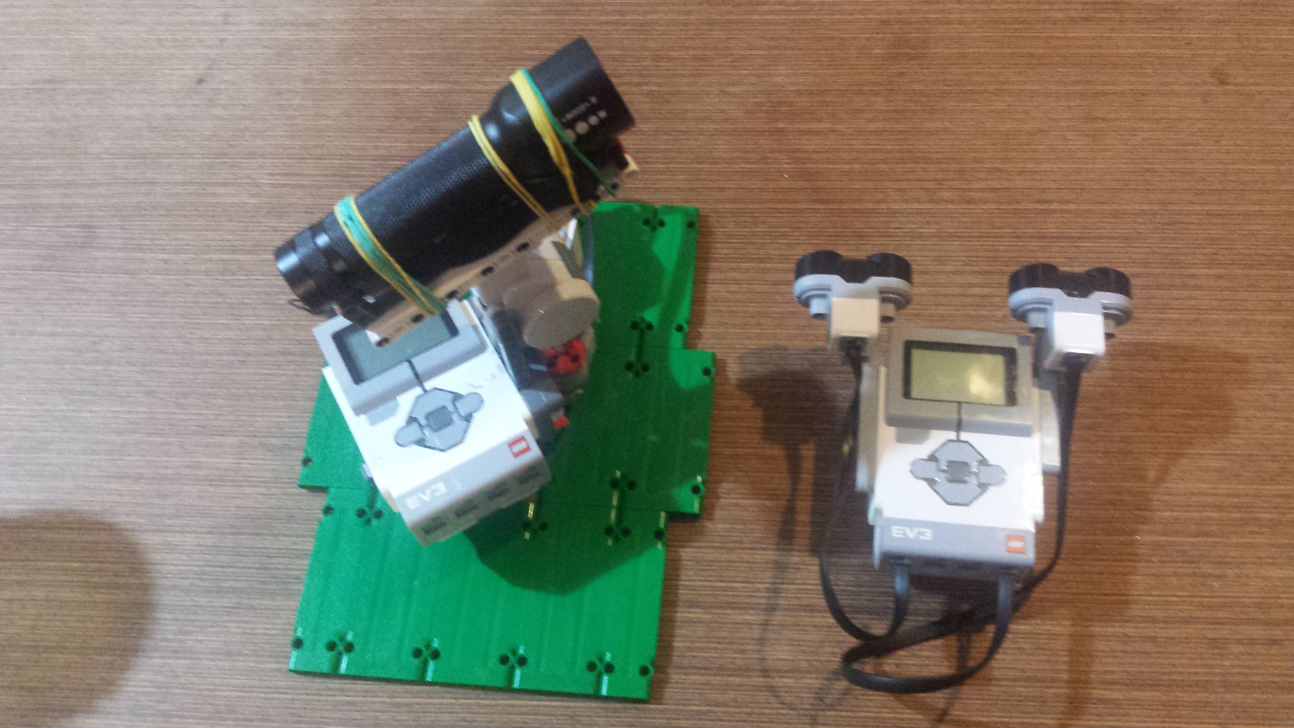 Prvý robot je jednoduchý. Skladá sa z kocky a 2x usg senzora.Zboku javiska zosníma polohu tanečníka a informáciu pošle cez bluetoot druhému robotovi. Aby robot neposielal priveľa informácií, loop sme mu spomalili vložením čakania. Aj USG senzor sa tak správal lepšie.