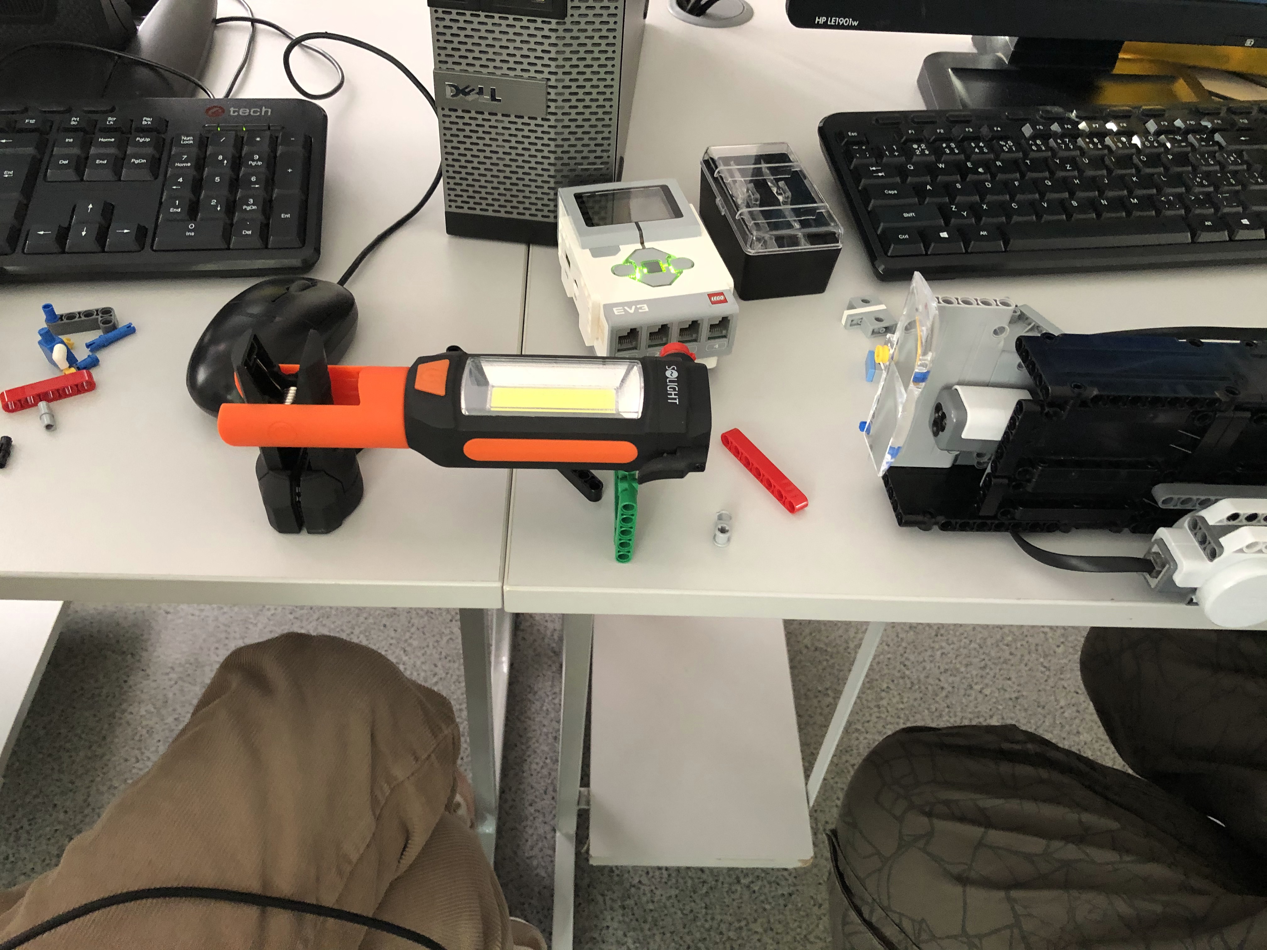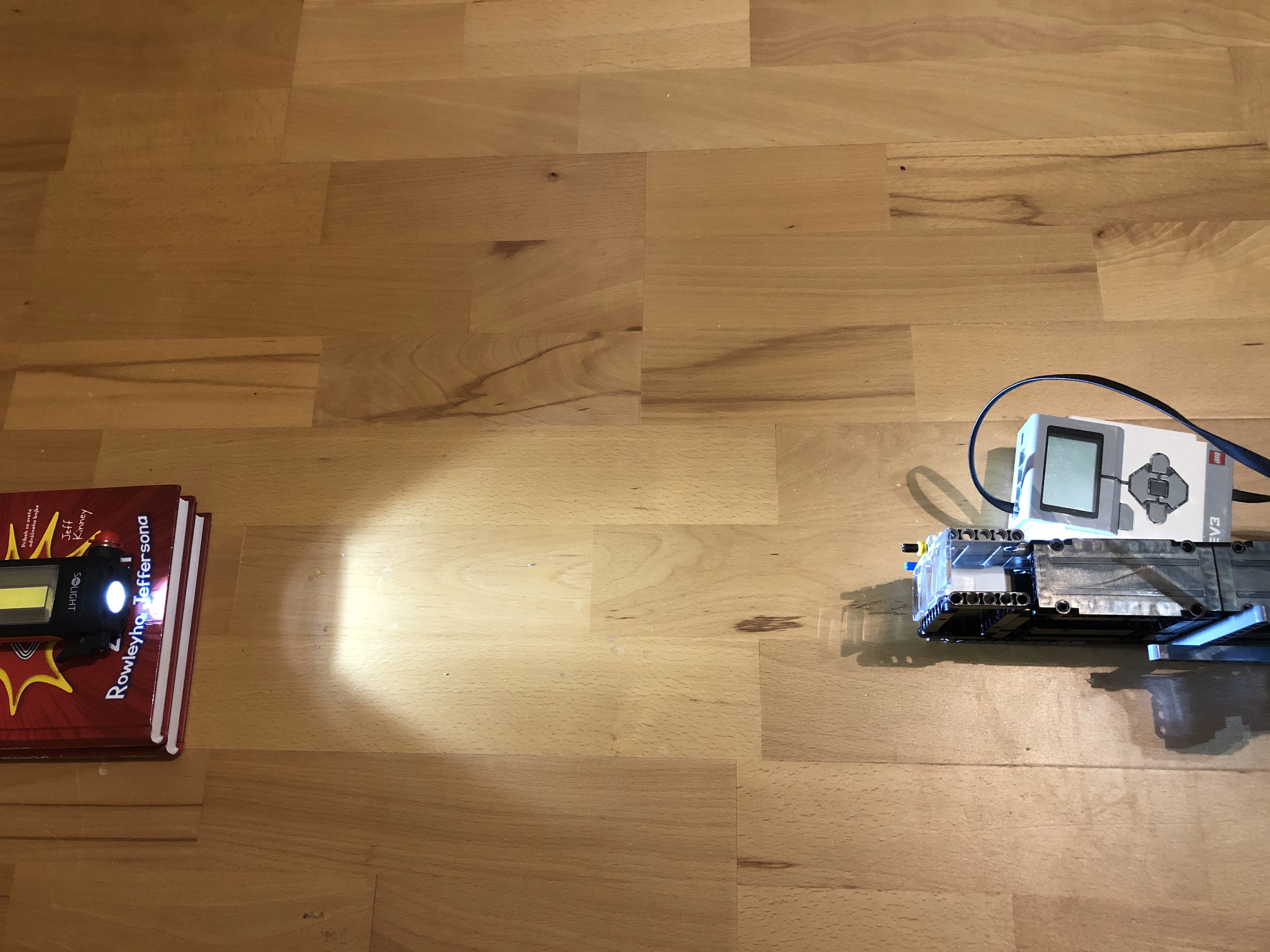 Najprv sme vyskúšali pohybovať ramenom ručne a v programe ev3 sme si vytvorili experiment v ktorom sme sledovali ako sa mení namerané svetlo podľa toho ako sa pohybuje rameno. Zistili sme že keď sme mali baterku blízko, tak veľmi rýchlo narástlo merané svetlo na maximum a už sme potom nevedeli zistiť kde je svetlo najsilnejšie. Odmerali sme si že baterka musí byť aspoň 40 cm od lupy.