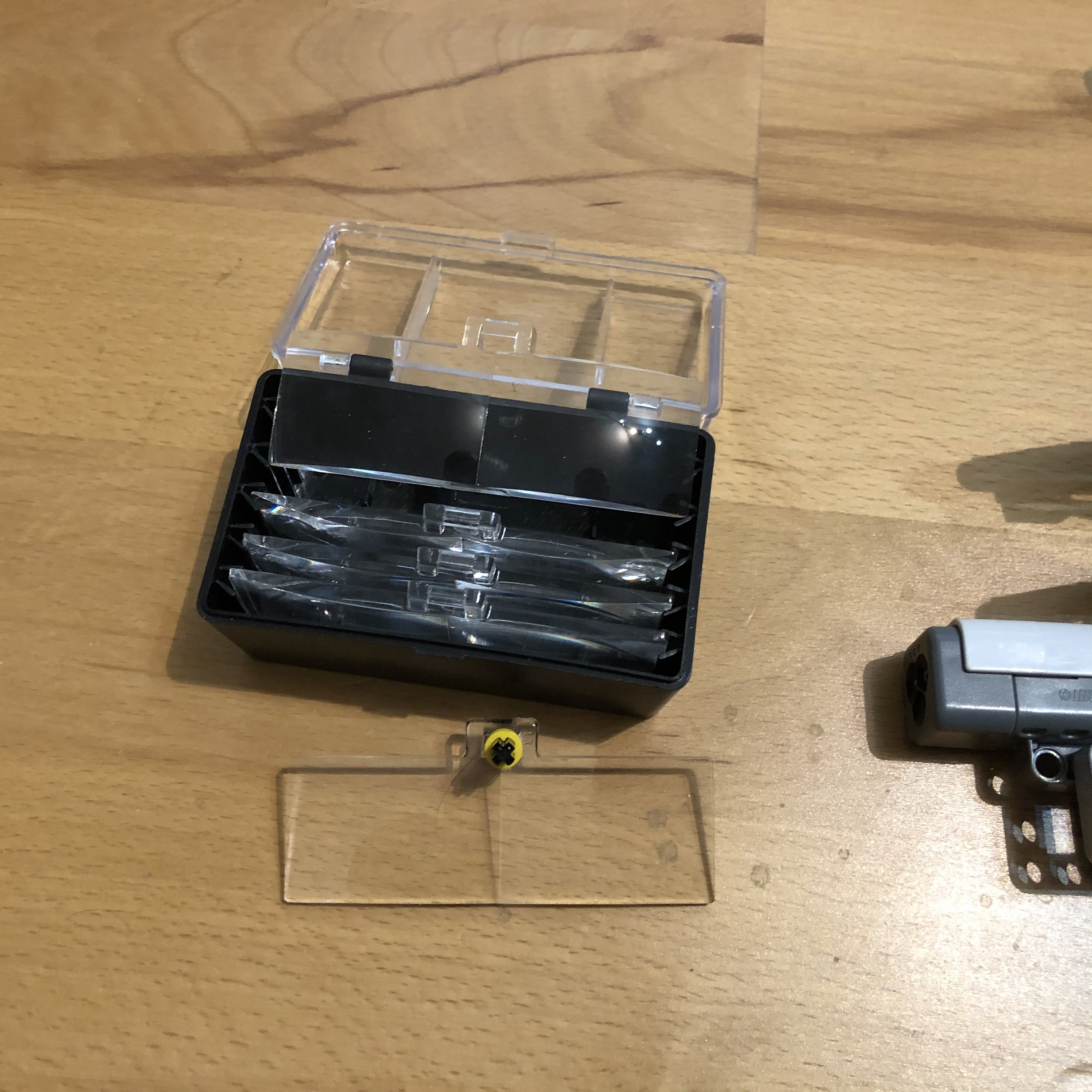 Na zmeranie ohniskovej vzdialenosti sme vytvorili tunel z lego blokov v ktorom je rameno so svetelným senzorom. Dopredu sme postavili baterku ktorou sme svietili na senzor cez lupu.