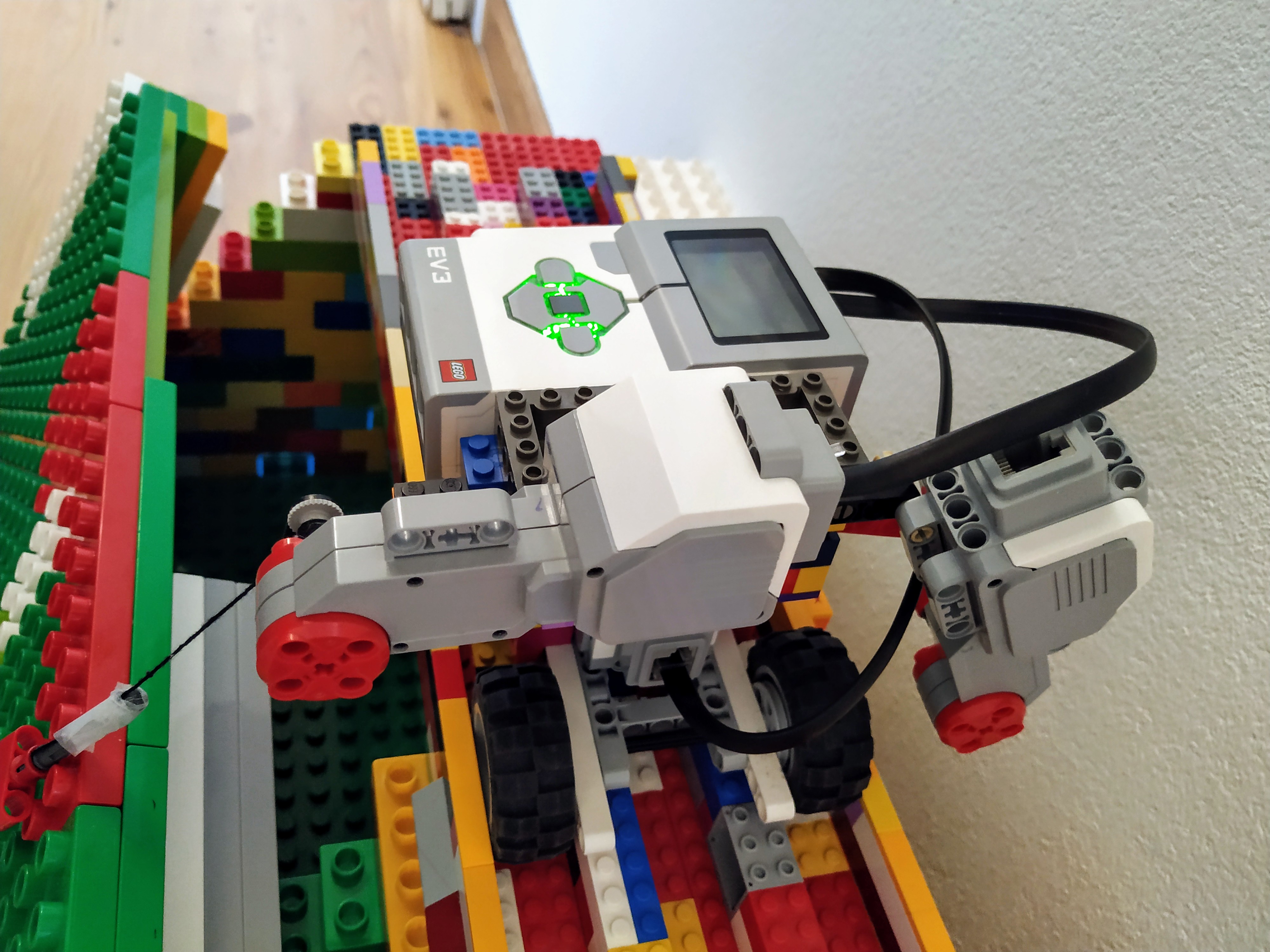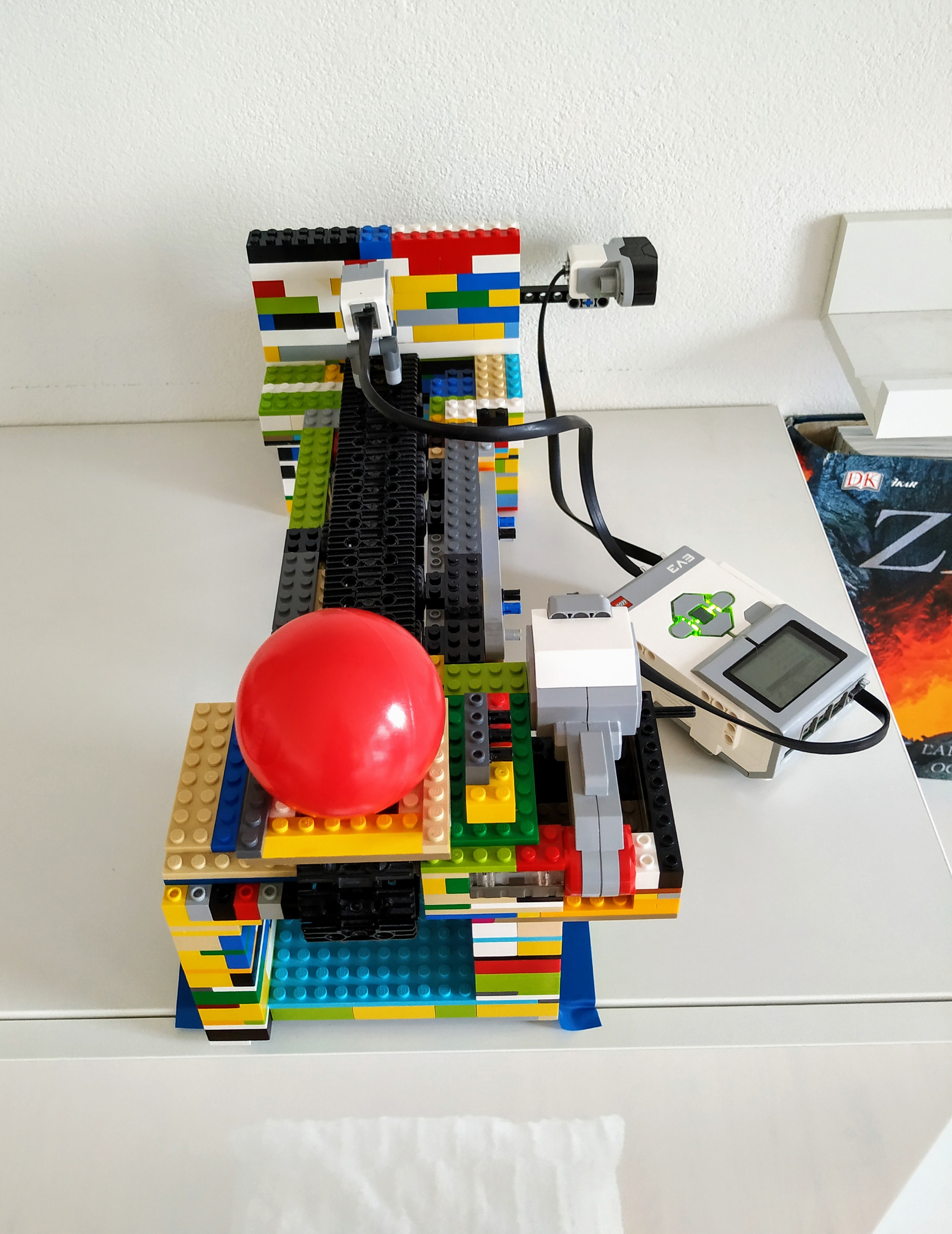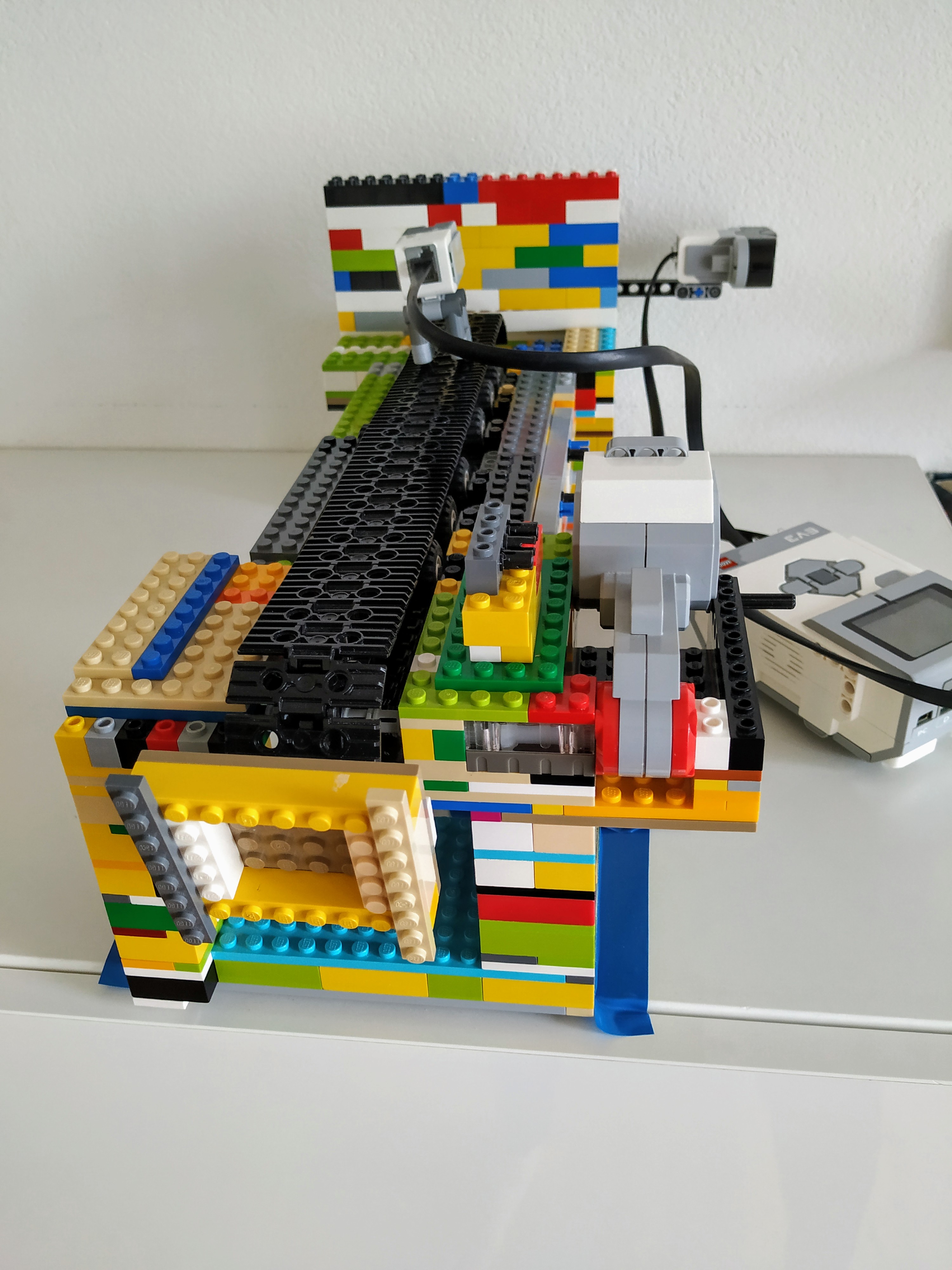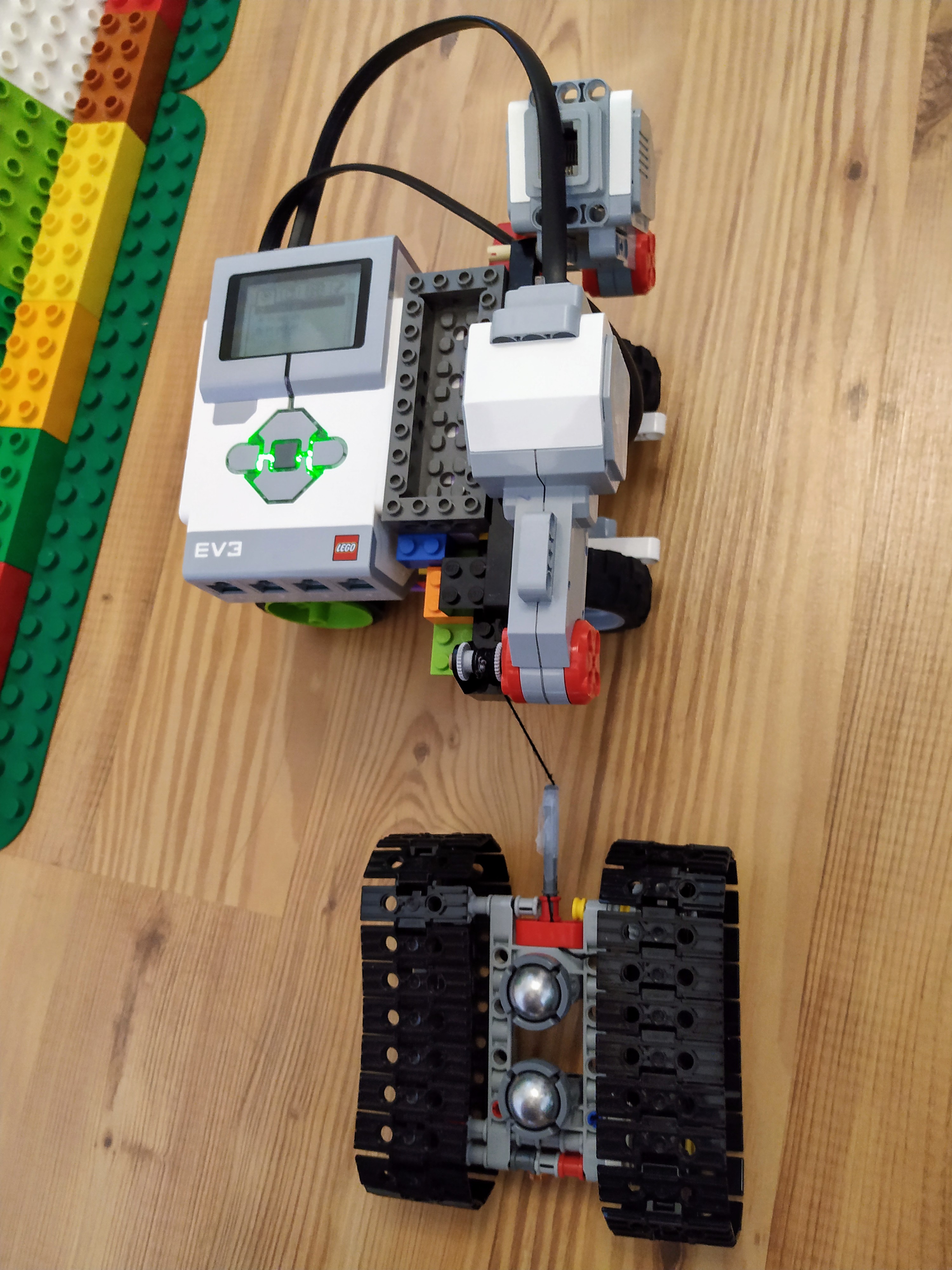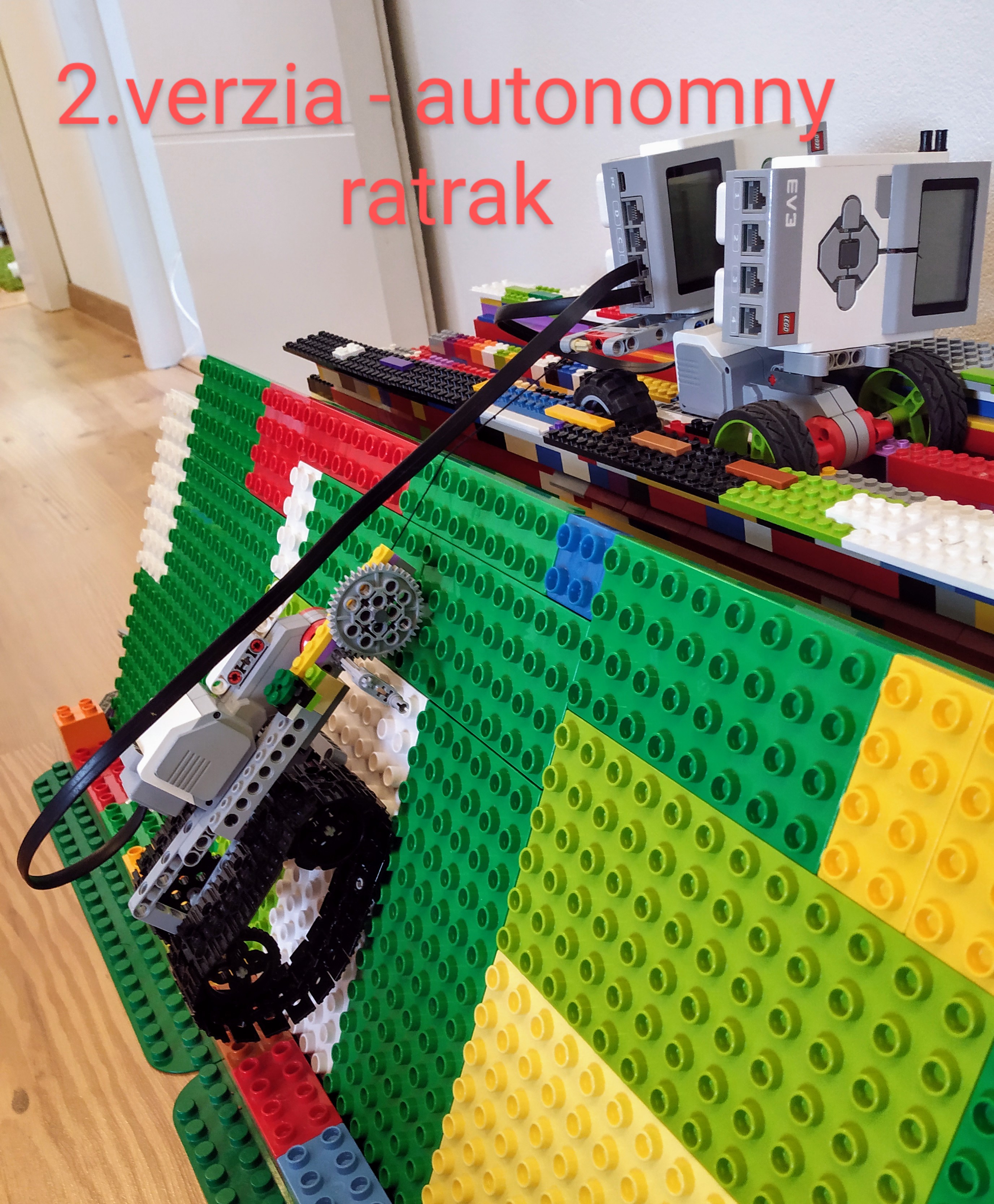 Edit: Potom sme si ale prečítali ešte raz zadanie a rozmysleli sme si, že by bolo lepšie postaviť ratrak, ktorý by sa sám vyťahoval, a upravili sme konštrukciu tak, aby kocka s navíjacím mechanizmom bola na ratraku, nie navrchu naklonenej roviny. Program teraz funguje tak, že vrchný robot sa vždy posunie o kúsok dopredu, pošle správu ratraku, ratrak raz prejde hore-dolu po páse, a potom sa prvý robot zase pohne.