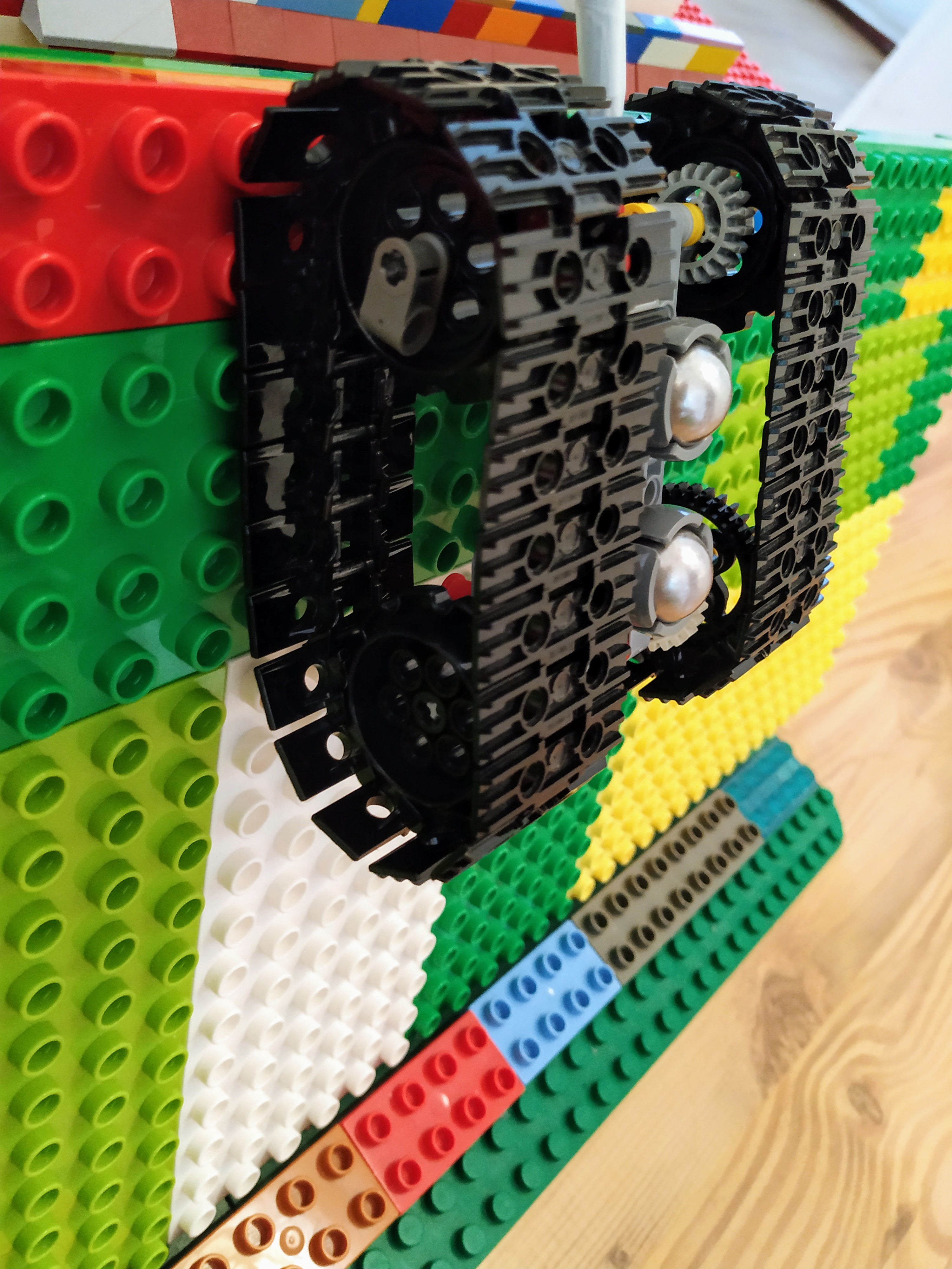1. Obidve konštrukcie sú výborné, to by sa lyžovalo na takej zjazdovke. 2. V Druhom riešení, lano ťahá do stany ratrak dosť nárazovo, čo by reálne mohlo stroj prevrátiť. Inak super. 3. Krásna zelená snežná plocha :) Trochu ste to poňali v prvom videu naopak, že ratrak spúšťa iba pásy. Asi by to bolo aj ok, keby sa tie pásy točili... Zato plocha bola prejdená celá. Super. Druhá verzia má tiež svoje chybičky krásy a mierne problémy s otáčaním, ale snaha sa cení. 4. Páči sa mi, že ste originálne. Tá myšlienka má niečo do seba. Otázne je, nakoľko je tých bežných 13 ton, ktoré máva ratrak, keď je to kompletný autonómny stroj, potrebných na poriadne utlačenie snehu a či by len takéto zavesené pásy stačili. Ale ani také pásy (a ratrak už vôbec) nie je možné len tak na mieste posunúť do ďalšej stopy a preto by som odporučil, aby sa ten horný ťahač posúval nie vtedy, keď je ratrak hore, ale vtedy, keď je dole. V tom druhom riešení však nerozumiem aký má zmysel, aby tam boli dve EV3 a komunikovali správami, logiku by to malo, keby jedna z nich bola fyzicky oddelená - čiže na tých pásoch. Tiež by sa tam potom dali využiť senzory. Ale celkovo sa aj tak teším.