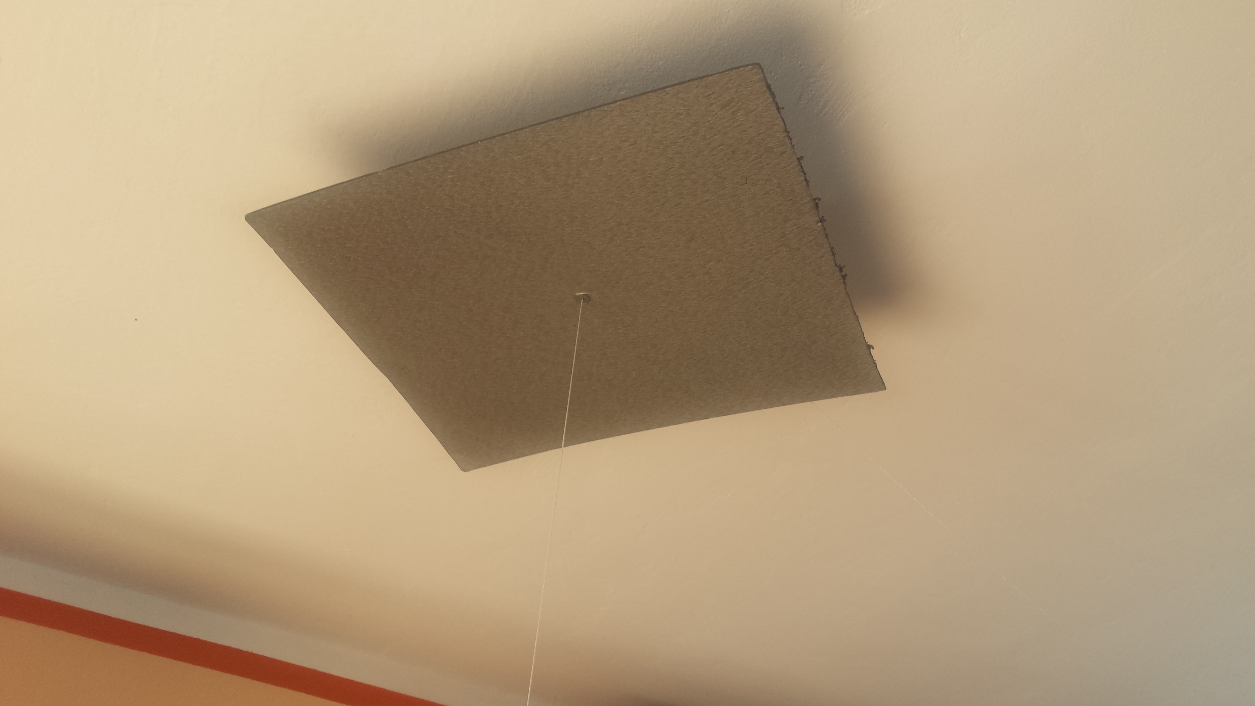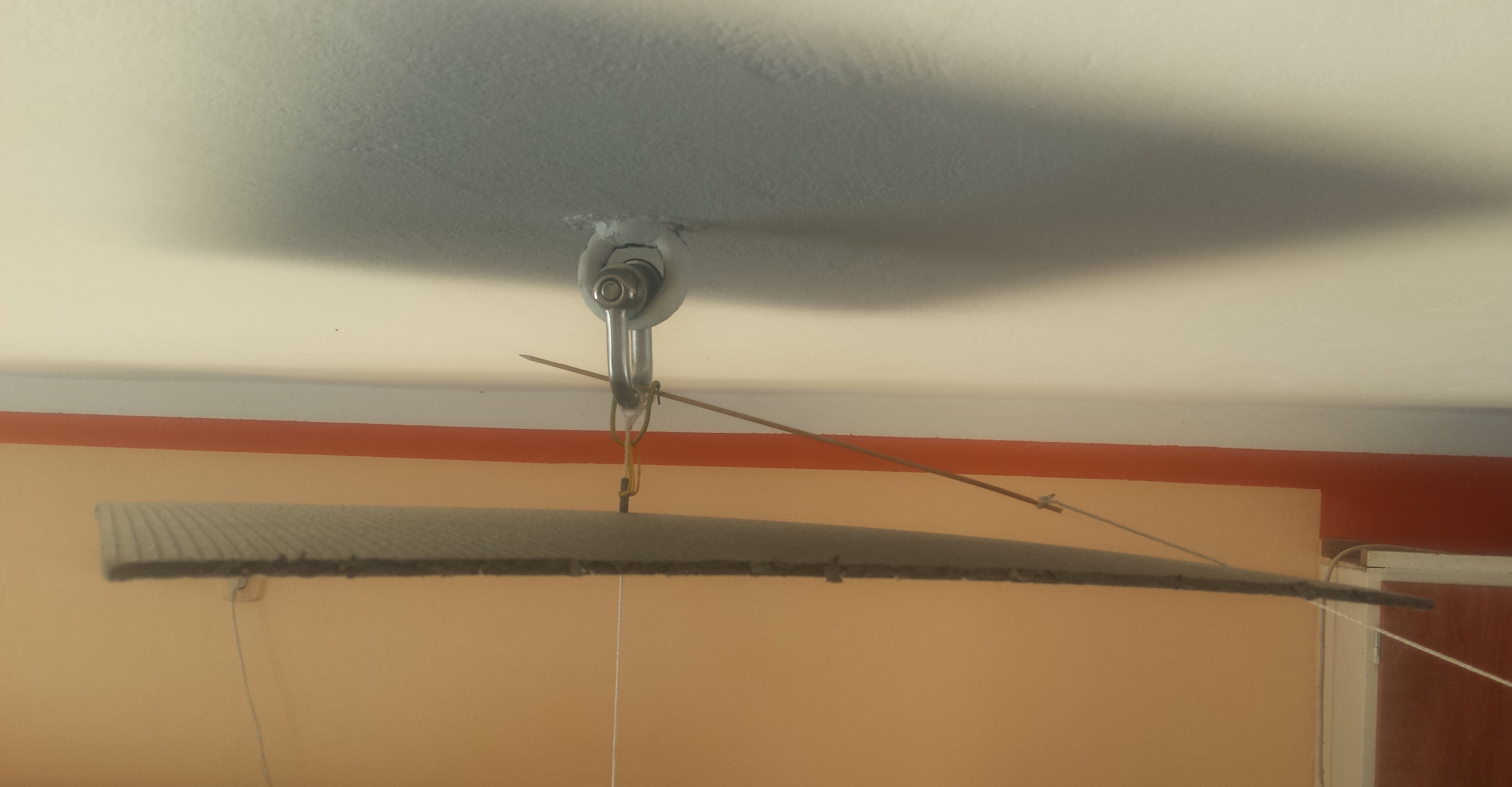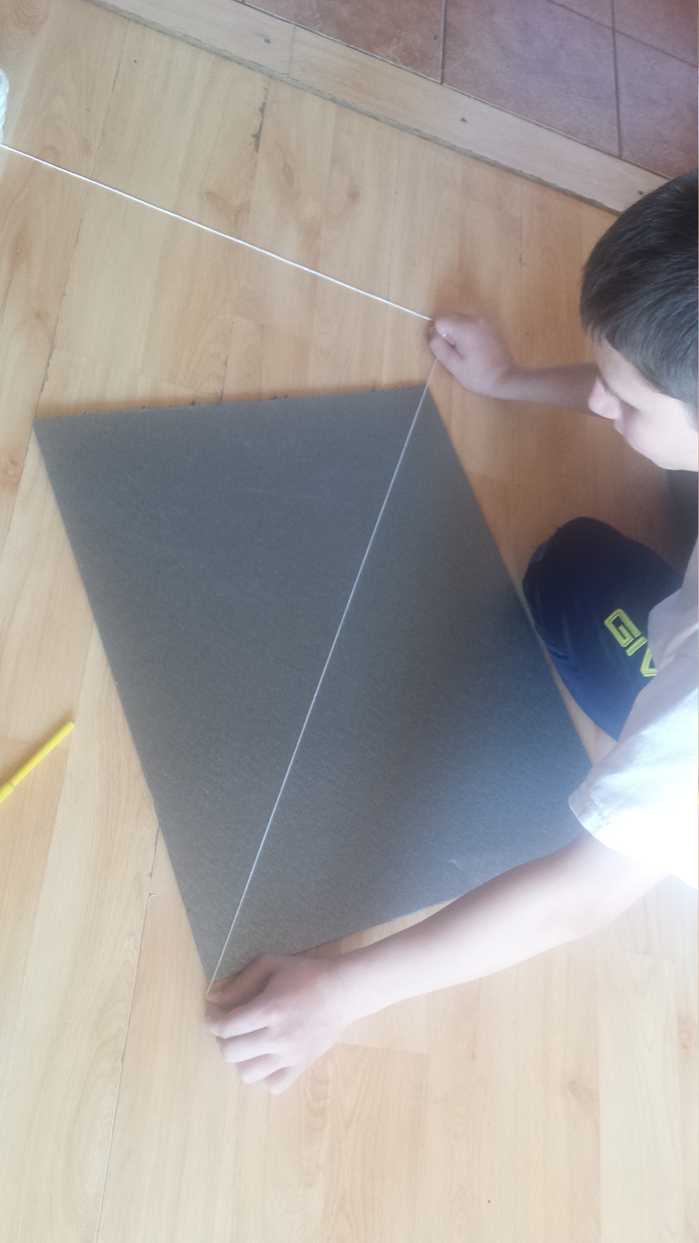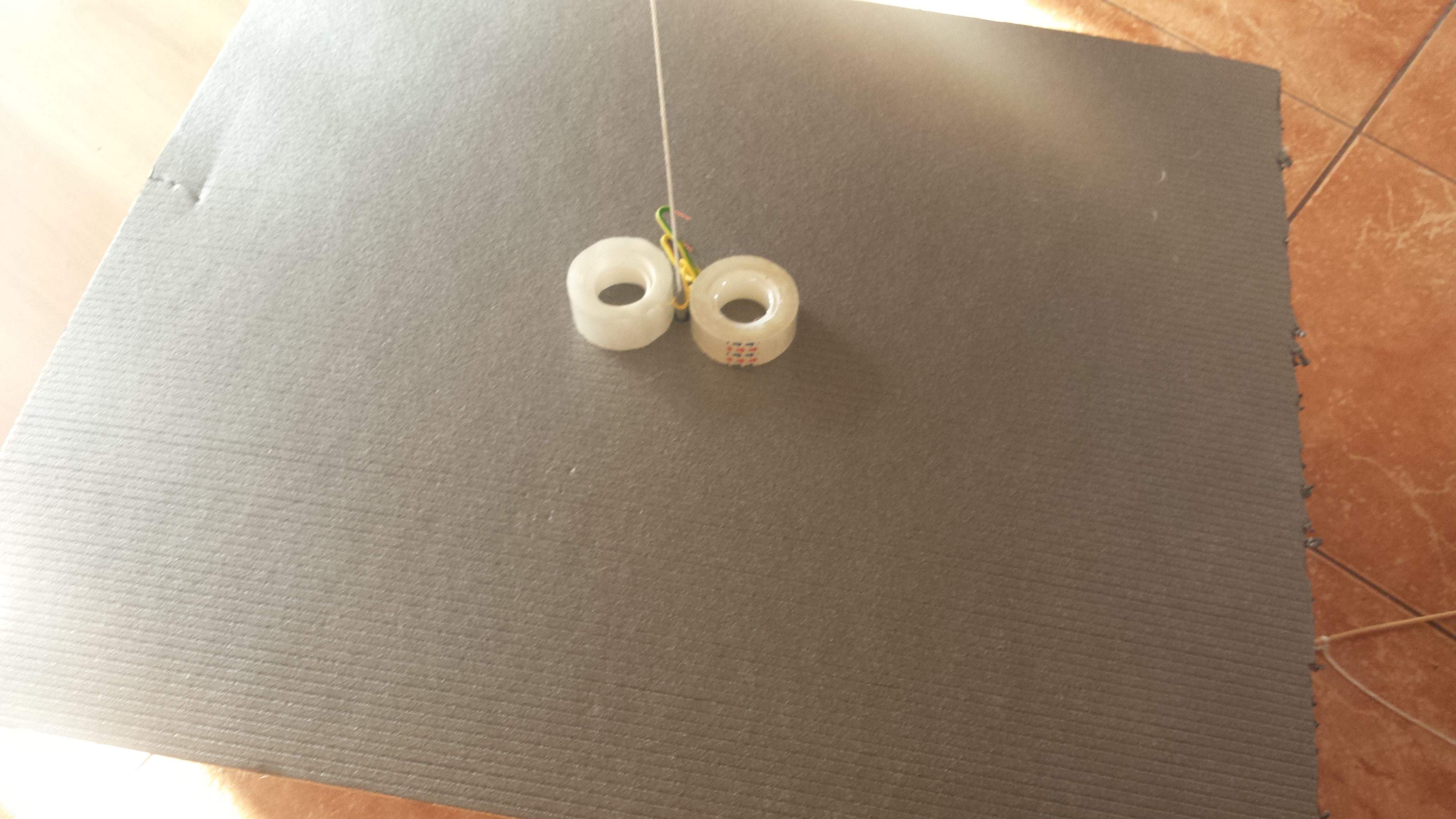 Najprv sme si vytlačili na 3D tlačiarni vodiaci tŕň. Nakreslil som ho v Inventore Lt. Potom som našiel stred polystyrénovej dosky a tam som ho napichol a prilepil. Potom sme v kuchyni zvesili hojdačku a zavesili špagát, po ktorom mohola behať polystyrénoá doska. (bez špagátu doska lietala všelikade. Aby doska čakala hore, tak mala na gumičke priviazaný obojstranný háčik, ktorý visel na špajdli. Najprv sme spustili meranie na robotovi, a keď kocka odpočítala, tak sme špajdlu vytrhli a doska začala padať dolu. Potom sme namerané hodnoty vyhodnotili. A merali sme aj tak, že sme dosku priťažili dvomi kotúčkmi pásky.