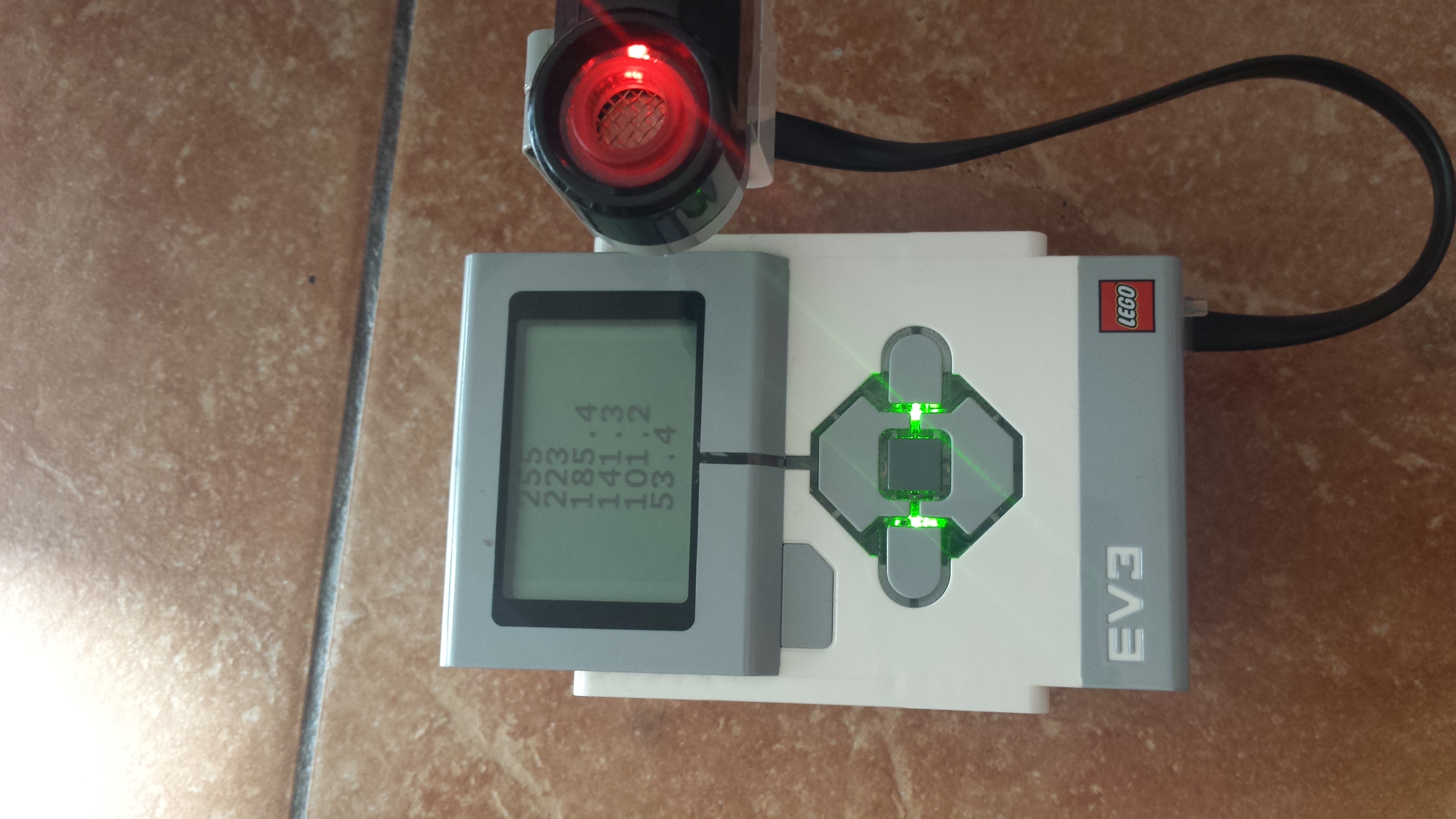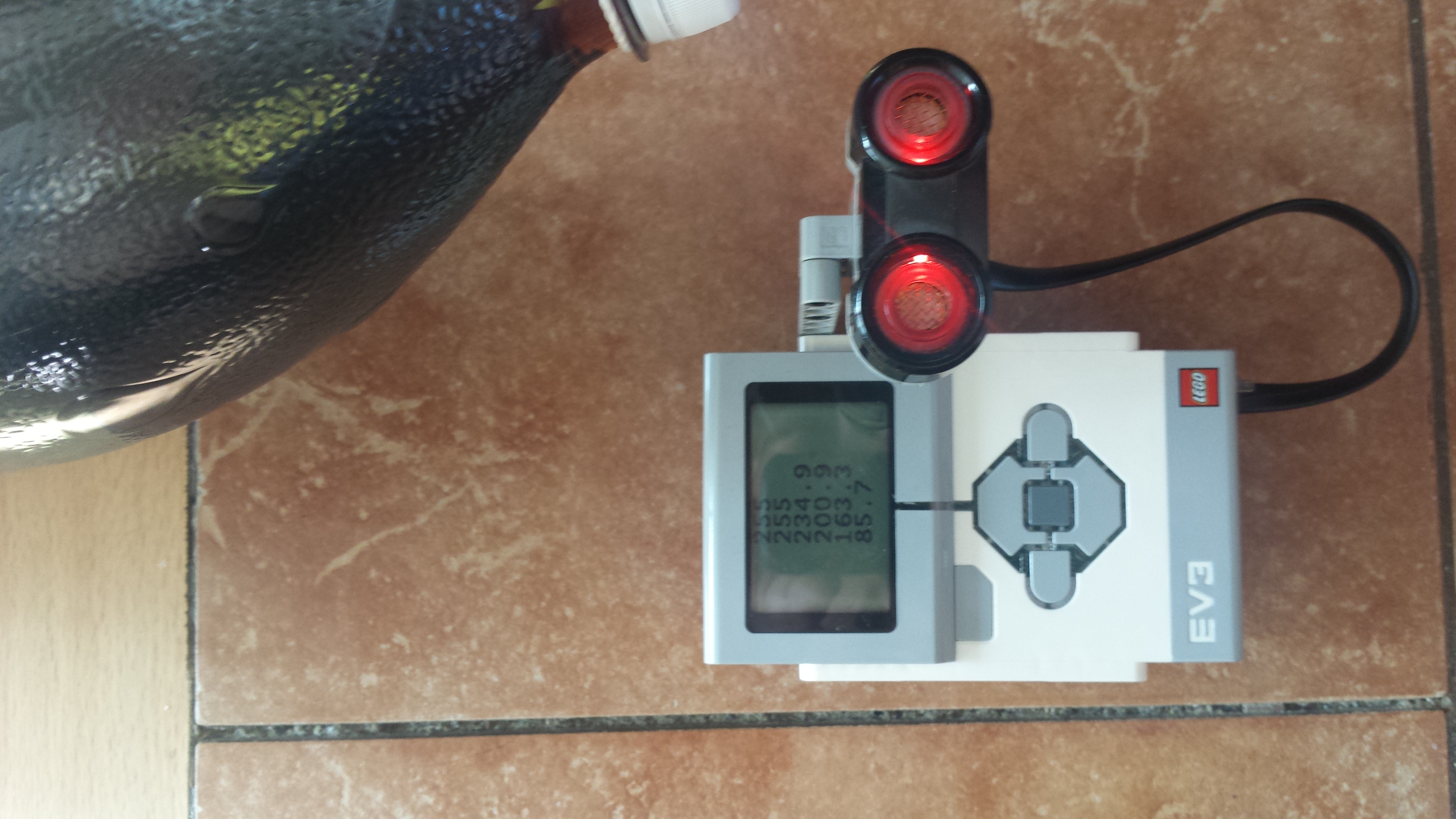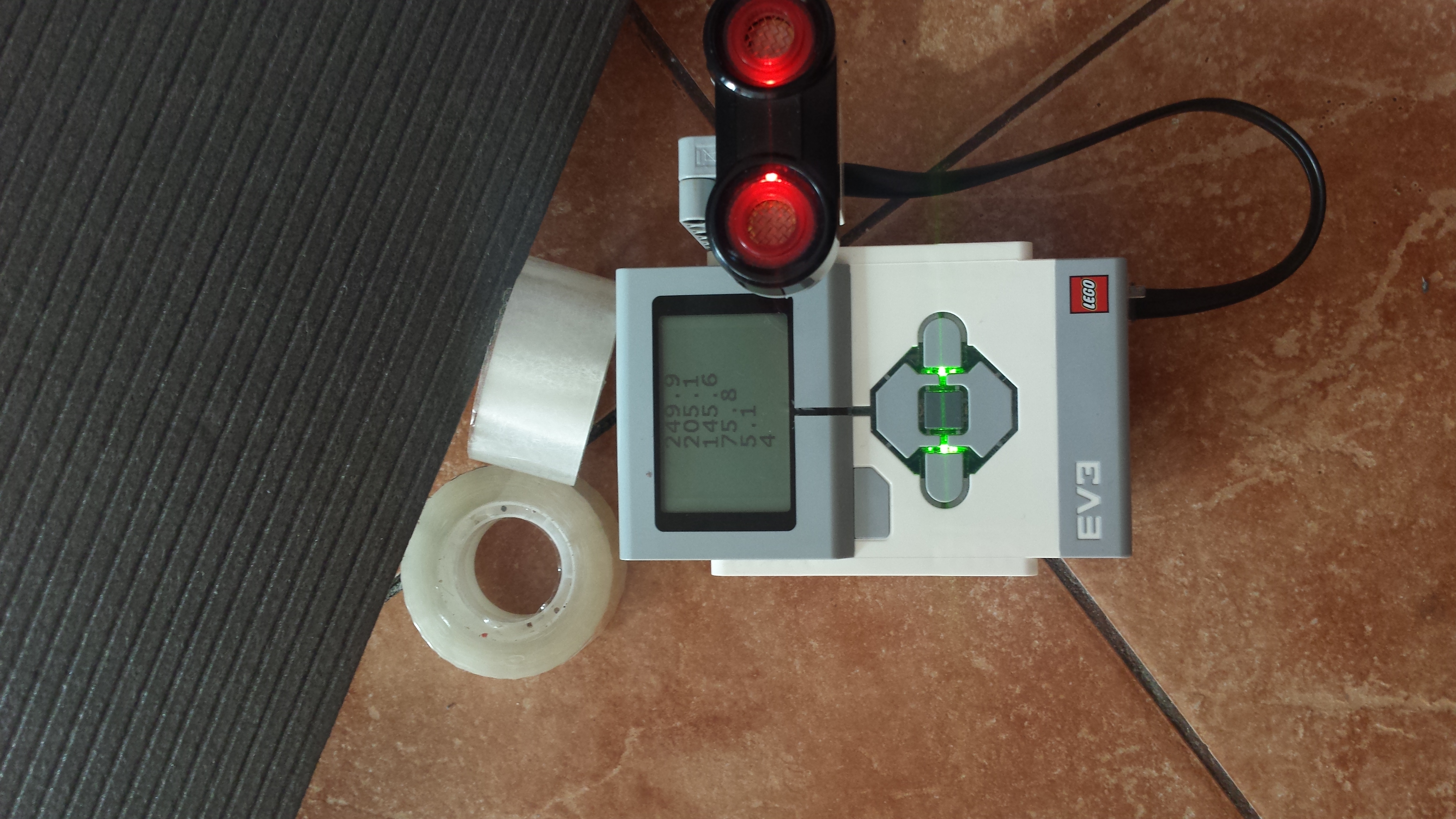 Robot: skladá sa z jednej kocky EV3, jedného USG senzora namerovaného nahor, jedného rovného dieliku, 4ks pinov a spojovacieho káblika.