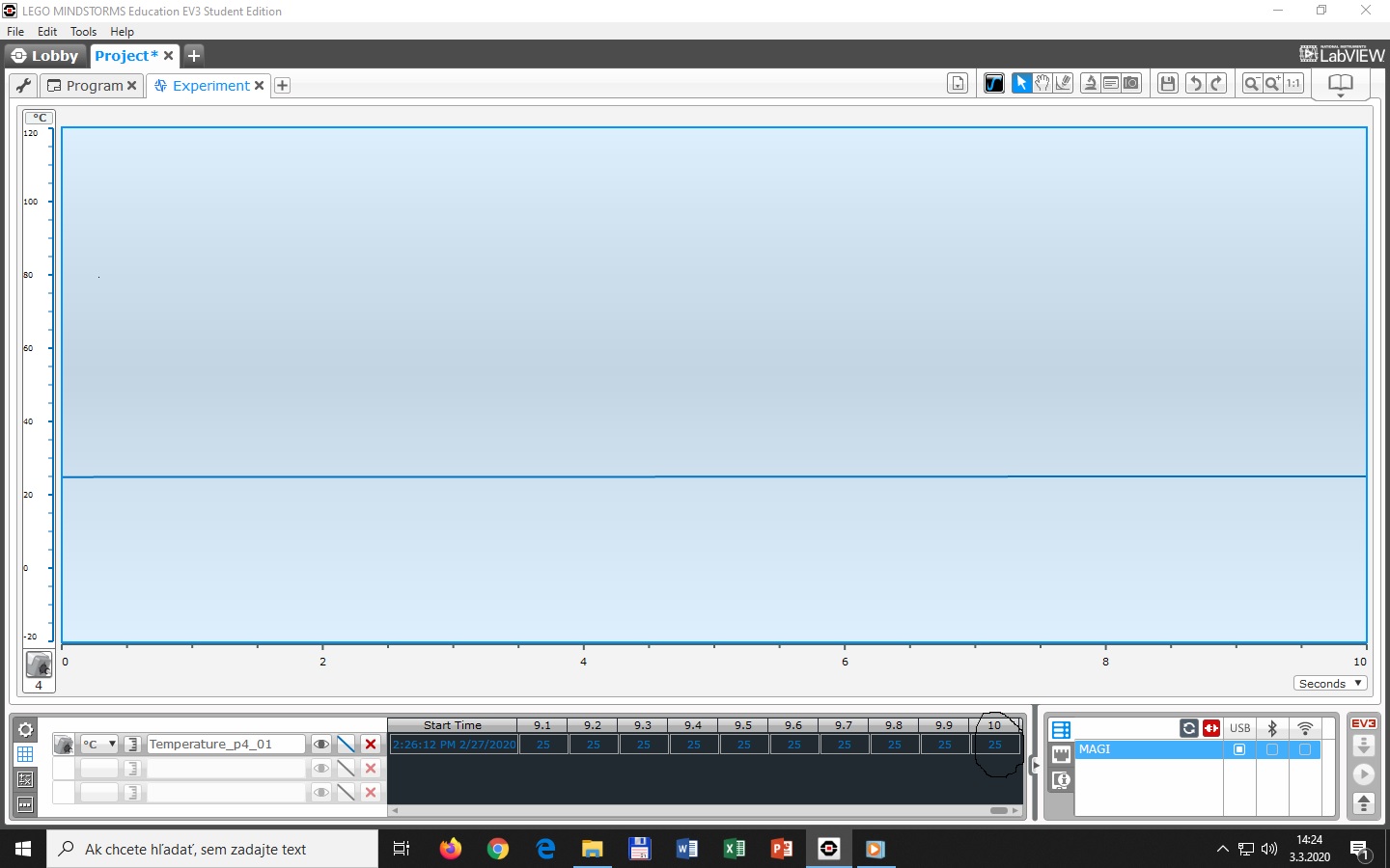 Program je veľmi prostý. Otvorili sme si nový experiment a dali sme „creat data logging program“. Čo nám otvorilo v programe „dl_experiment“ „my data“. Po ukončení merania sme išli zasa do experimentu a dali sme „data log file manager“, v ktorom sme našli namerané hodnoty.
