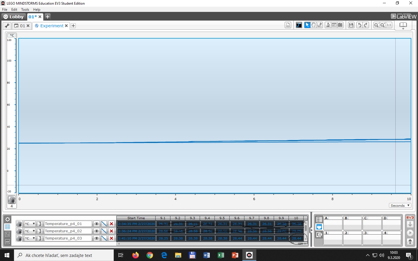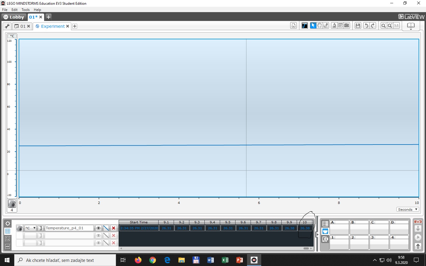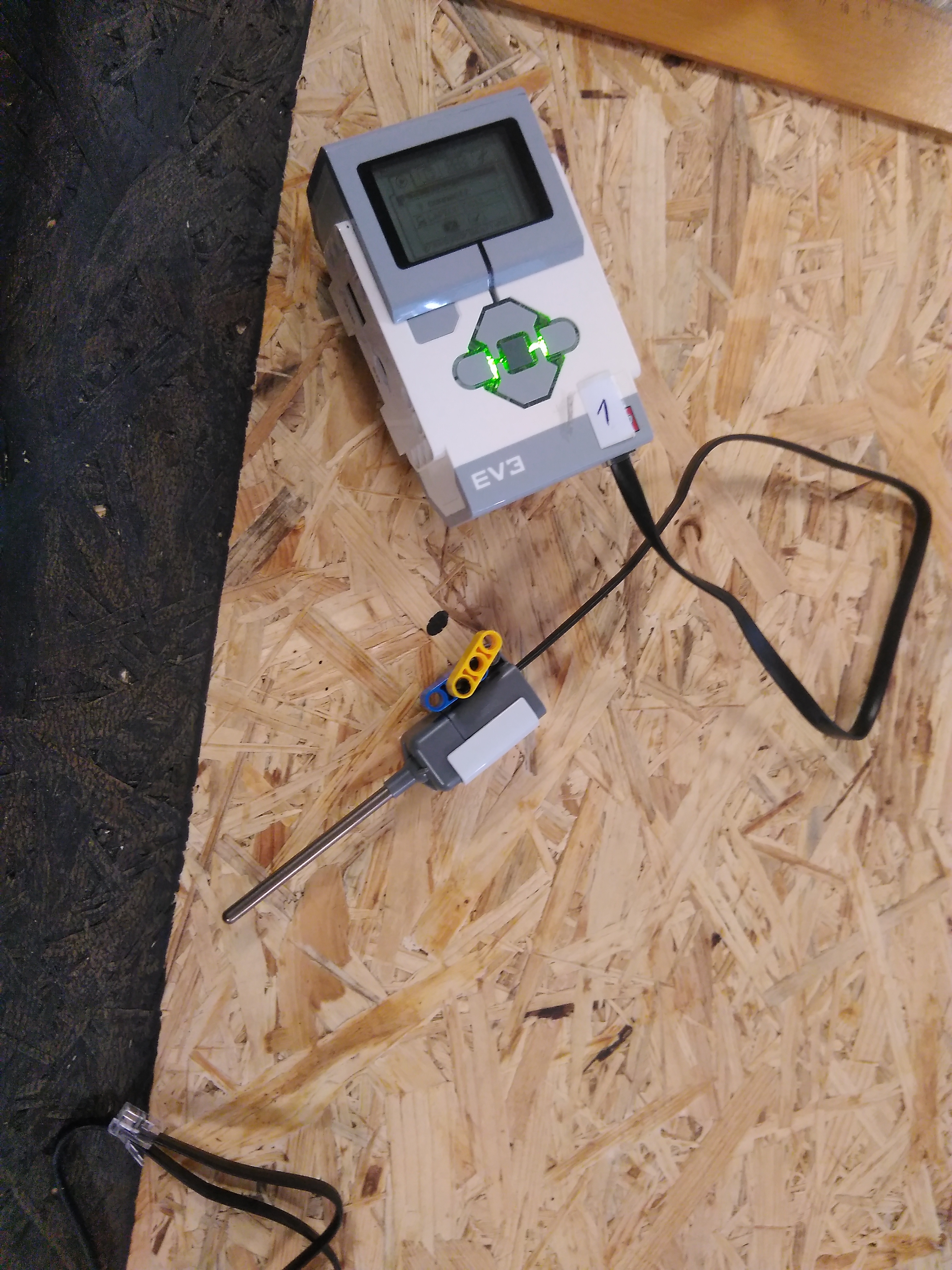 Ďalej sme použili programovaciu kocku a tepelný senzor ktorý bol pripojený do programovacej kocky.
