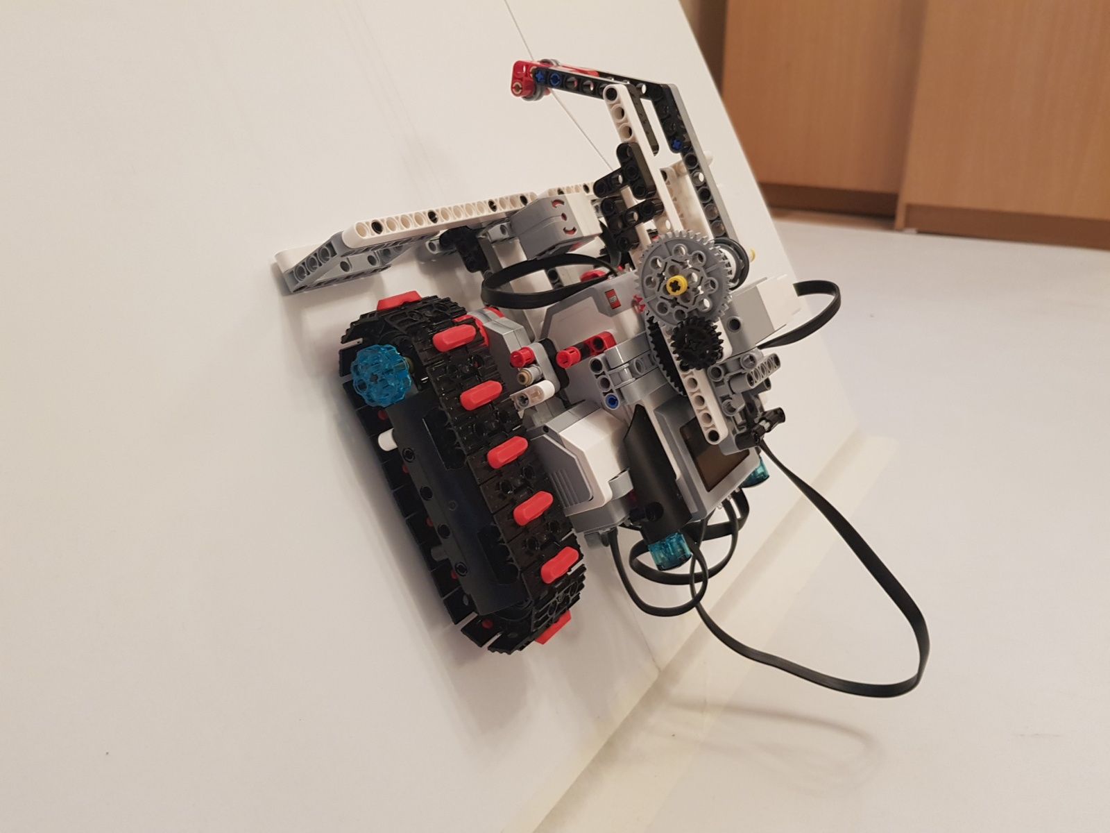 Svah so sklonom 60° po ktorom sa robot pohybuje je vytvorený z dvoch poličiek so šírkou 40 cm a dĺžkou 80 cm. Ratrak sme vytvorili úpravou základného modelu Tank Bot, na ktorý sme umiestnili navijak na otočnom ramene. Navijak je dostatočne silný na zdvihnutie celého robota. Koniec lanka je upevnený na tyčke rovnobežne so svahom. Na svahu so sklonom 60° otáčanie robota nebolo presné, lebo pásy sa veľmi šmýkali - ratrak skôr visel na lane ako stál na svahu.