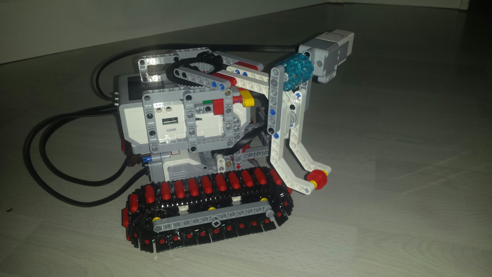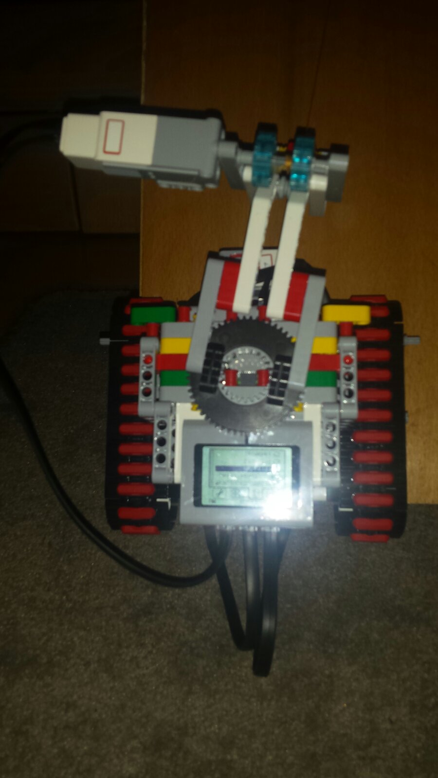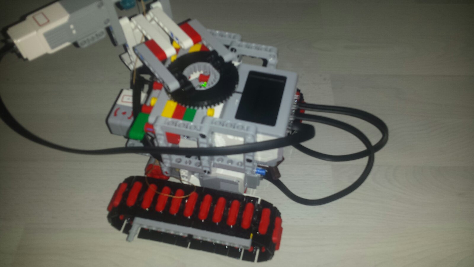 Vyrobil som si 2 vlastne bloky, ktoré som nazval posun a zvislo. Zvislo je, že ratrak ide hore a posun sa skladá z otočenia o 90°doprava, 1 otáčku dopredu a potom sa otoči o 90°vľavo. Potom ide dole.