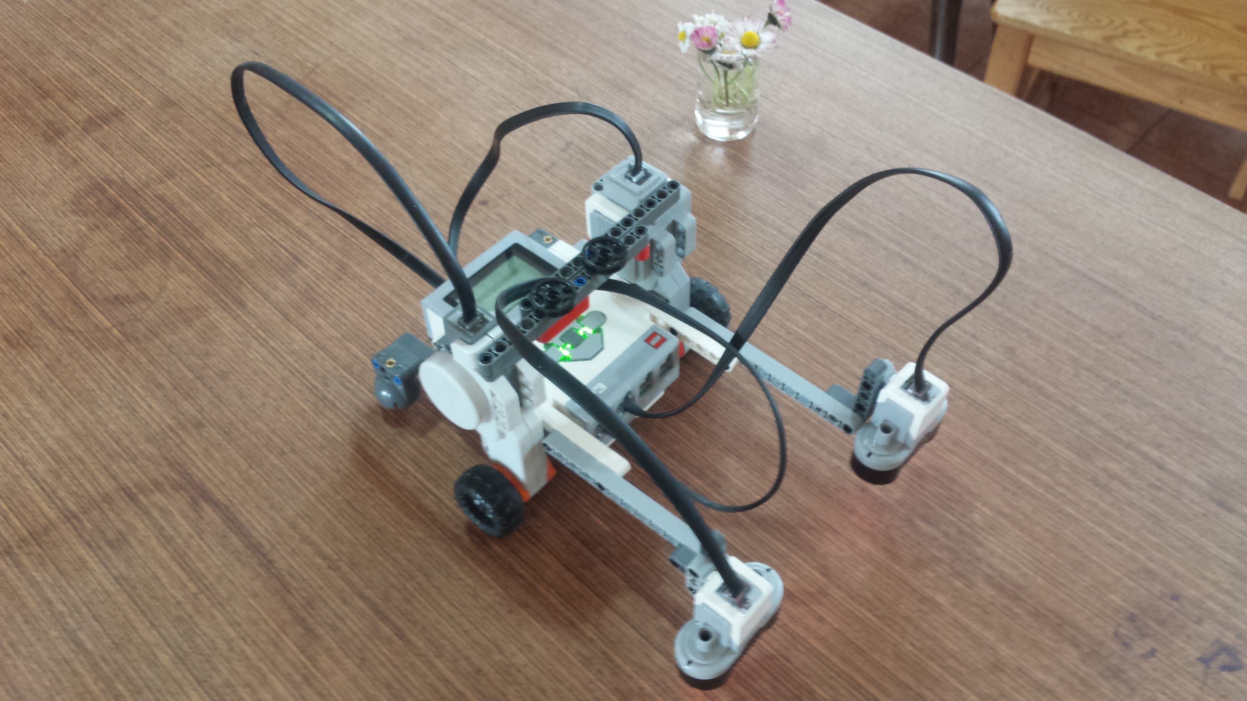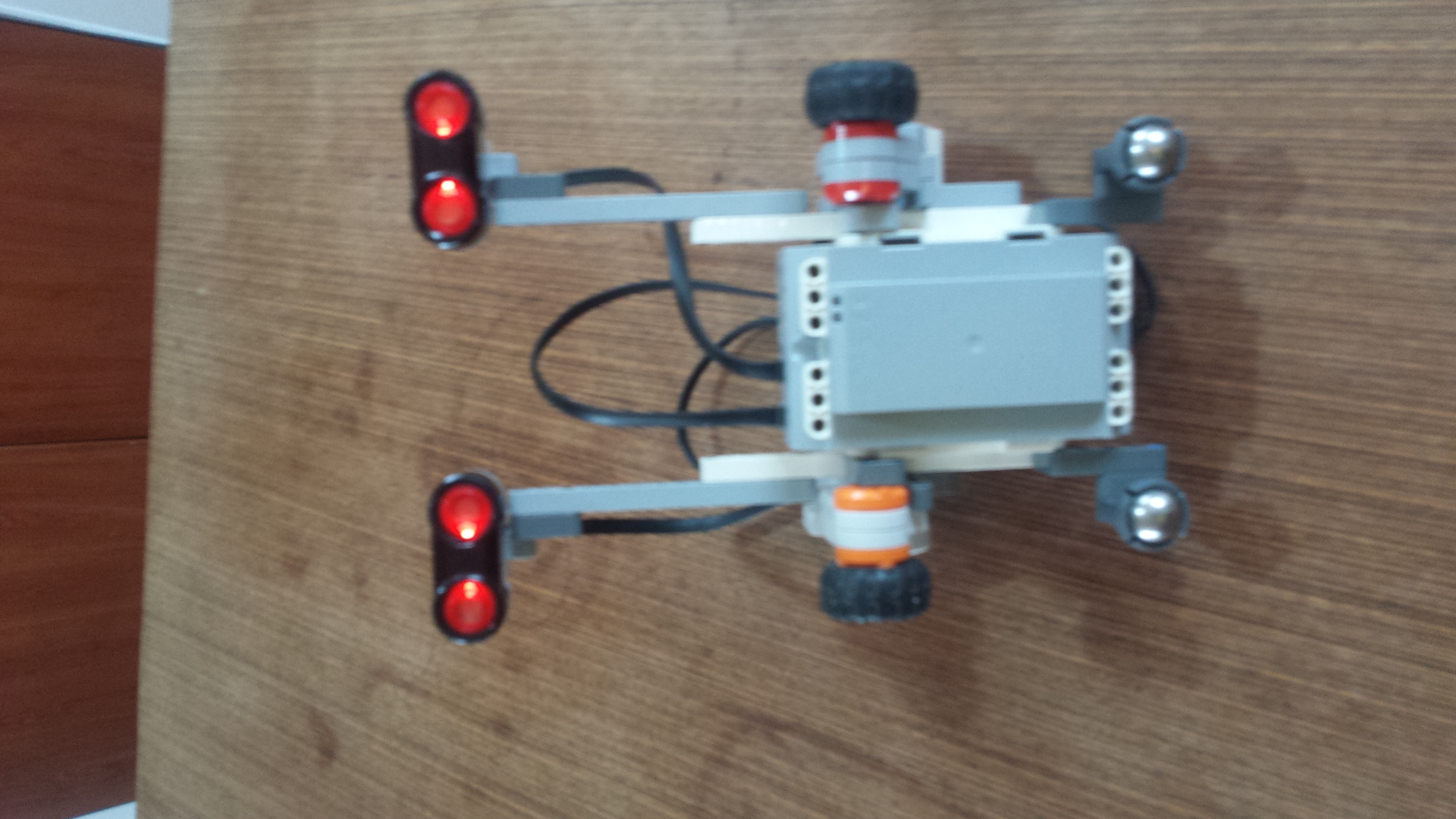 náš robot sa skladá z dvoch USG senzorov, kocky EV3 a z dvoch motorov. jeden veľký NXT a jeden veľký EV3, lebo ostatné sú v škole. (kolesá sme si museli požičať z domáceho lega, lebo to sme už naozaj nevedeli inak vymyslieť.)