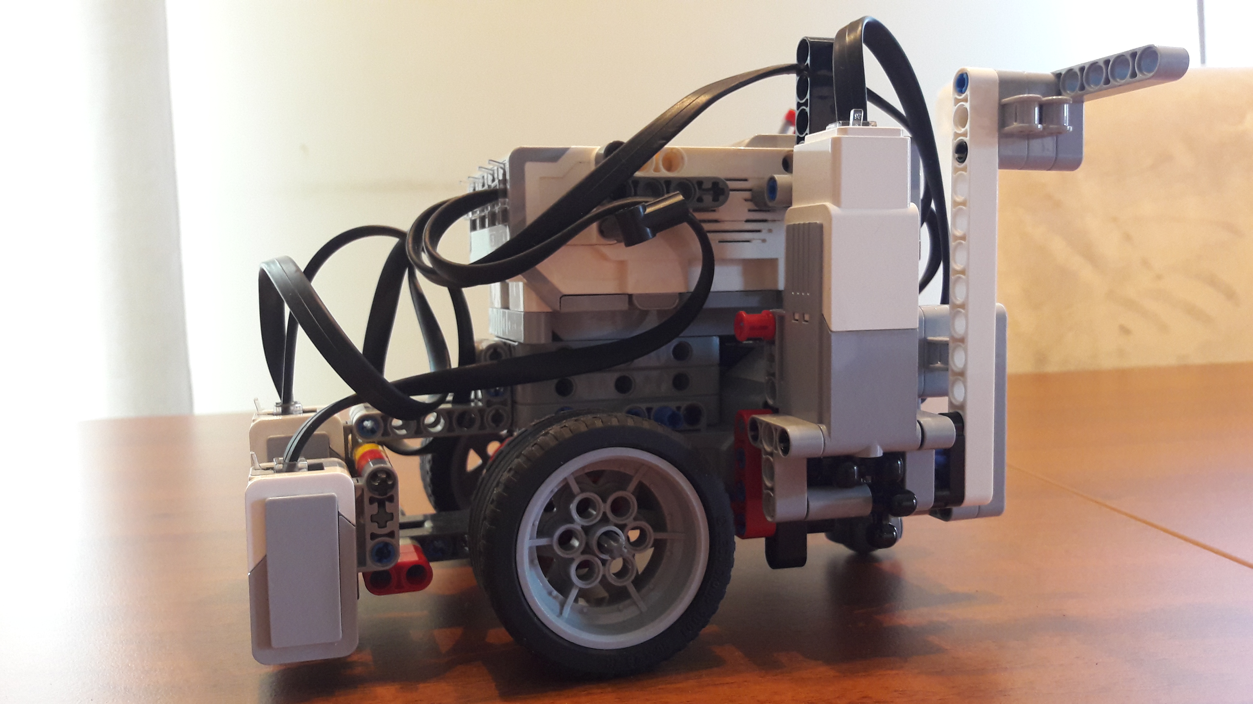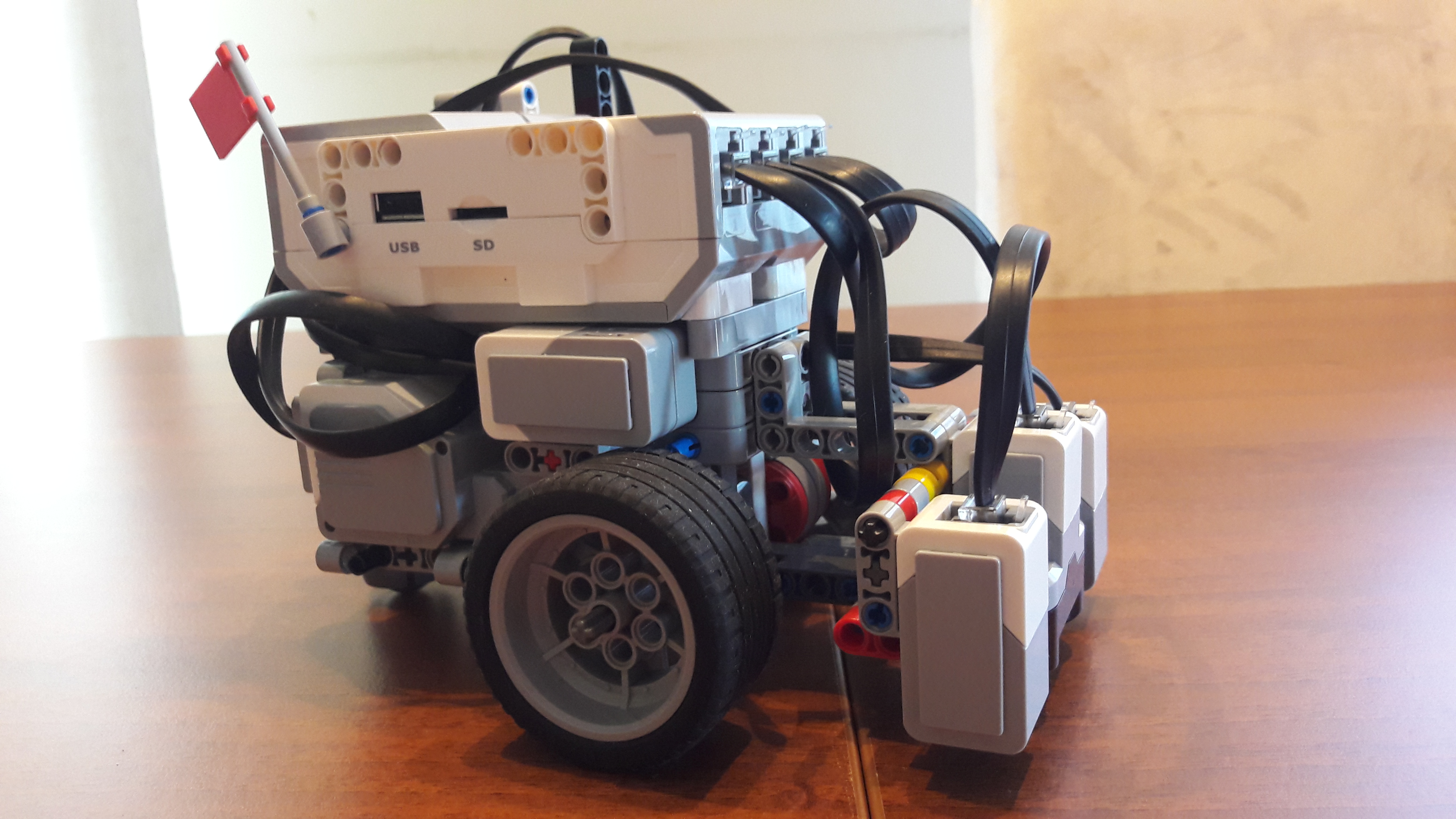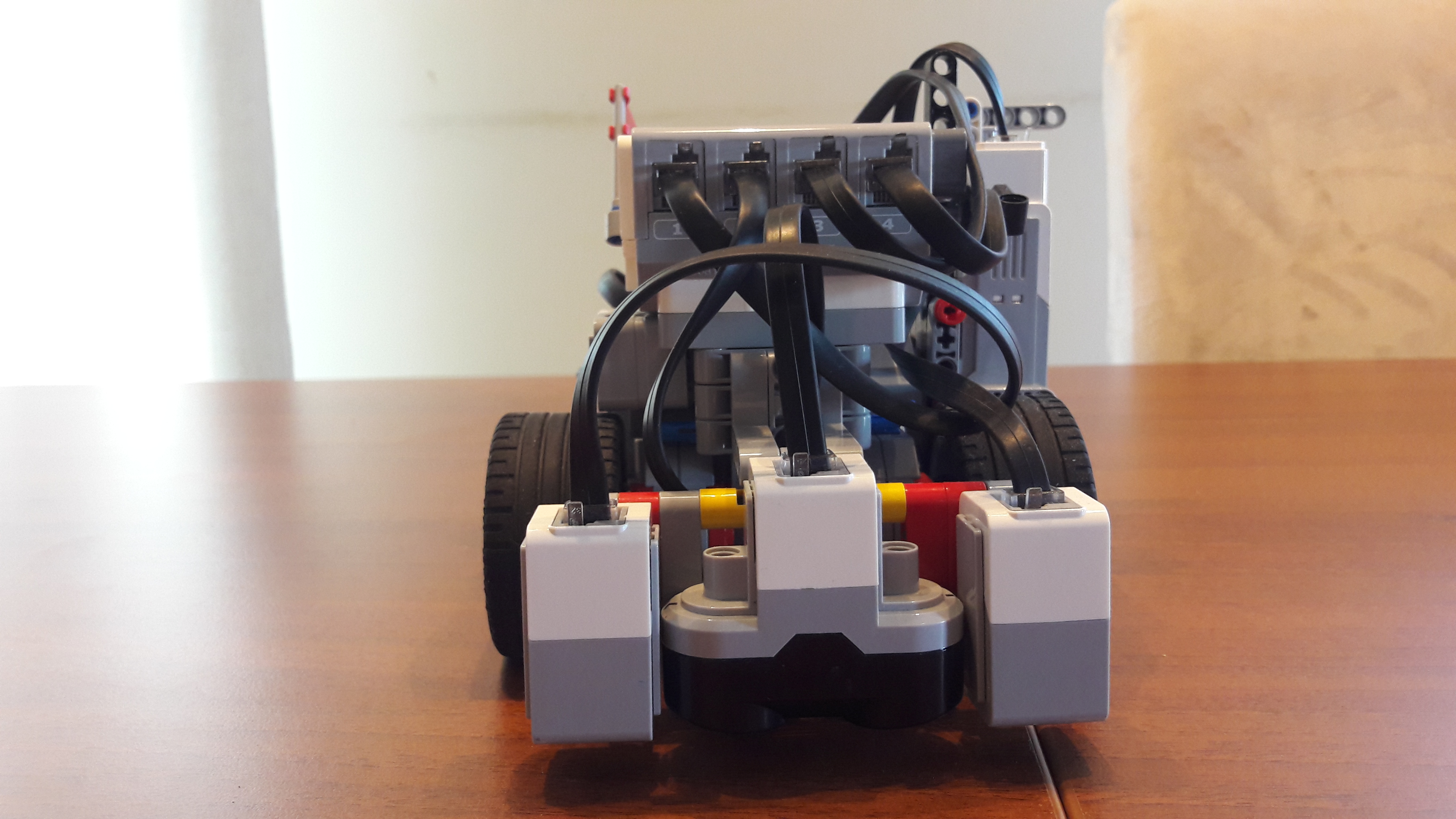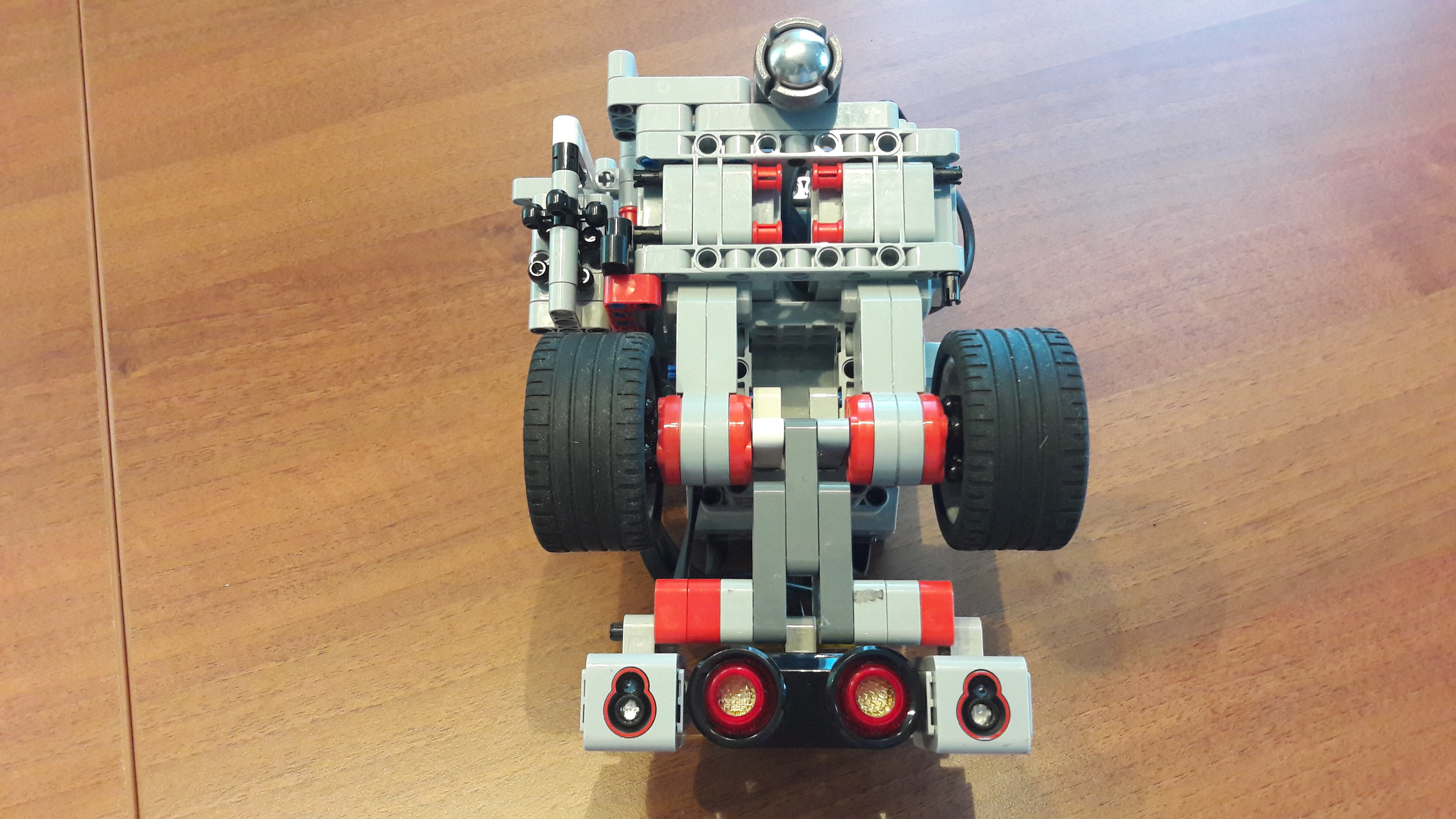 4. Vyresetuje otáčky motorov a so zníženou rýchlosťou ide dopredu až kým nezaznamená kraj stola. Teraz má hodnotu, ktorá znamená, že na to aby robot prešiel dĺžku rozmeru (ešte nevieme či zmeral hĺbku alebo šírku), musí spraviť toľko otáčok. Túto hodnotu vynásobíme obvodom kolesa, lebo 1 otáčka motora = prejdená vzdialenosť o veľkosti obvodu kolesa. Teraz vieme akú vzdialenosť prešiel, ale ešte musíme k tomu pripočítať dĺžku robota. Výsledok skrátime na 1 desatiné miesto a máme dĺžku 1 rozmeru.