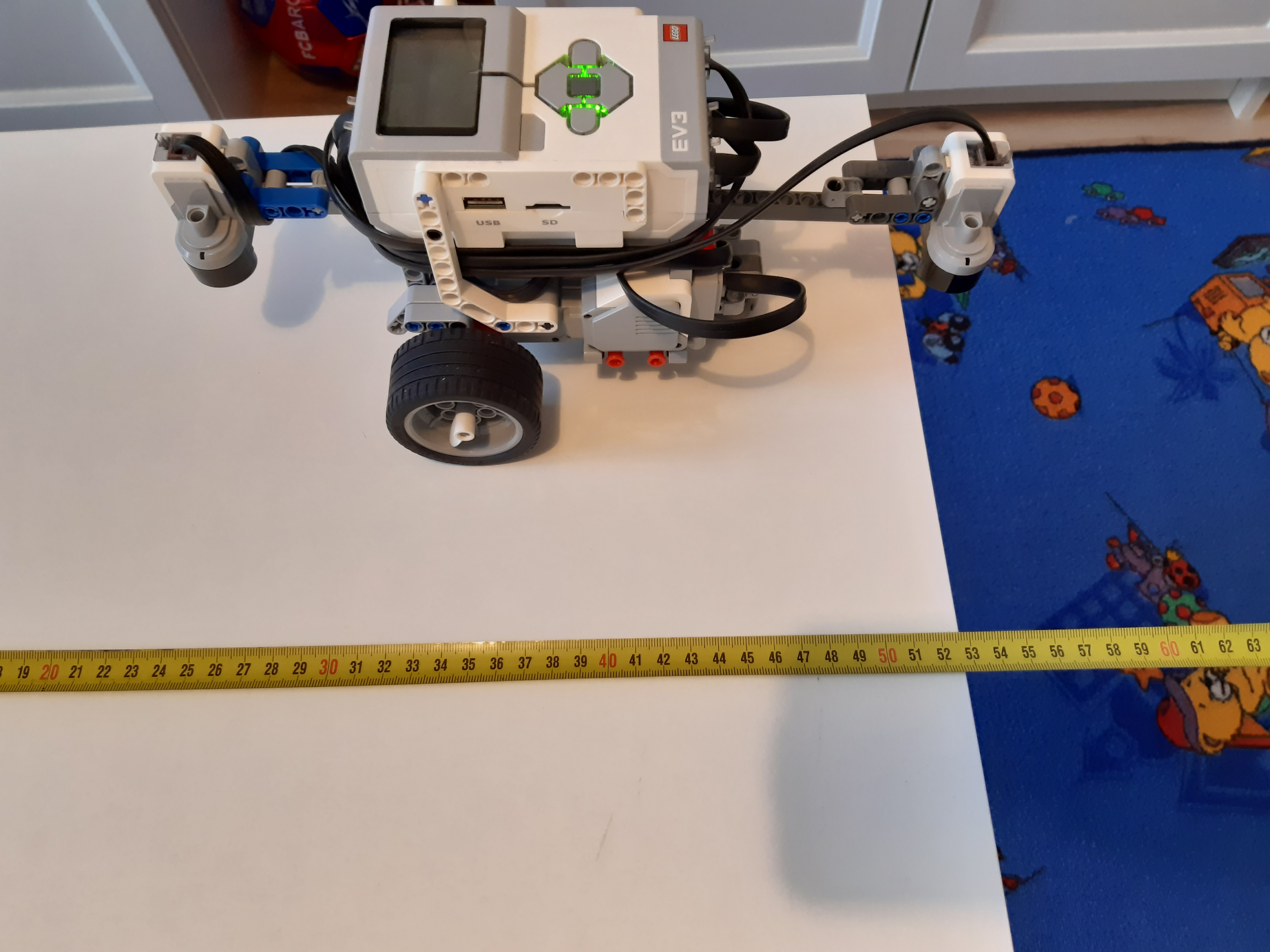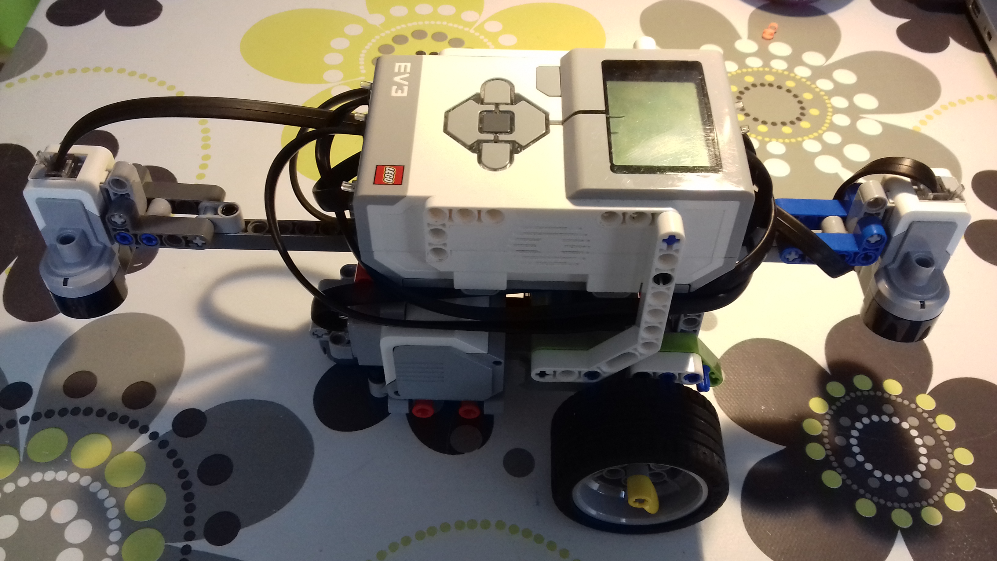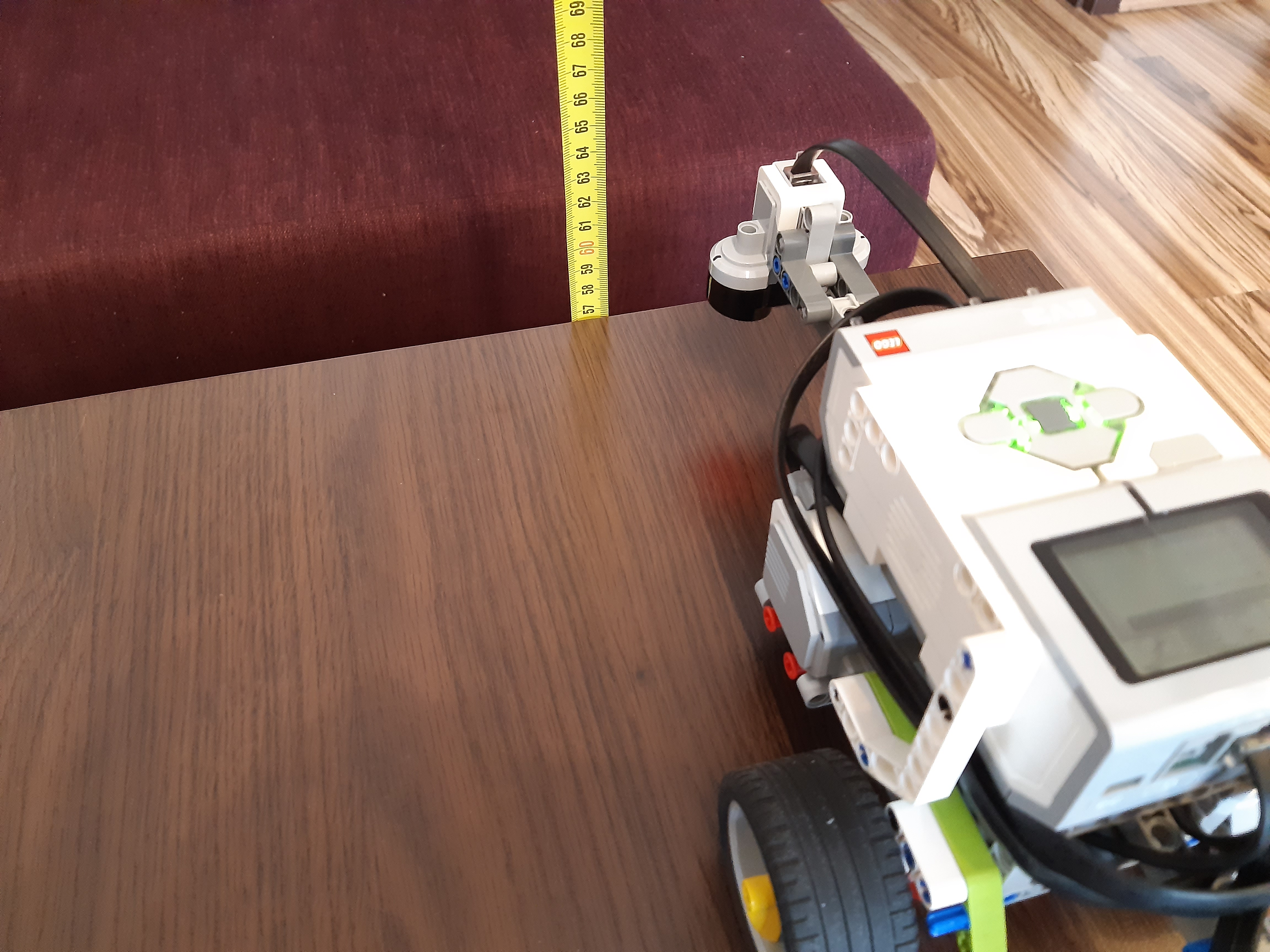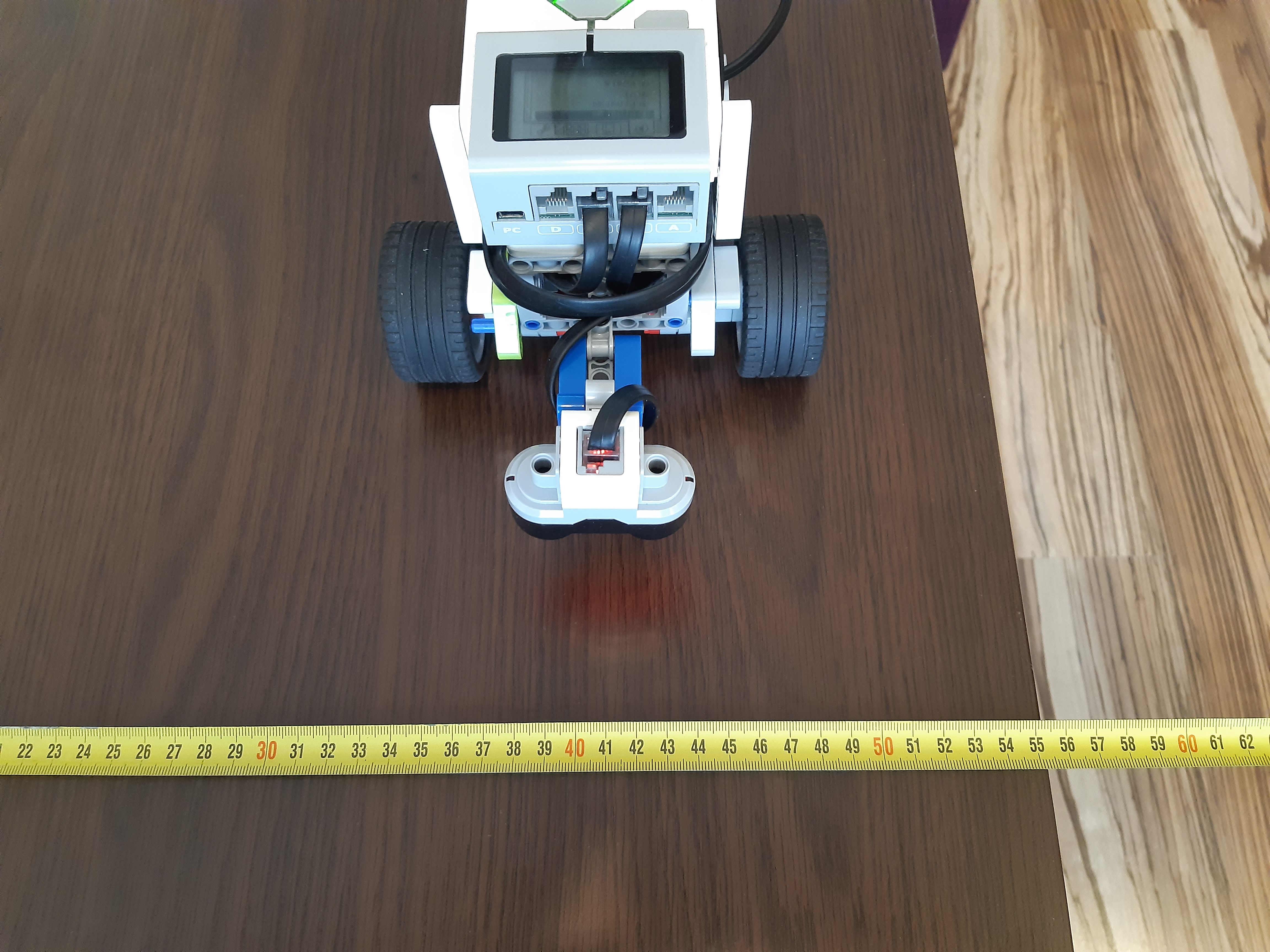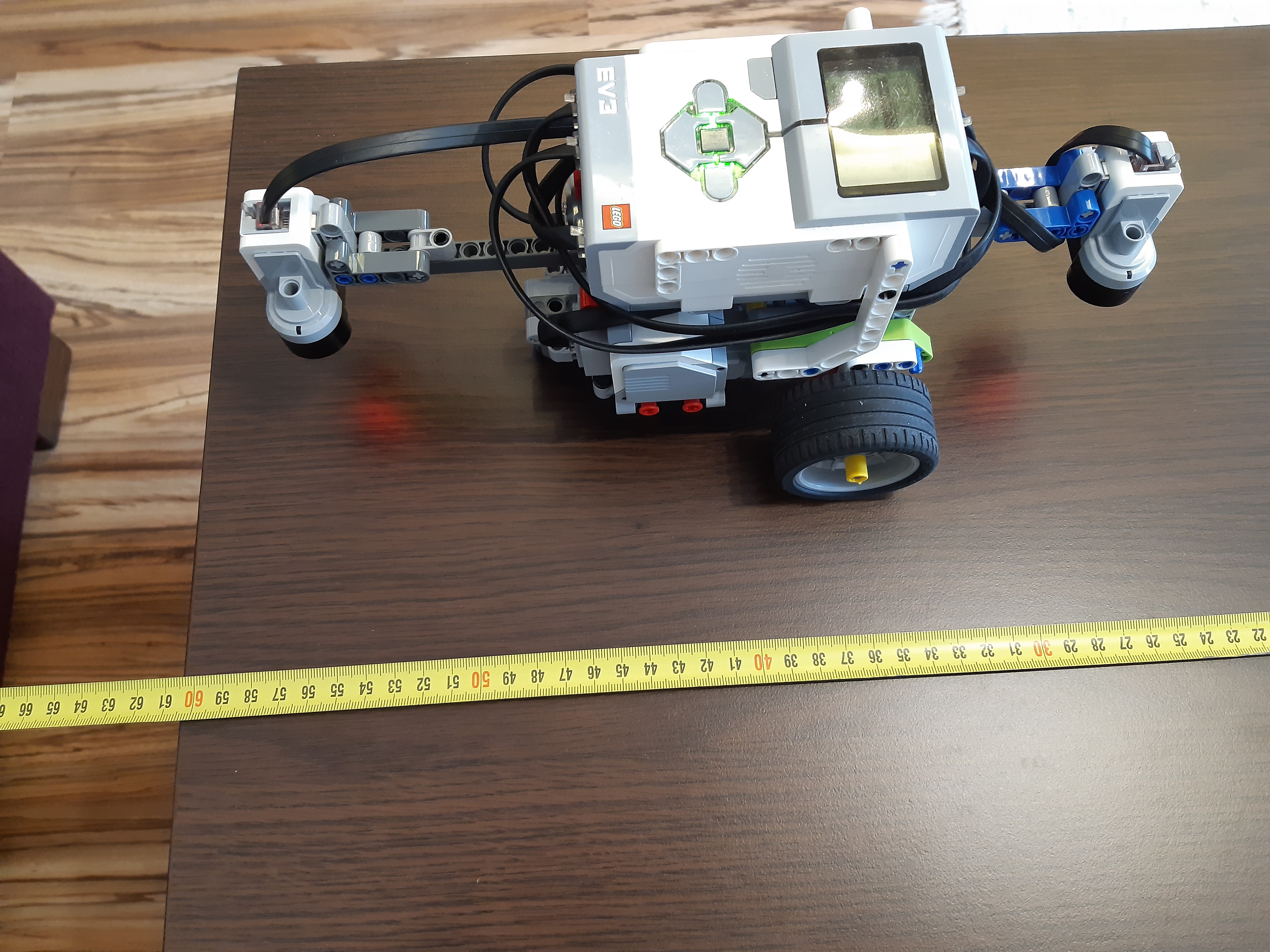 POPIS ROBOTA: robot je základná verzia s dvomi large motormi pre všesmerový pohyb vzadu s guličkou. Na osi medzi kolesami je umiestnený gyroskopický senzor na otáčanie. Na obidvoch koncoch: vpredu, aj vzadu sú umiestnené ultrazvukové senzory. Sú pripevnené na vysunutých ramenách, aby bola zabezpečená určitá vzdialenosť a robot nespadol zo stola. Vysunutie je dobré aj kvôli odrazom v spodnej časti stola.