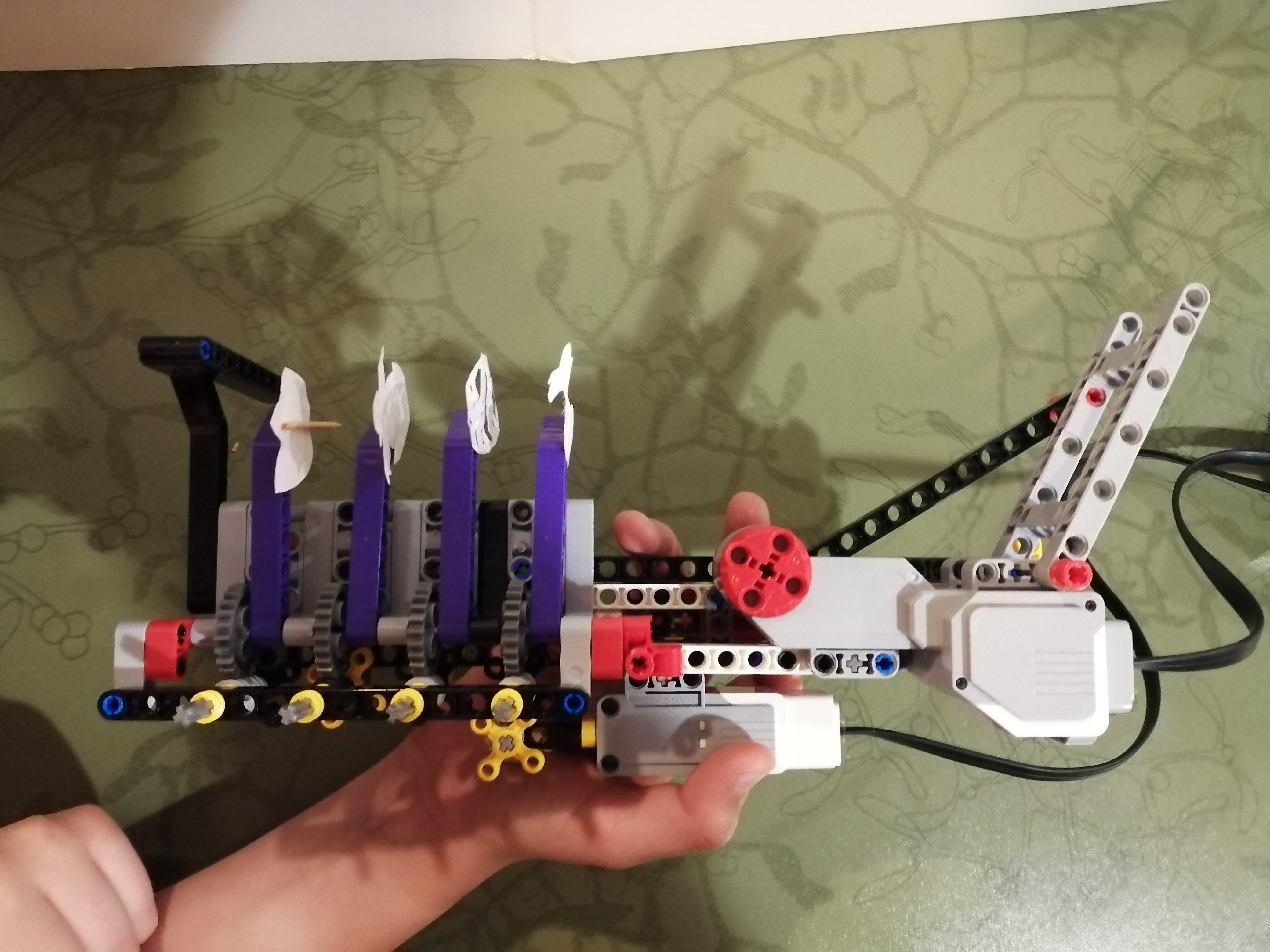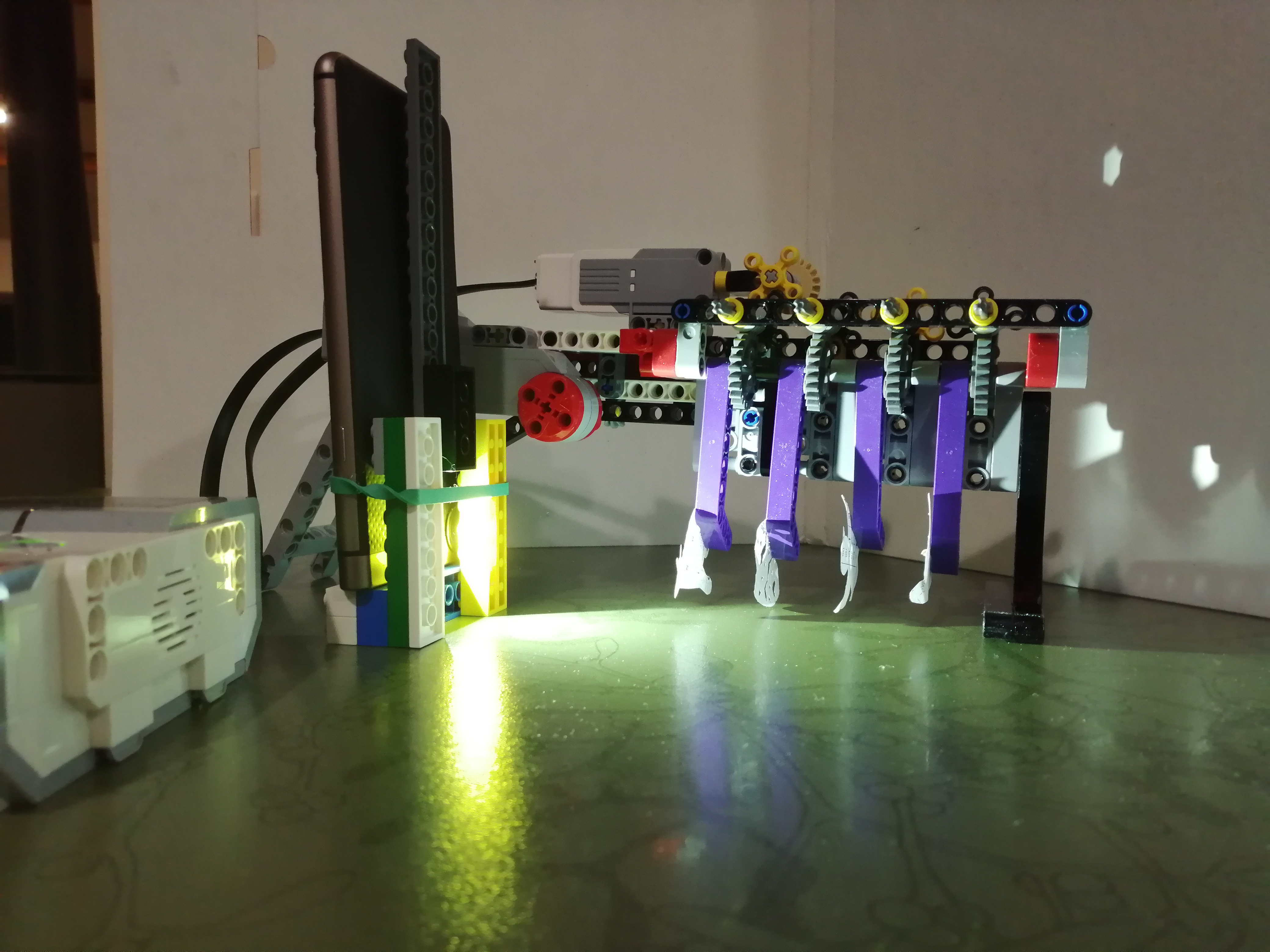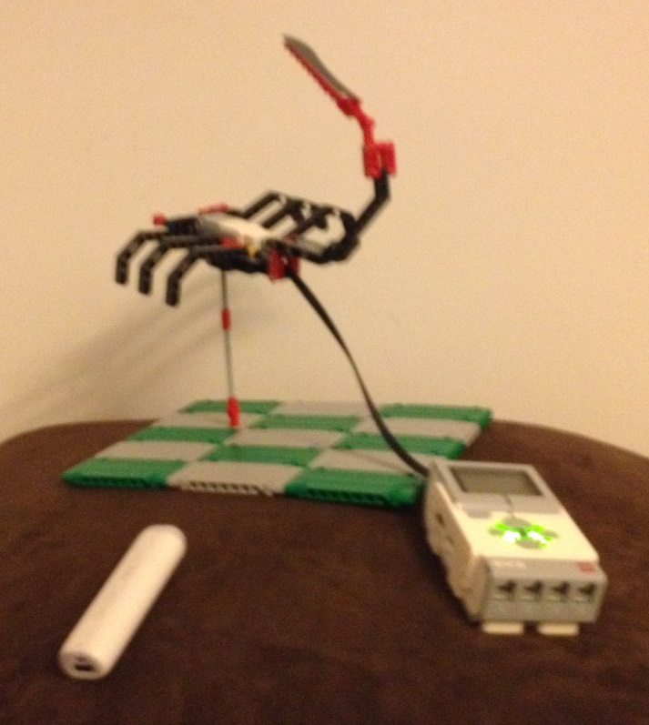 Ja som poskladal z legových súčiastok bábky pre tieňové divadlo: bežiaceho pavúka, tancujúceho raka a útočiaceho škorpióna. Malý motor cez uzubené kolieska pohybuje nohami. Program je jednoduchý, lebo je v ňom iba pohyb motora.