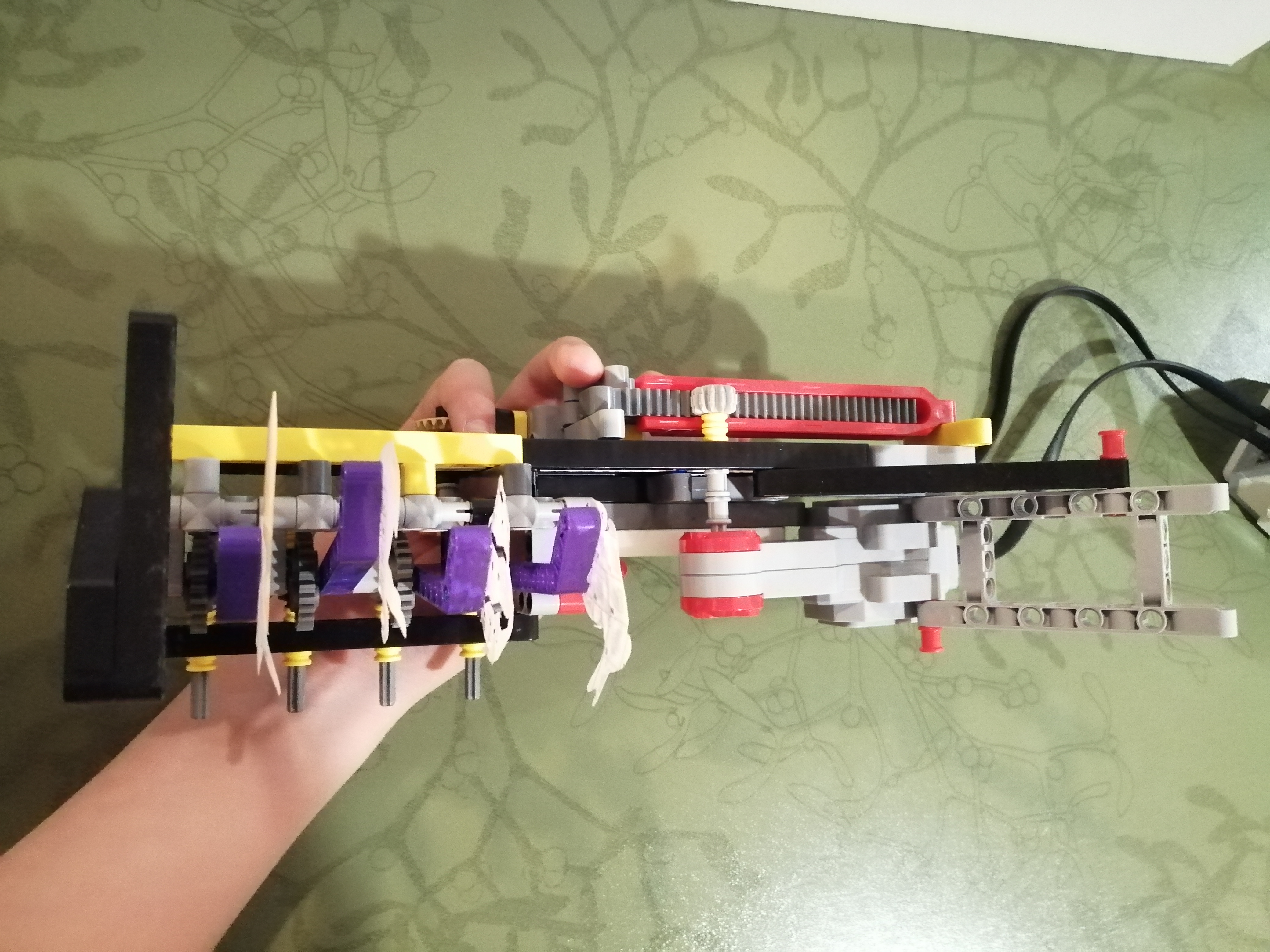Ja som svojho robota postavil ako prevodovku so štyrmi výstupmi. Použil som dva motory: large a medium motor, ktoré sú umiestnené vodorovne nad sebou. Large motor pohybuje malým ozubeným kolieskom po ozubenej koľajnici a tým sa posúva malý motor. Ten zabezpečuje pohyb jednotlivých páčok. Na zdvíhanie páčok som použil ozubené kolieska, ktoré sa dvíhajú každé svojim závitovým šnekom. Malý motor používa na roztočenie X koliesko, ktoré zapadne vždy do X kolieska na konkrétnej páčke.