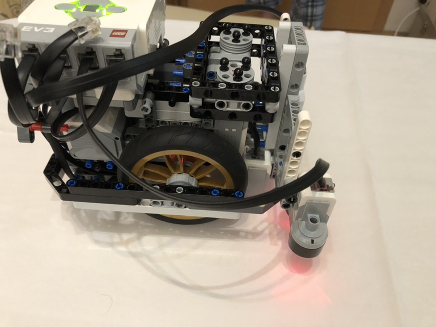 Otáčky motora prepočítame na cm pomocou obvodu kolesa ktorý sme si zmerali. Pripočítame k tomu dĺžku robota po otočení od ultrazvukových senzorov po kraj stola.
