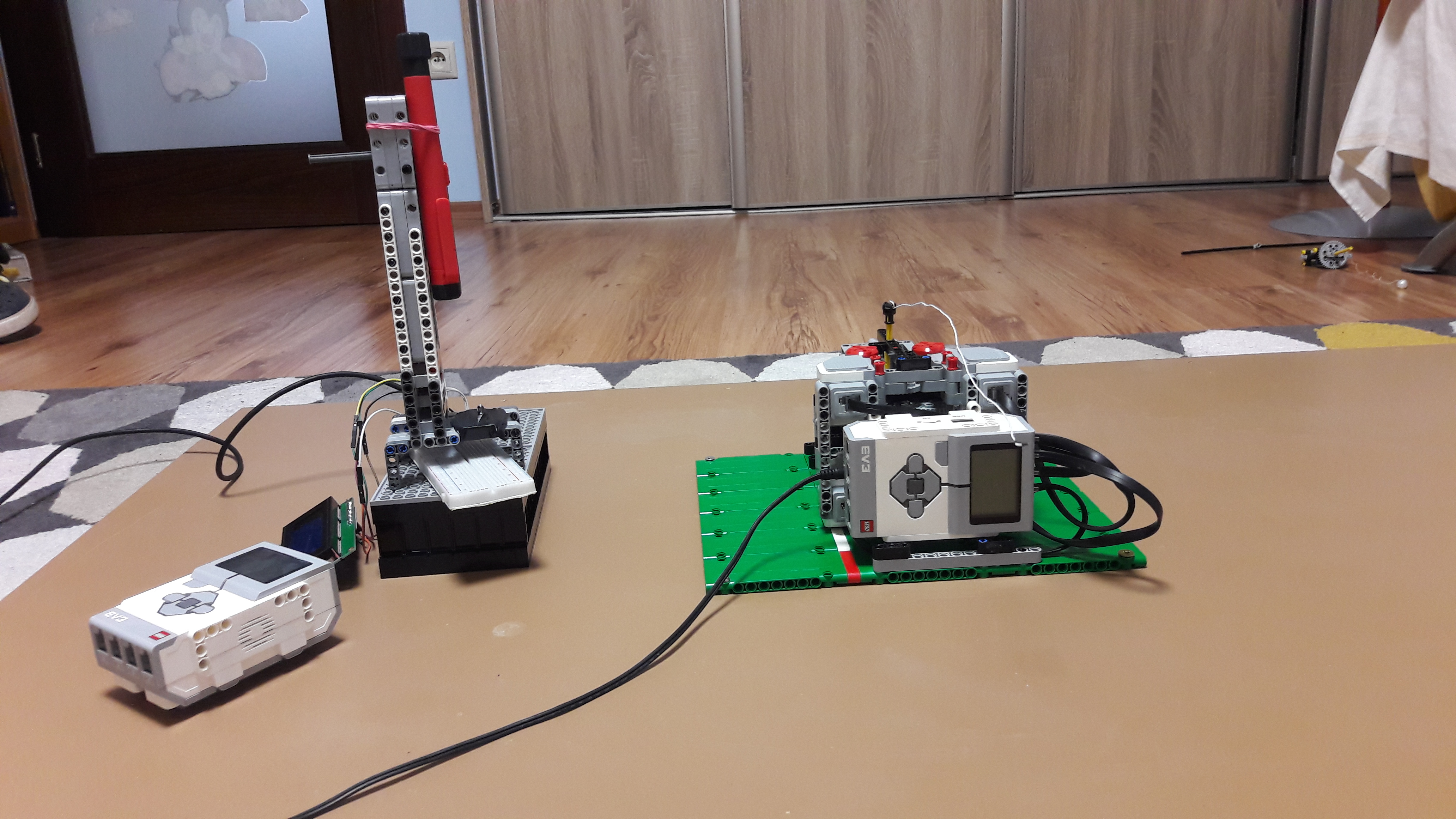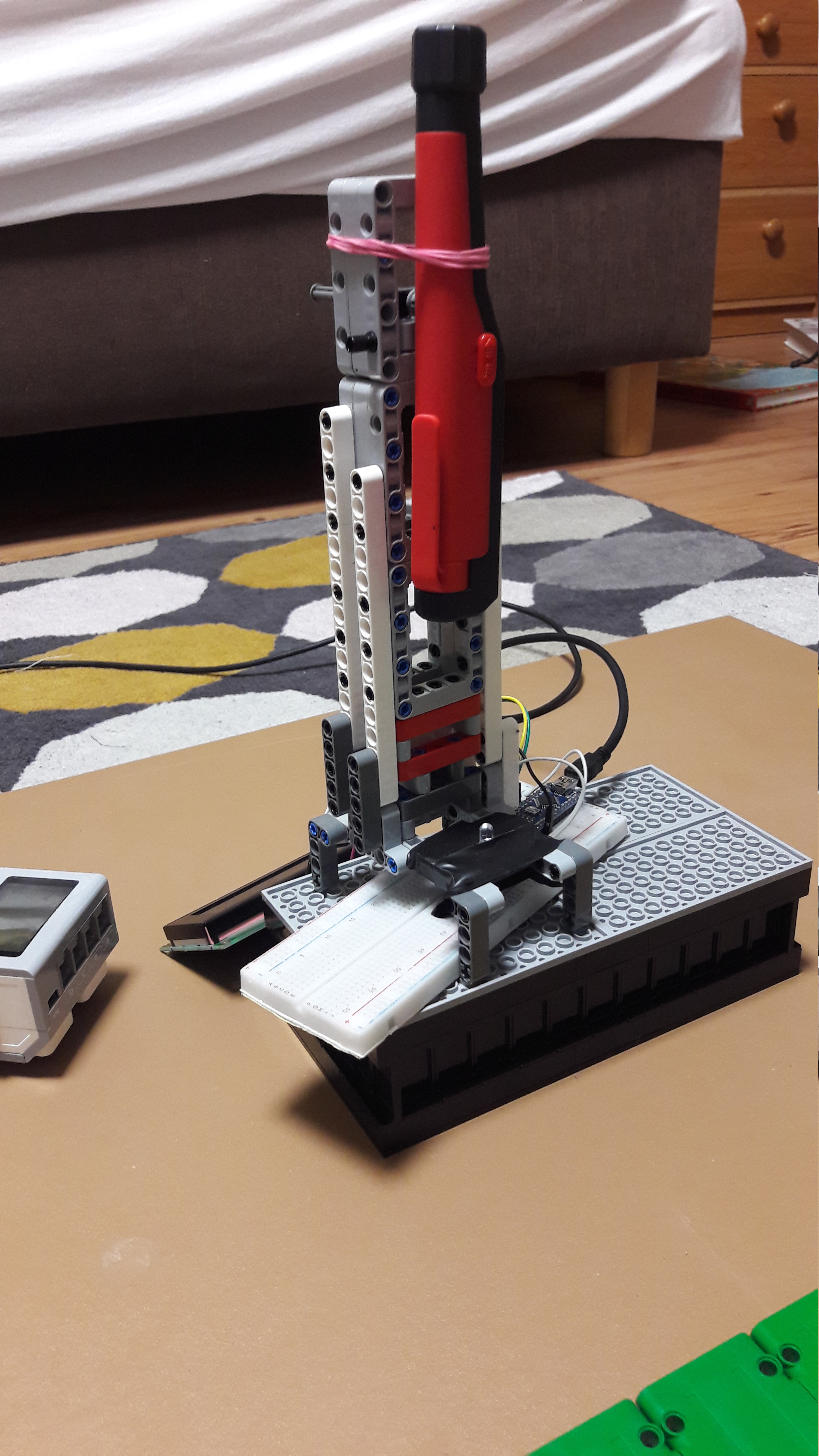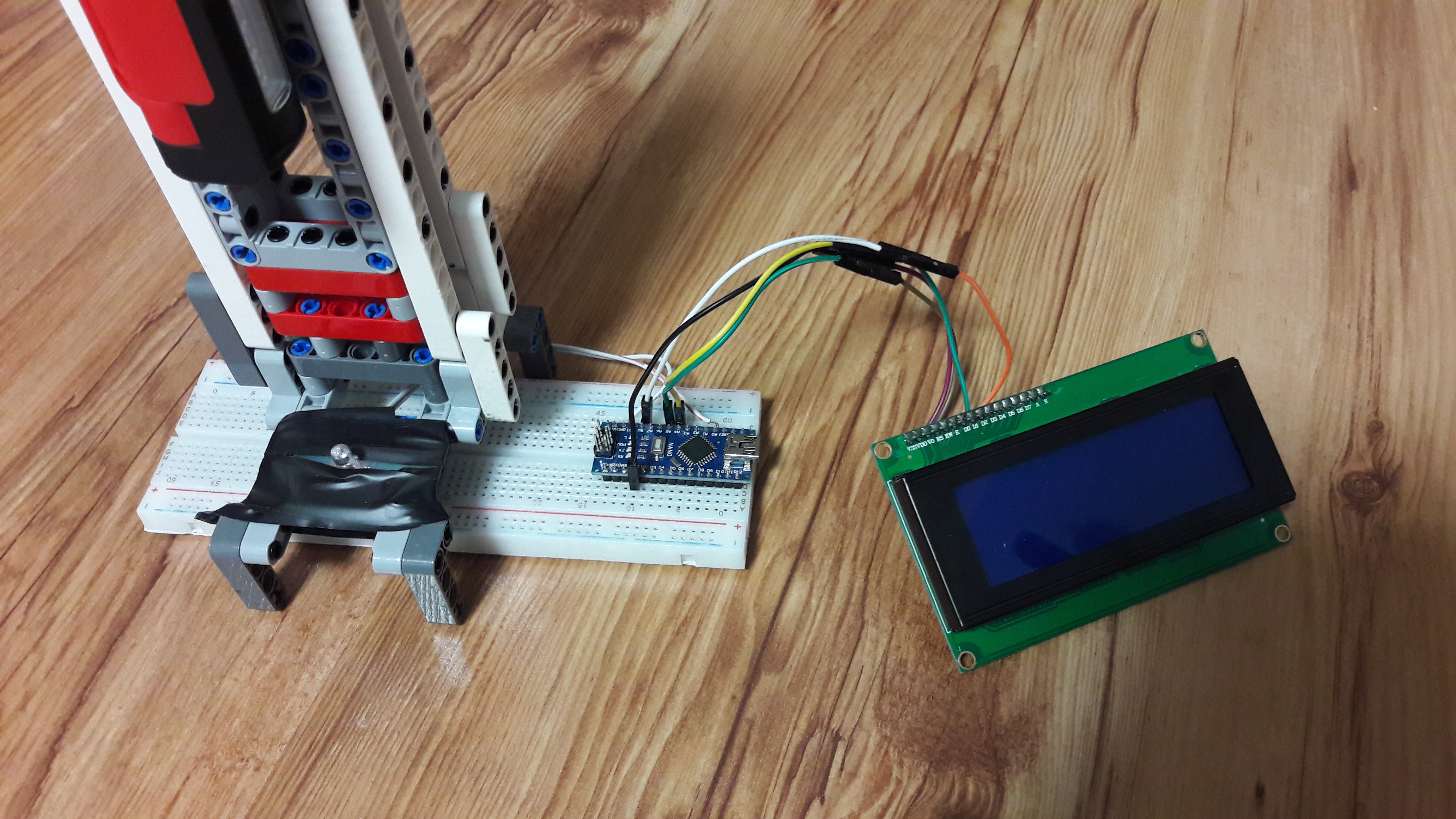 Druhý spôsob je pomocou programovateľnej dosky Arduino. Tento druhý spôsob som nemusel robiť, ale odkedy som si Arduino kúpil, chcel som urobiť laserový tachometer (asi tak sa to volá) a teraz som mal neodmietnuteľnú šancu. Funguje to na princípe, že keď zasvietime na LED žiarovku laser, medzi pinami LED žarovky sa vytvorí malé napätie, ktoré sa pomocou arduina dá odmerať. Pomocou toho vieme narátať koľkokrát bol ten laser prerušený za sekundu a z toho tým istým spôsobom ako vyššie vieme vypočítať rýchlosť bodu na konci drôtu. Najskôr počítame prerušenia laseru po dobu dve sekuny, (ak laser bol prerušený dvakrát za 1 otáčku, vydelíme počet prerušení dvomi) vydelíme počtom sekúnd prejdených od posledného vyresetovania časovača, vynásobíme dráhou prejdenou bodom na konci drôtu, premeníme na km/h a vypíšeme na display. Na display ešte vypíšeme aj otáčky za minútu a za sekundu a že či narátaný počet delíme dvomi. Takýto spôsob by sa dal urobiť aj pomocou ev3 nie? Nie. Ev3 má vzorkovaciu rýchlosť >1000 vzoriek za sekundu, čo vôbec nestačí, ale Arduino dokáže urobiť viac ako 34 000 vzoriek za sekundu bez nejakej veľkej straty presnosti po zmene hodnoty v registri.