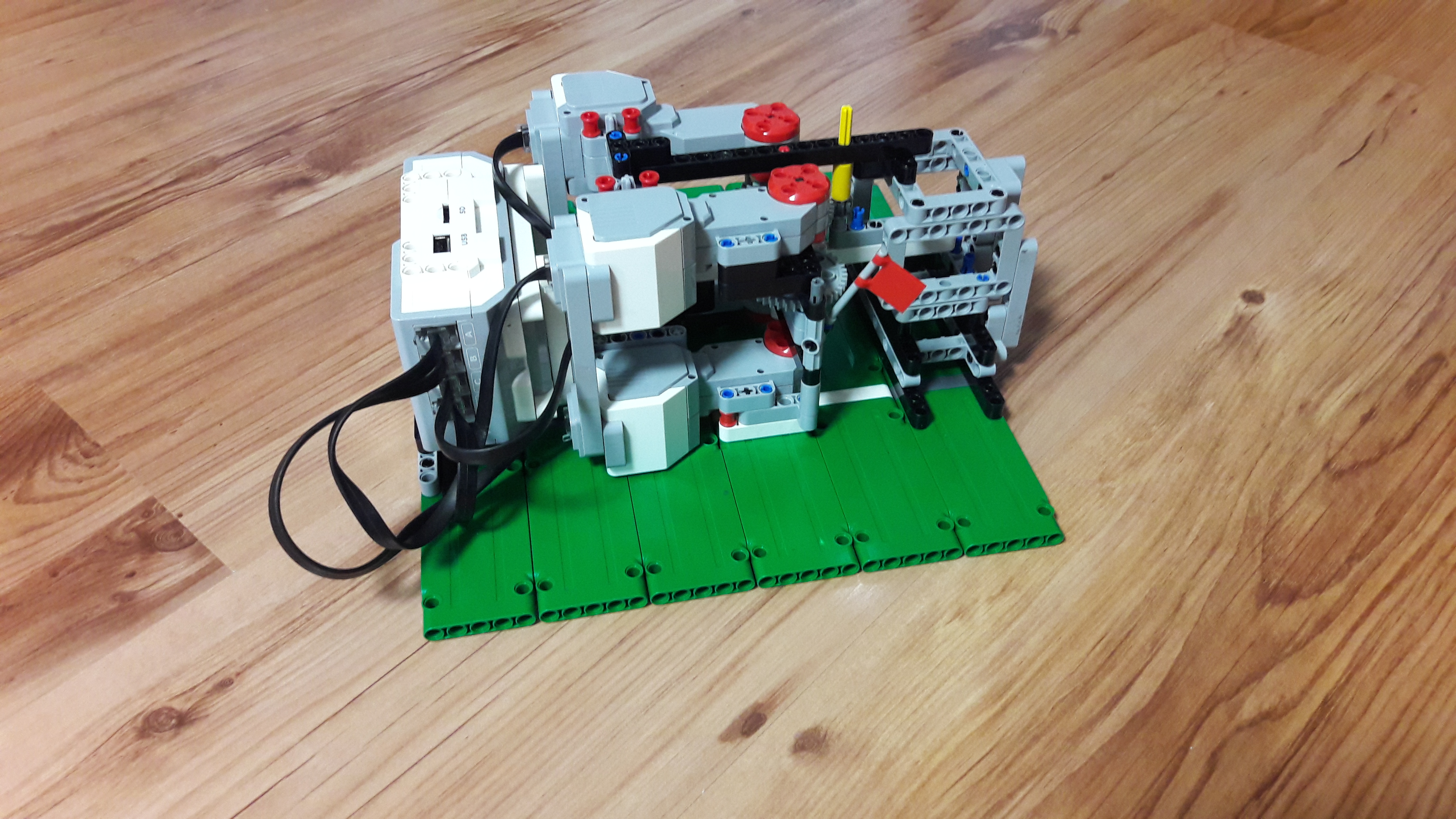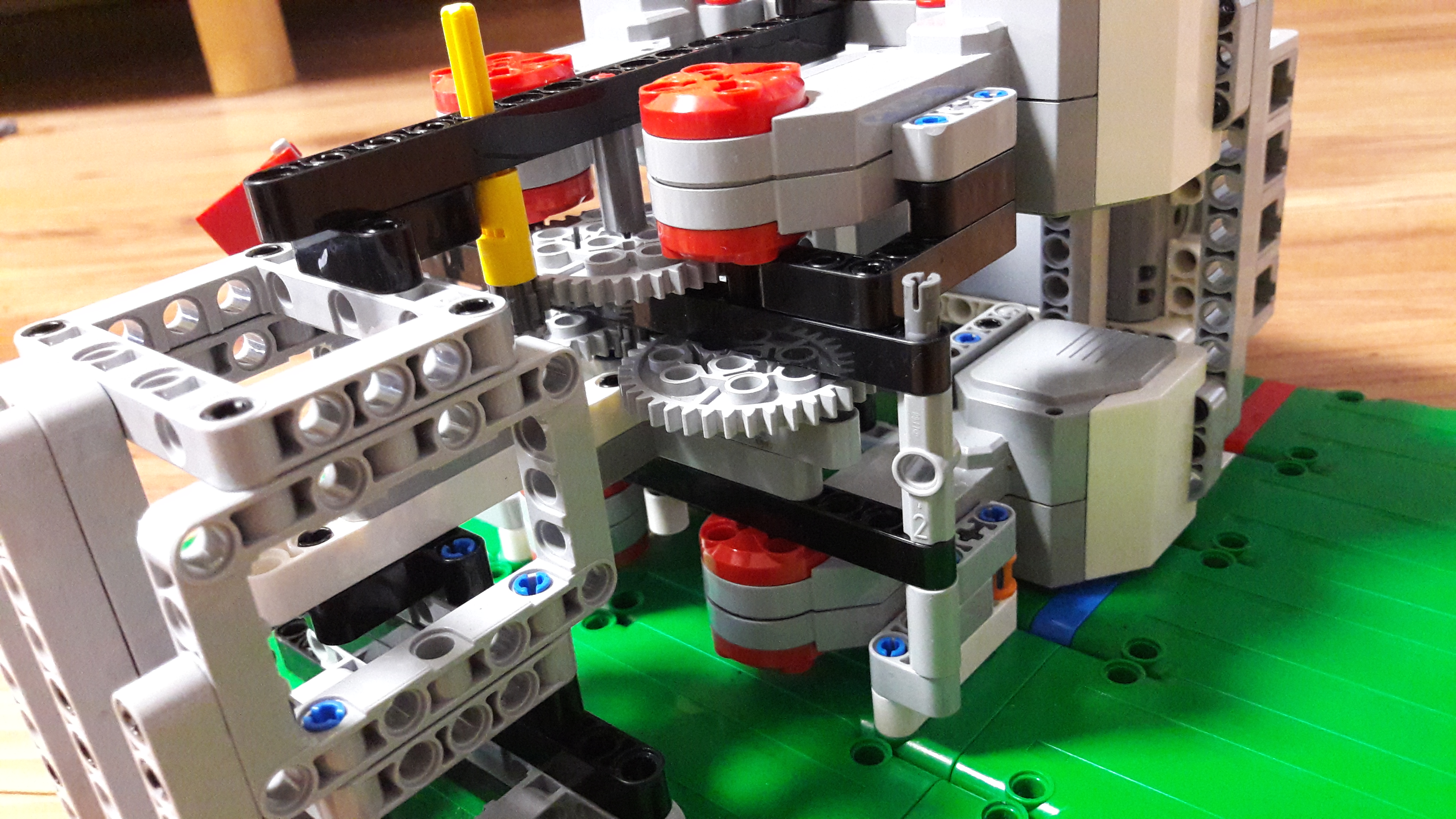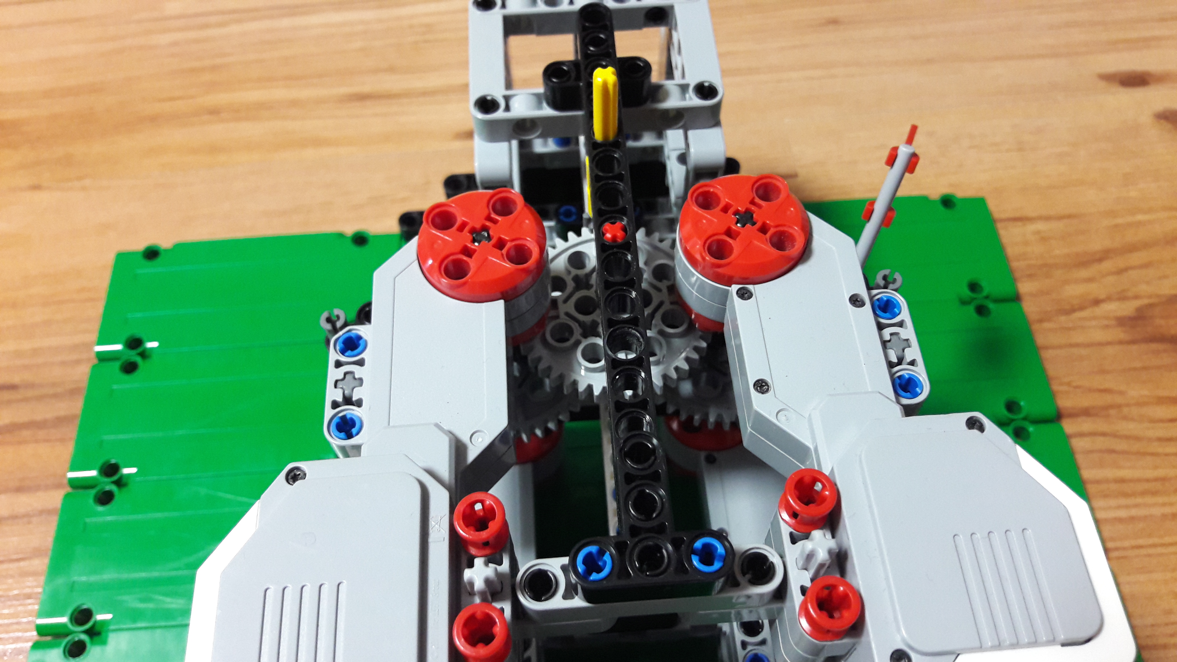 4 large motory. Sú tam dva páry po dvoch motoroch a každý pár otáča jedno 40-zubové koleso (Tentokrát som tie zuby musel popočítať) a spoločne otáčajú 8-zubové koliečko. Na to je pripevnené ďalšie veľké koleso otáčajúce to malé koliečko. Čiže prevod 25:1. Púšťať a pozerať na display robota čo točí bolo ťažké a nepraktické, tak sme urobili "ovládač", na ktorom sa dá jednoducho prečítať nameraná rýchlosť a zapnúť točenie.