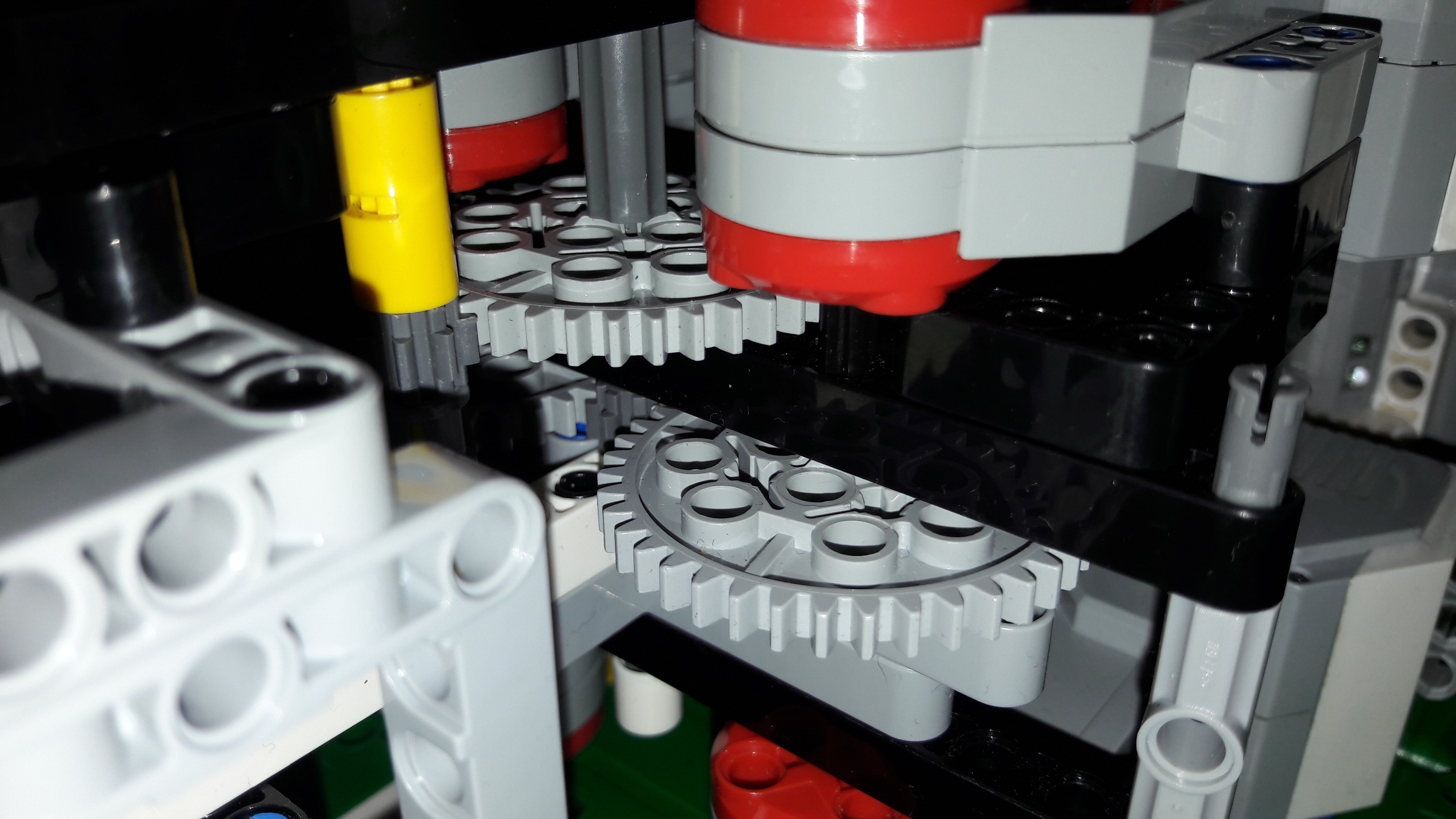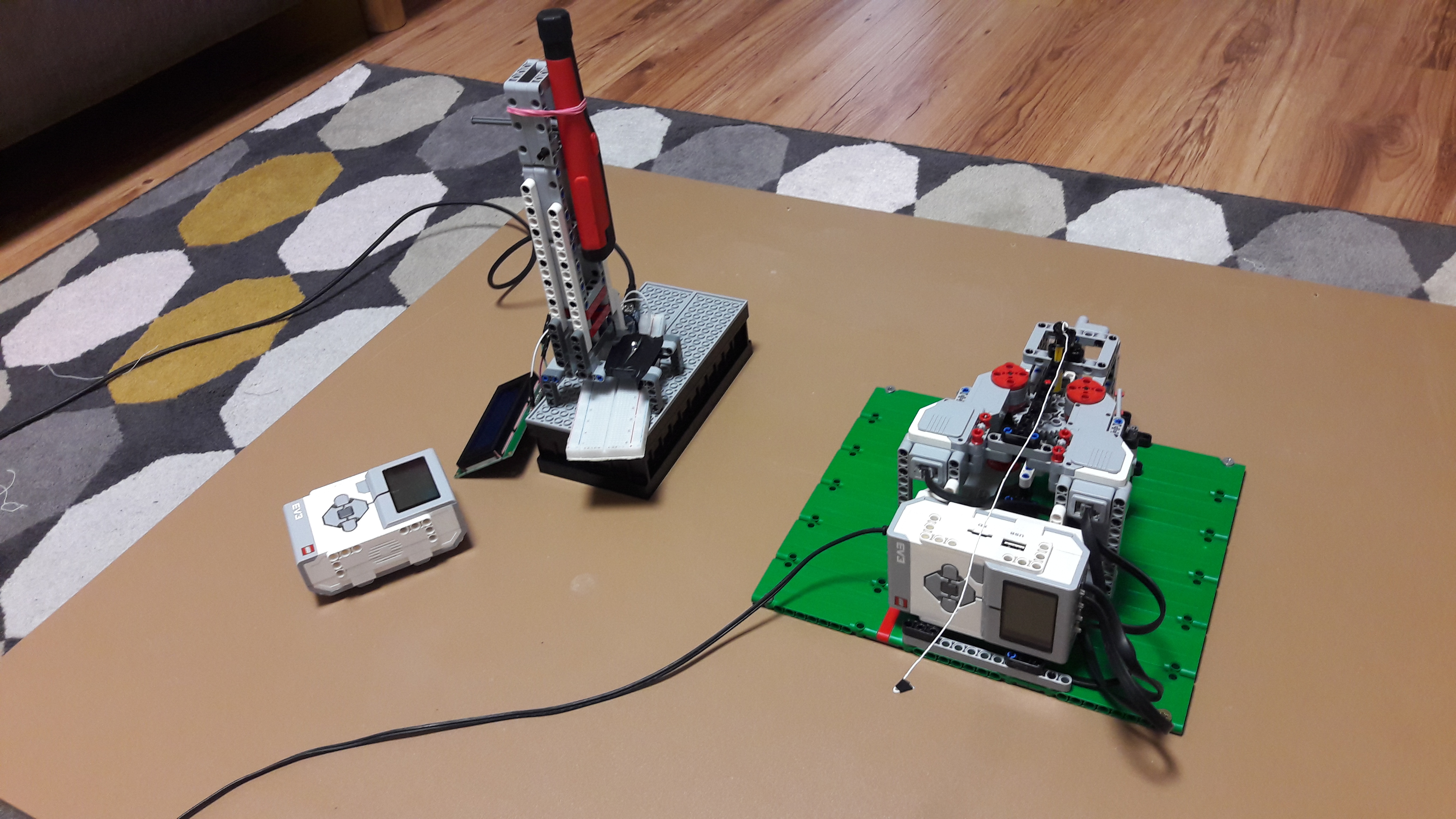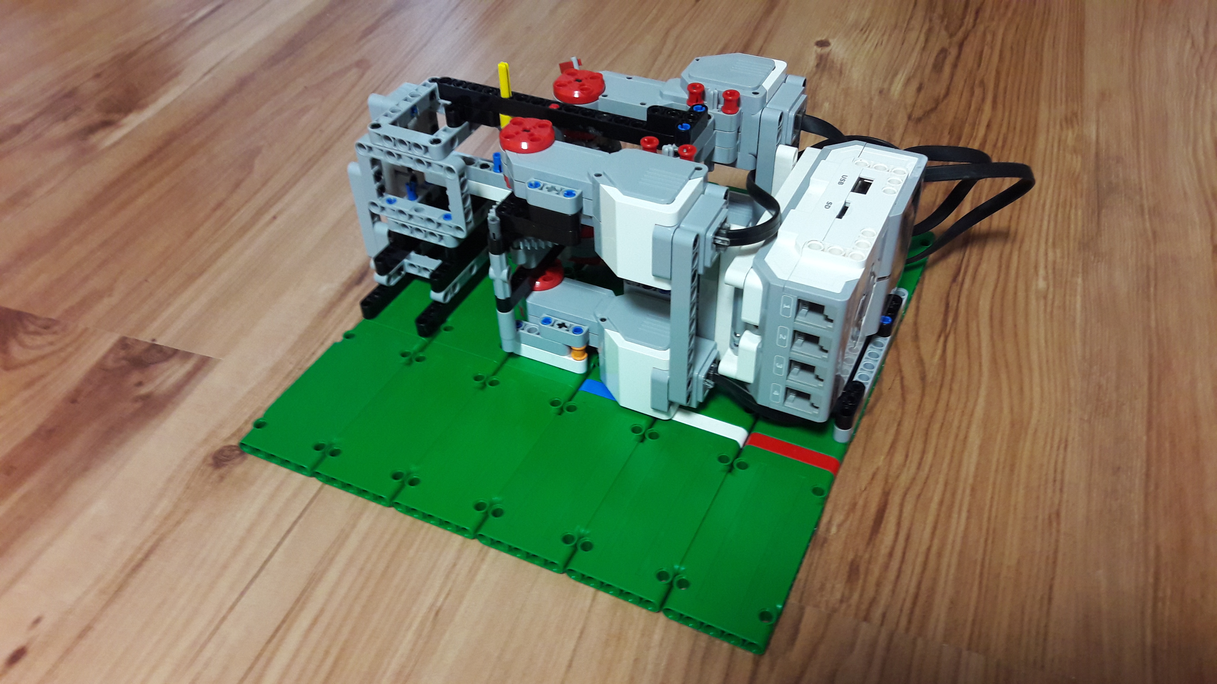 4 large motory. Sú tam dva páry po dvoch motoroch a každý pár otáča jedno 40-zubové koleso (Tentokrát som tie zuby musel popočítať) a spoločne otáčajú 8-zubové koliečko. Na to je pripevnené ďalšie veľké koleso otáčajúce to malé koliečko. Čiže prevod 25:1. Púšťať a pozerať na display robota čo točí bolo ťažké a nepraktické, tak sme urobili "ovládač", na ktorom sa dá jednoducho prečítať nameraná rýchlosť a zapnúť točenie.