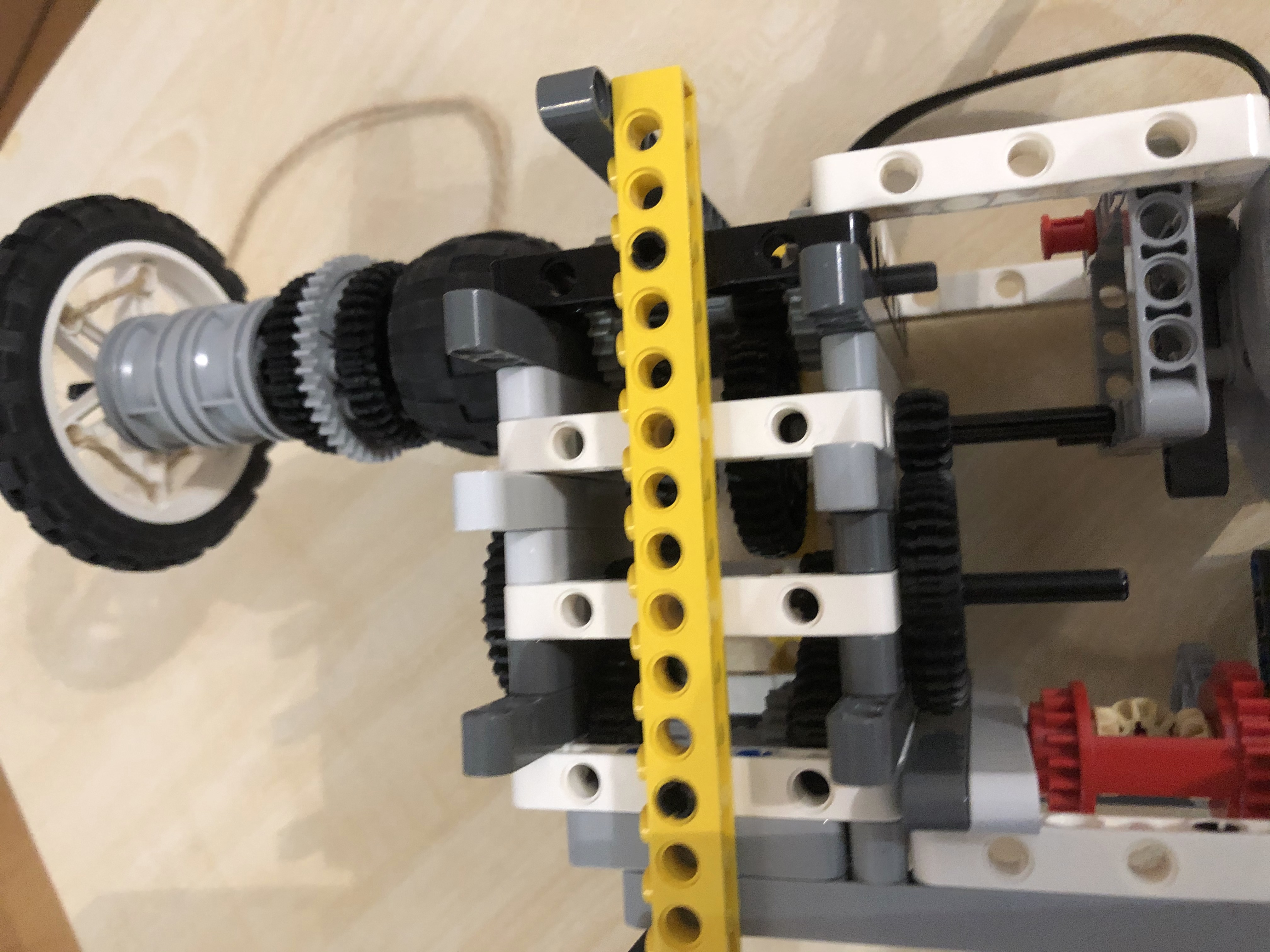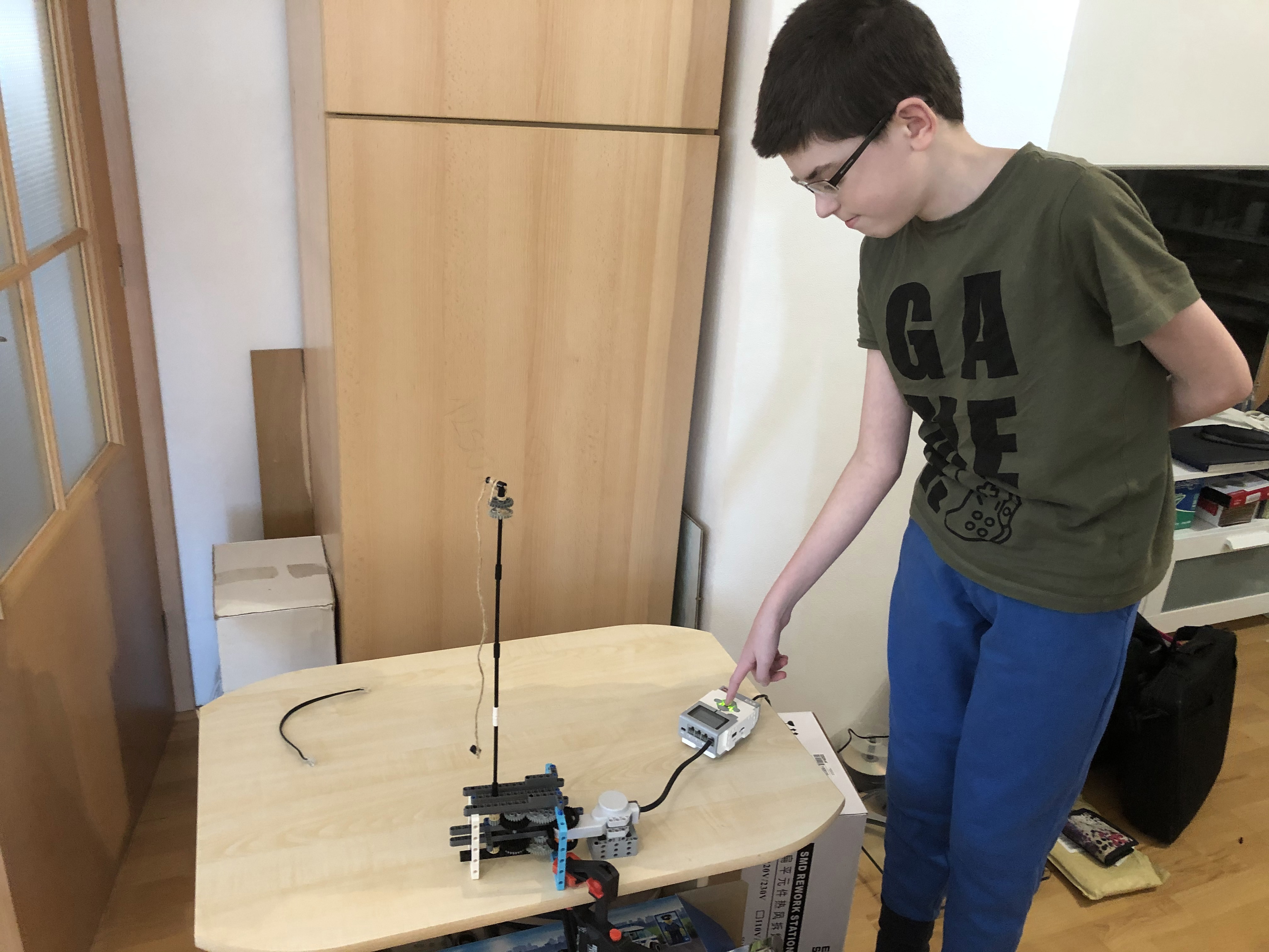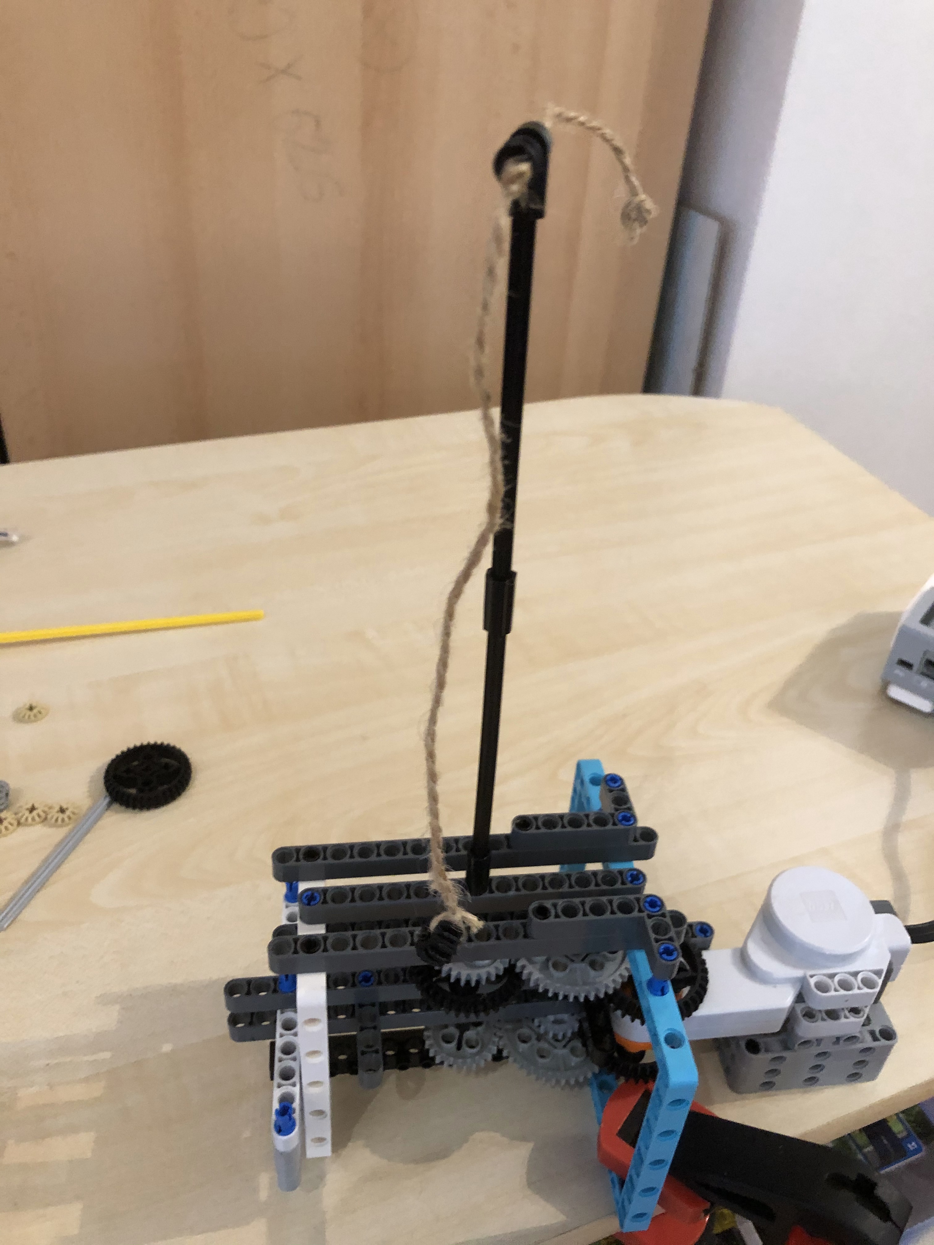 1. Pekné riešenie, riadne ste to roztočili ;) 2. Za úlohu najväčšia rýchlosť ziskavate 2,9b. Žiaľ rýchlosť, ktorú ste namerali bola prekonaná iným tímom. Vaše riešenie pôsobí trošku nebezpečne labilne. 3. Páči sa mi ako ste si poradili a rozbiehali motorčeky postupne. Mohli ste však konštrukciu trocha spevniť, aby sa palička tak nerozkmitávala. Boli aj rýchlejší, preto 2,6 4. Dúfam, že kameraman používal brnenie, lebo inak bol jeho život vážne ohrozený. Pozrite si riešenia iných tímov - ak by bolo závažie rovnomerne na oboch stranách, tak by nedochádzalo ku kmitaniu a ohýbaniu osky, na ktorej bol špagátik upevnený a tiež by nebolo treba robota pripevňovať ku stolu zverákom. Inak dobrá práca!