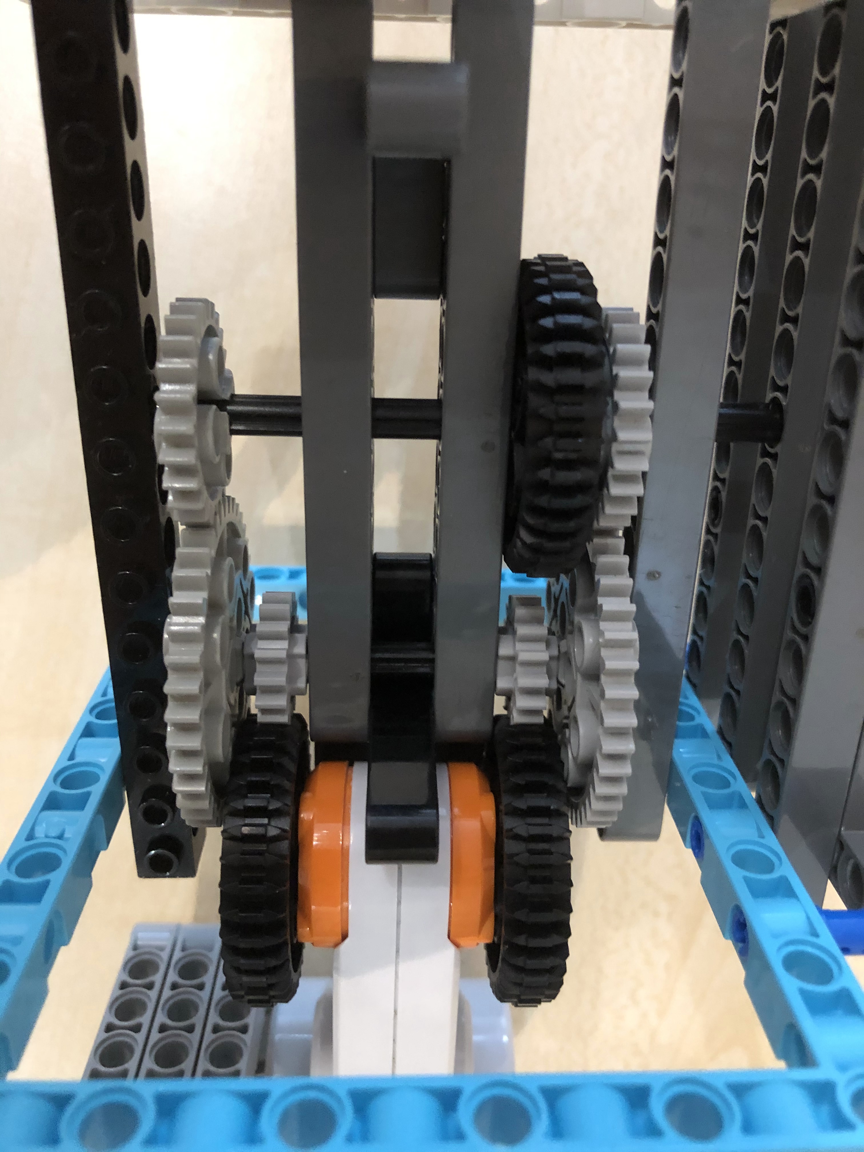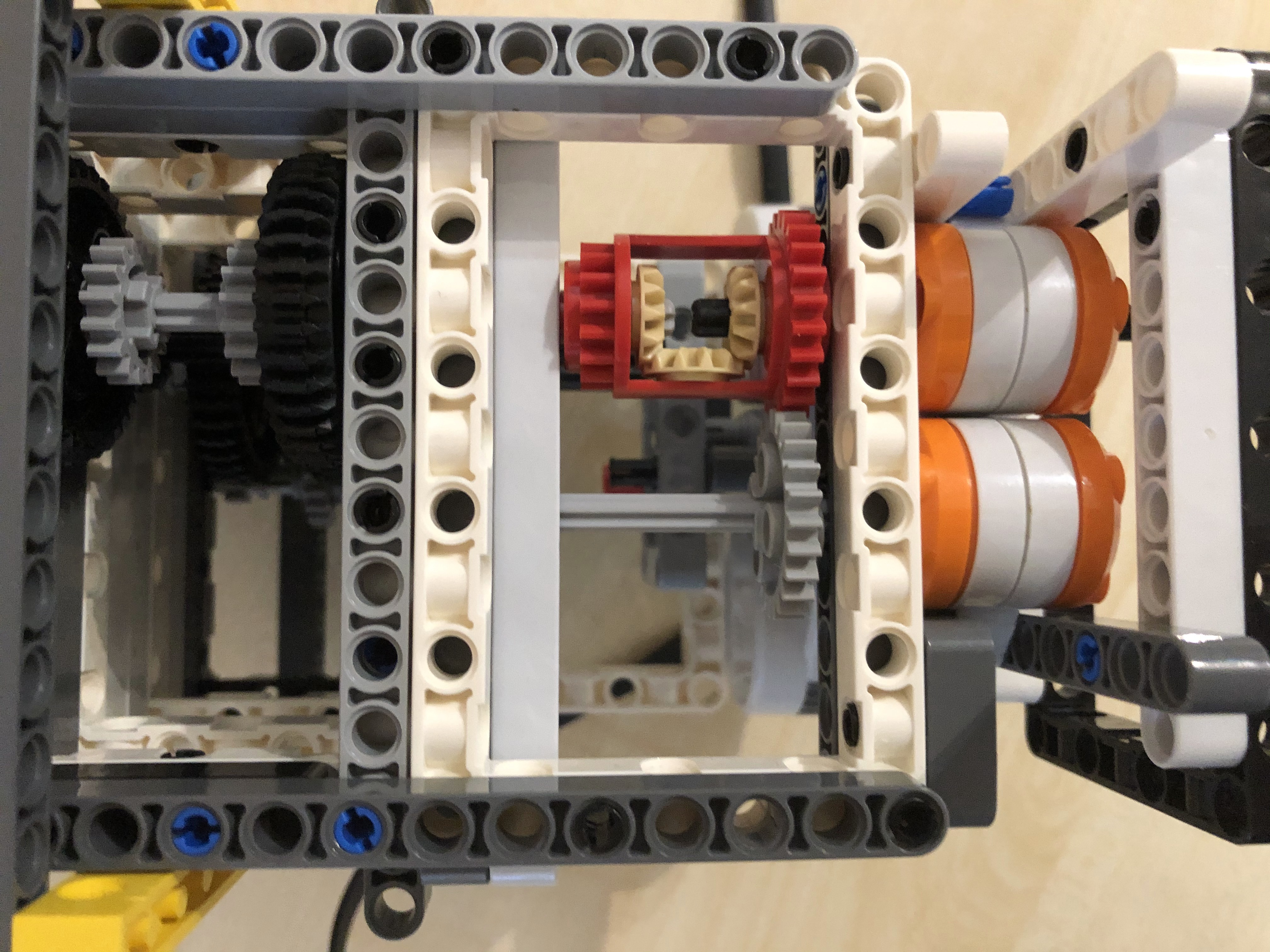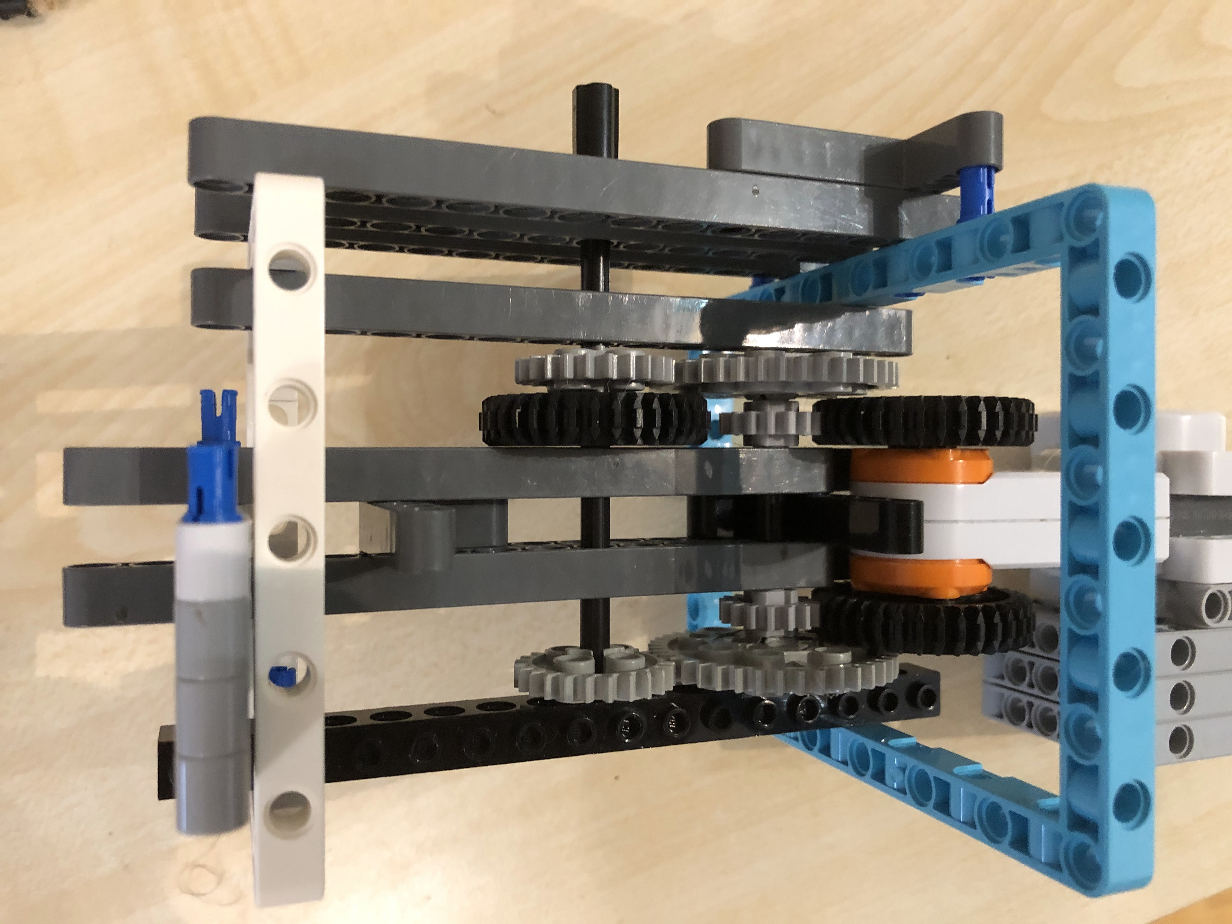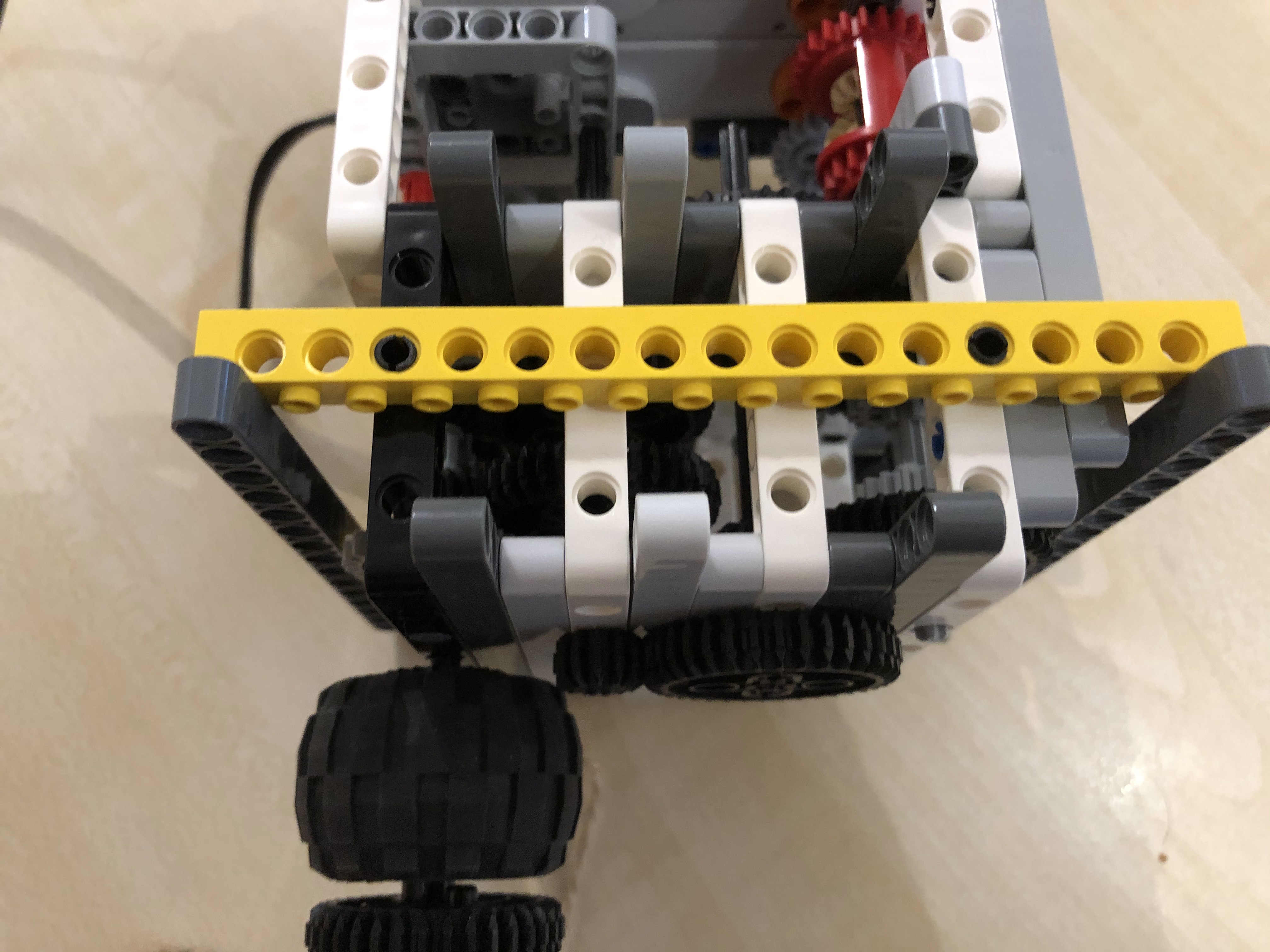 1. Pekné riešenie, riadne ste to roztočili ;) 2. Za úlohu najväčšia rýchlosť ziskavate 2,9b. Žiaľ rýchlosť, ktorú ste namerali bola prekonaná iným tímom. Vaše riešenie pôsobí trošku nebezpečne labilne. 3. Páči sa mi ako ste si poradili a rozbiehali motorčeky postupne. Mohli ste však konštrukciu trocha spevniť, aby sa palička tak nerozkmitávala. Boli aj rýchlejší, preto 2,6 4. Dúfam, že kameraman používal brnenie, lebo inak bol jeho život vážne ohrozený. Pozrite si riešenia iných tímov - ak by bolo závažie rovnomerne na oboch stranách, tak by nedochádzalo ku kmitaniu a ohýbaniu osky, na ktorej bol špagátik upevnený a tiež by nebolo treba robota pripevňovať ku stolu zverákom. Inak dobrá práca!