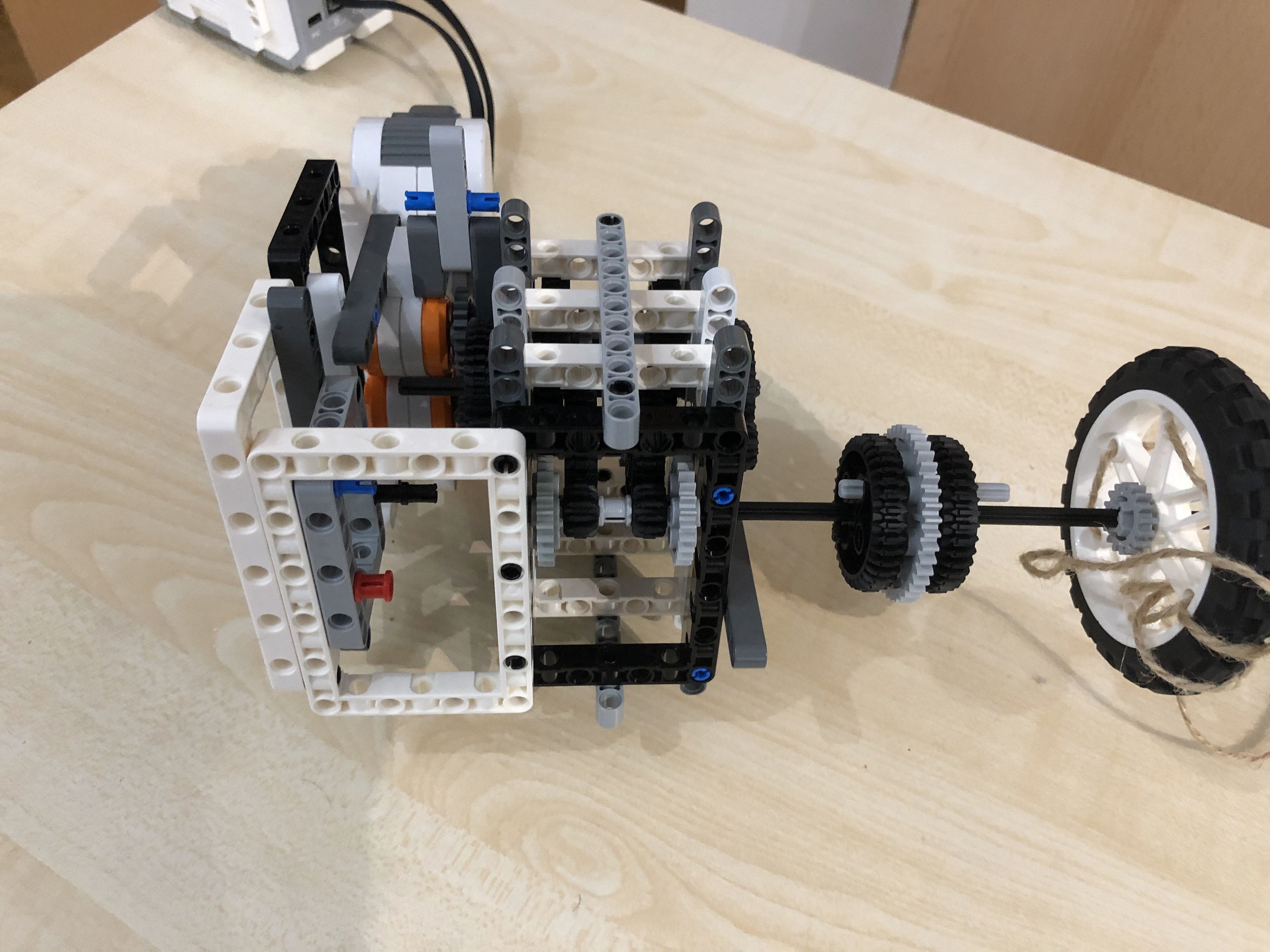 Na roztočenie šnúrky používame dva NXT motory, ktorých výkon spájame,