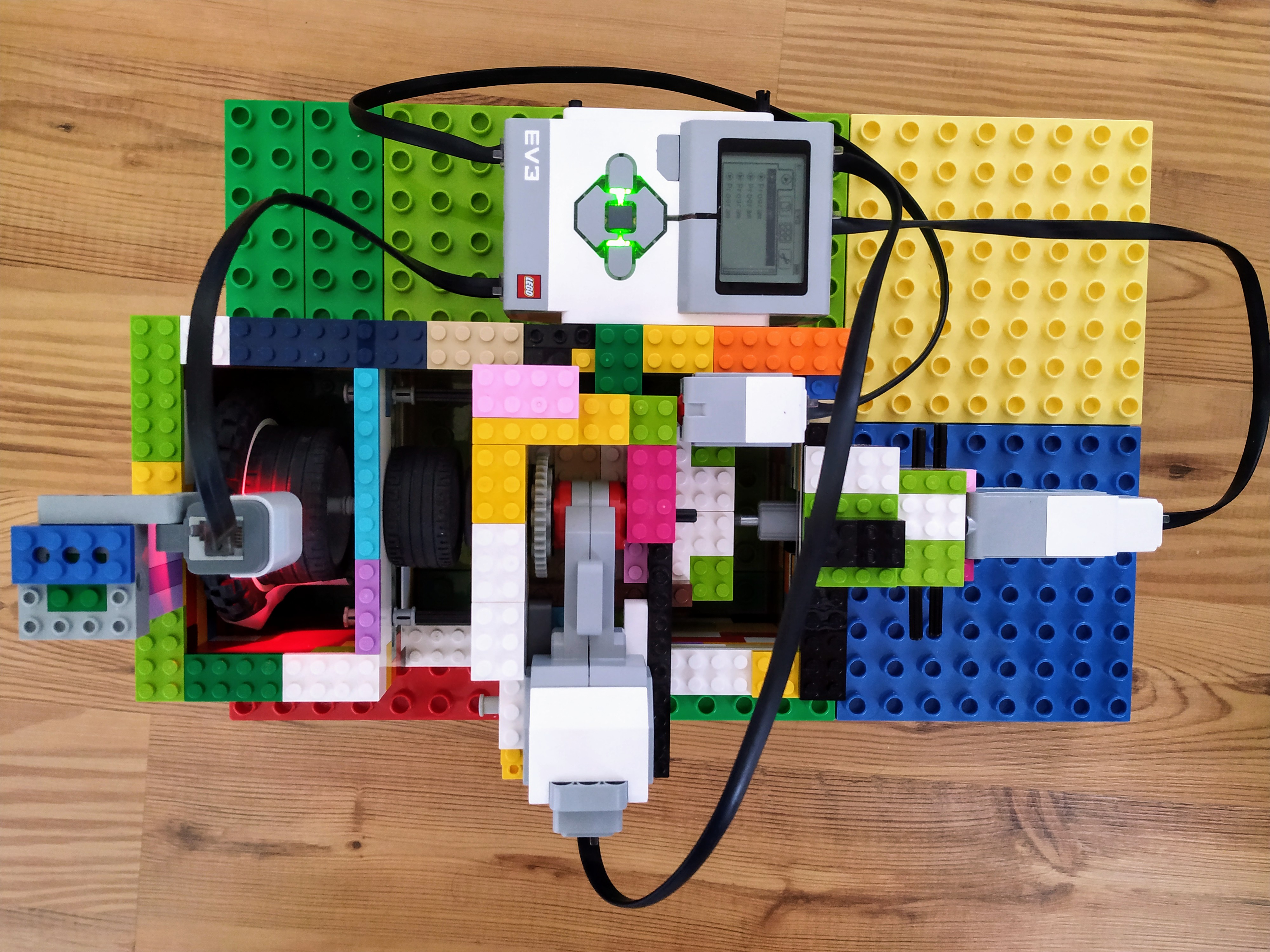 Najprv sme postavili robota ktorý má 1 large servo motor, ktorý roztáča koliesko "zotrvačník" druhým kolieskom a jeden medium servo motor ktorý na začiatku prisunie large servo motor dostatočne blízko k zotrvačníku a potom, keď je už zotrvačník roztočený, tak sa vzdiali a my zaciname merať čas točenia.