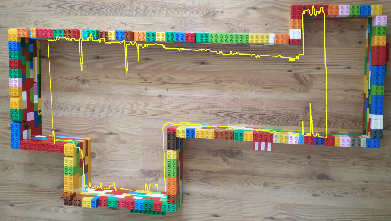 Kvoli kontrole sme nechali robot mapovat miestnost zlava a potom aj sprava. Ziskane mapy boli zrkadlovo symetricke. Potom sme zhrali robotove namerane data do počítača (data.txt v prílohe) a v SciLabe sme ich vykreslili do mapy, ktorá je medzi obrázkami nizsie. Táto mapa sa velmi dobre zhoduje so skutočným tvarom miestnosti, ako vidno na jednom z obrázkov. Drobny 'sum' na niektorych miestach bol sposobeny nerovnostami v muriku okolo miestnosti.