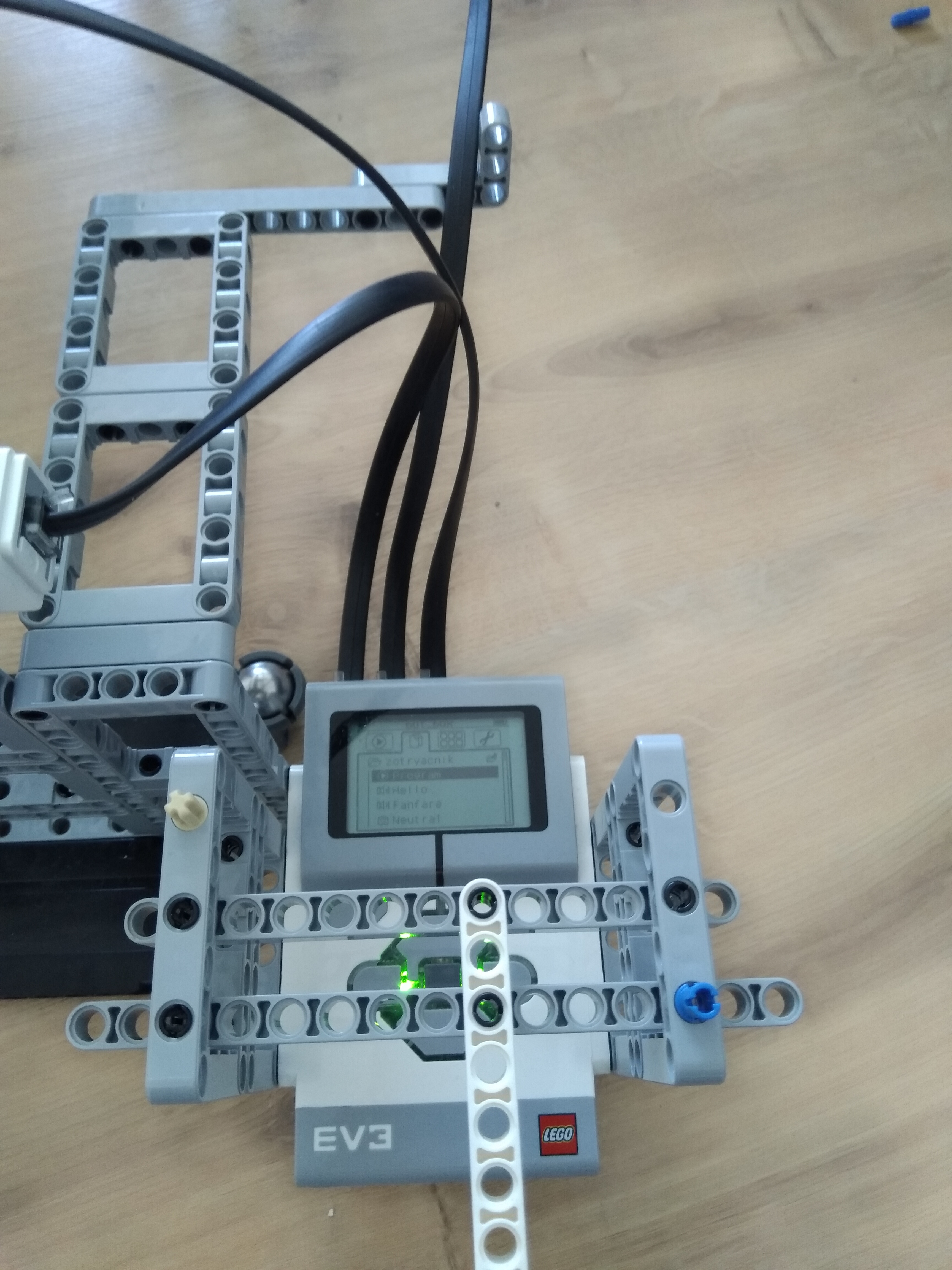 Náš program je takýto robot najprv čaká dokým stlačíme stredné tlačidlo. Potom robot roztočí vĺčka a popritom vypisuje akou rýchlosťou sa točia motory. A keď stlačím horné tlačidlo ta sa horná plošina aj z motorom zdvihne a tým sa vĺčik odlúči od robota. Potom robot spustí časomer a keď stlačíme stredné tlačidlo tak sa časomer zastaví a robot vypíše aký čas sa vĺčik točil.