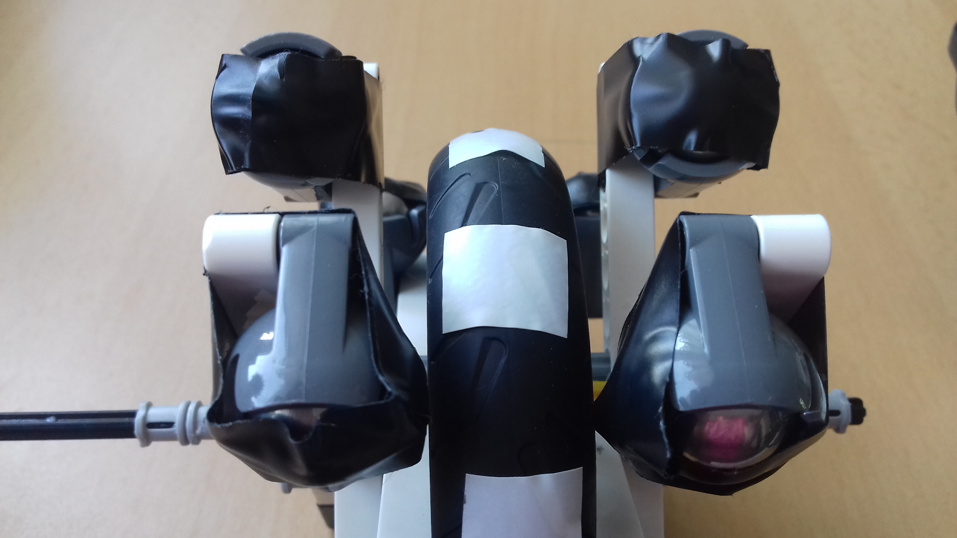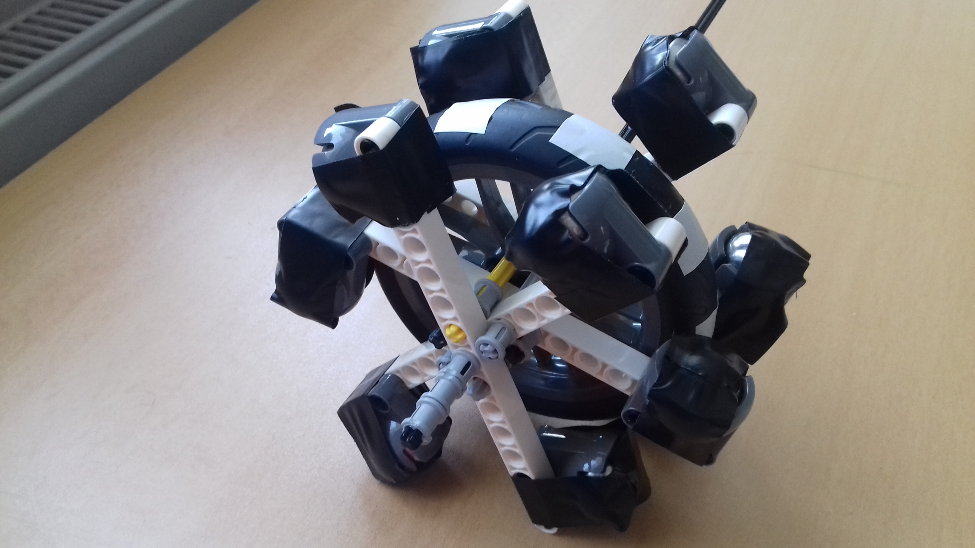 POPIS KOLESA: je zložené z veľkého, úzkeho 9 cm kolesa, na ktorom je pripevnenných 6 rovných paličiek/15/. Na každej je na obidvoch koncoch pripevnená gulička. Kto pozná lego vie, že sa gulička v púzdre pohybuje, aby sa mohla otáčať. Pre toto zadanie som však guličky musel oblepiť páskou, lebo pri veľkých rýchlostiach odstredivou silou vypadávali von a lietali tak po izbe-čo bolo niekedy aj nebezpečné. Všetky paličky s guličkami a koleso som dal na najdlhšiu os, ktorú máme -25 cm.