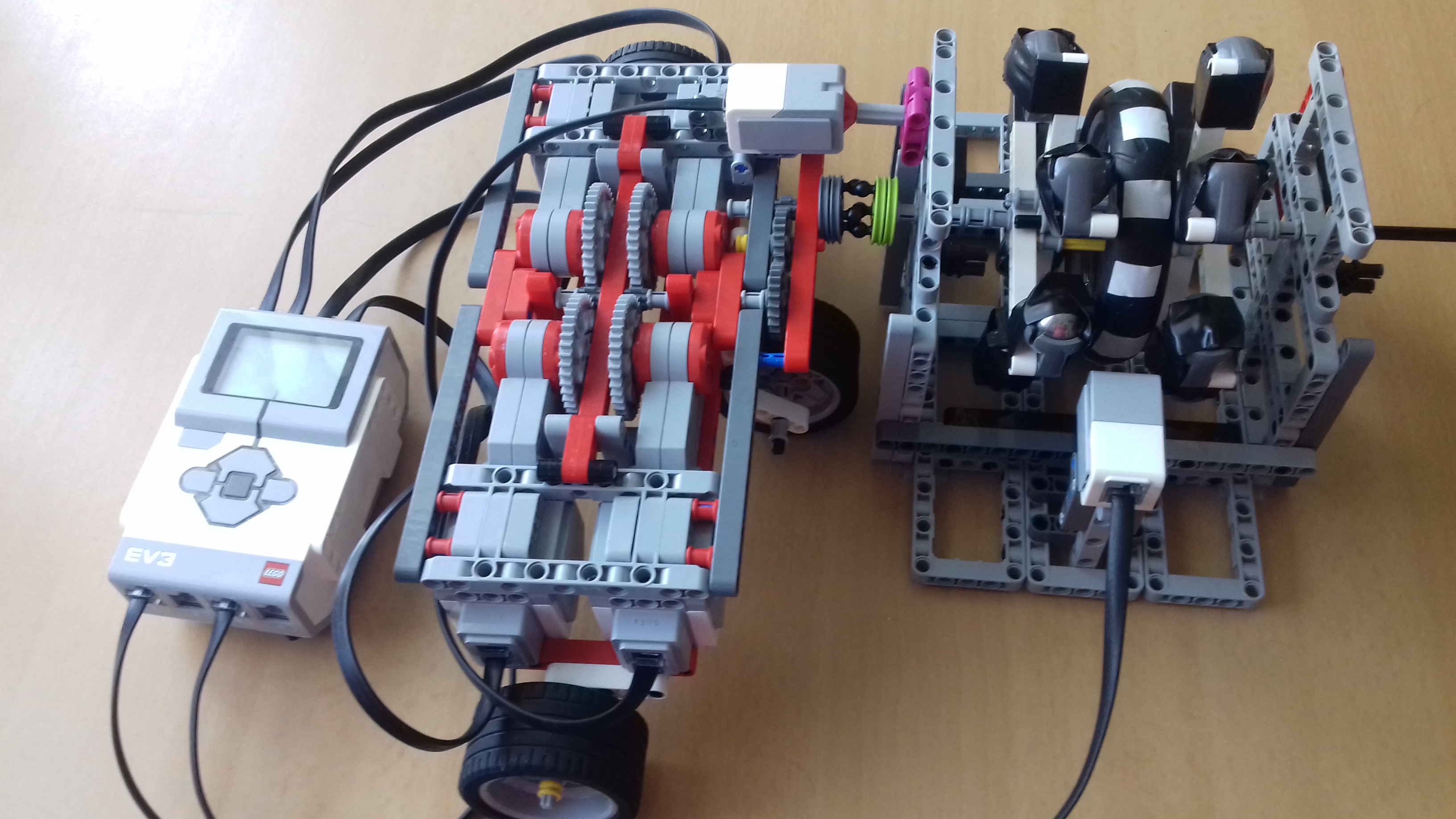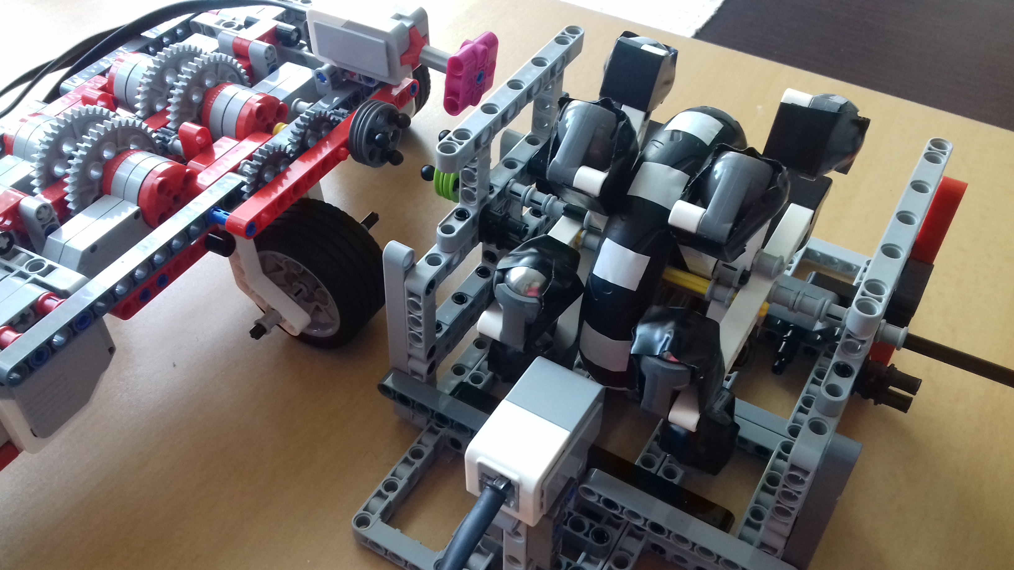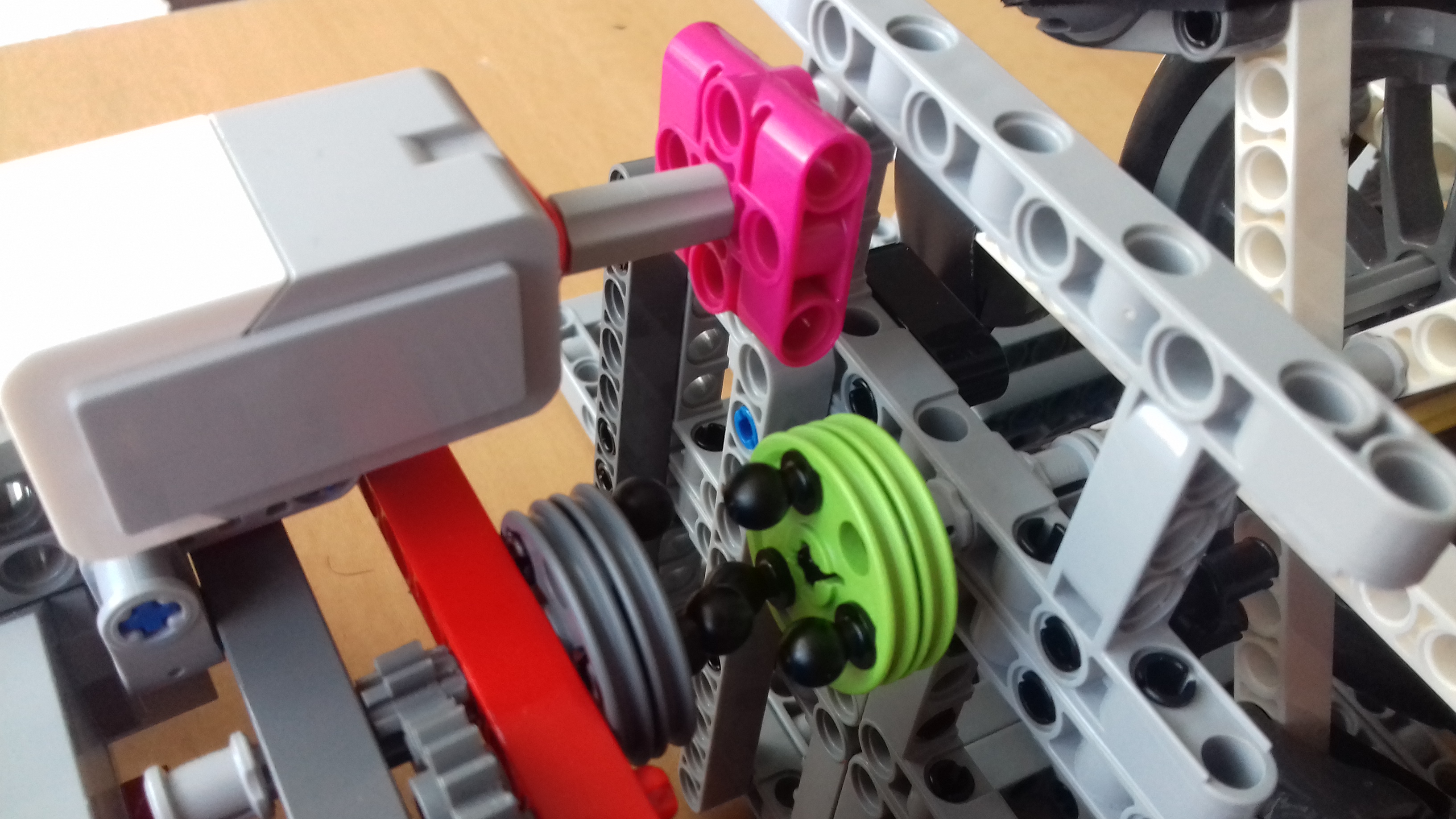 POPIS ROBOTA: skladá sa z dvoch častí: jedna pohyblivá a druhá stacionárna. Pevná časť musí by veľmi pevne prichytená na podložku, preto som použil dual locky z FLL. V nej je umiestnené koleso na oske, ktorá sa voľne pohybuje v bočných rámoch. Pohyblivá časť je sústava 4 motorov, ktoré sme použili z úlohy č.5. Sú sprevodované 5:1 a na výstupe 3:1 a sú na troch kolesách, aby sme vedeli motory vypojiť.