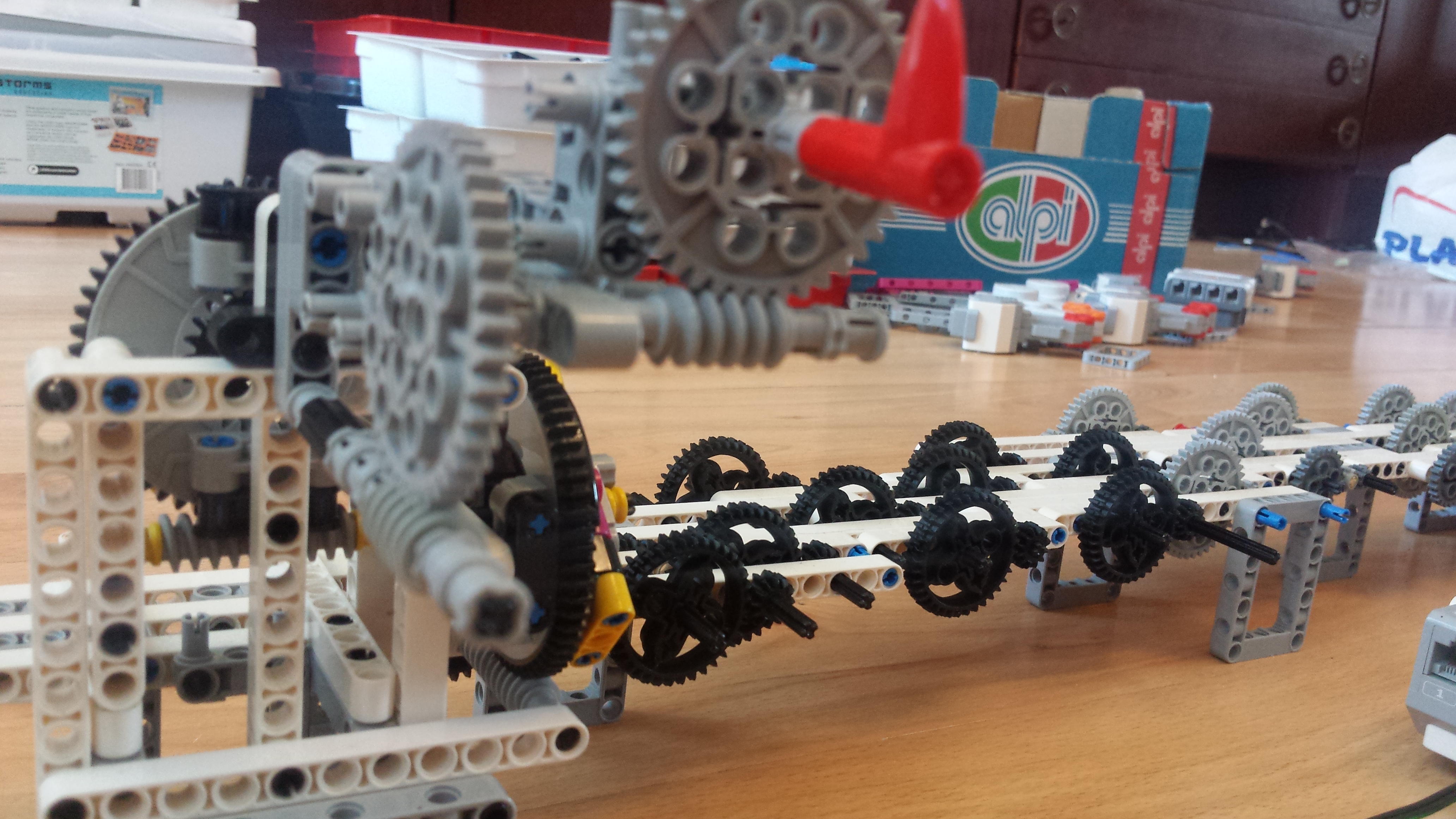 Použili sme prevody ozubených koliesok 13x 1:3, 9x 1:5 a závitovkové prevody 2x 1:40 a 2x 1:56.