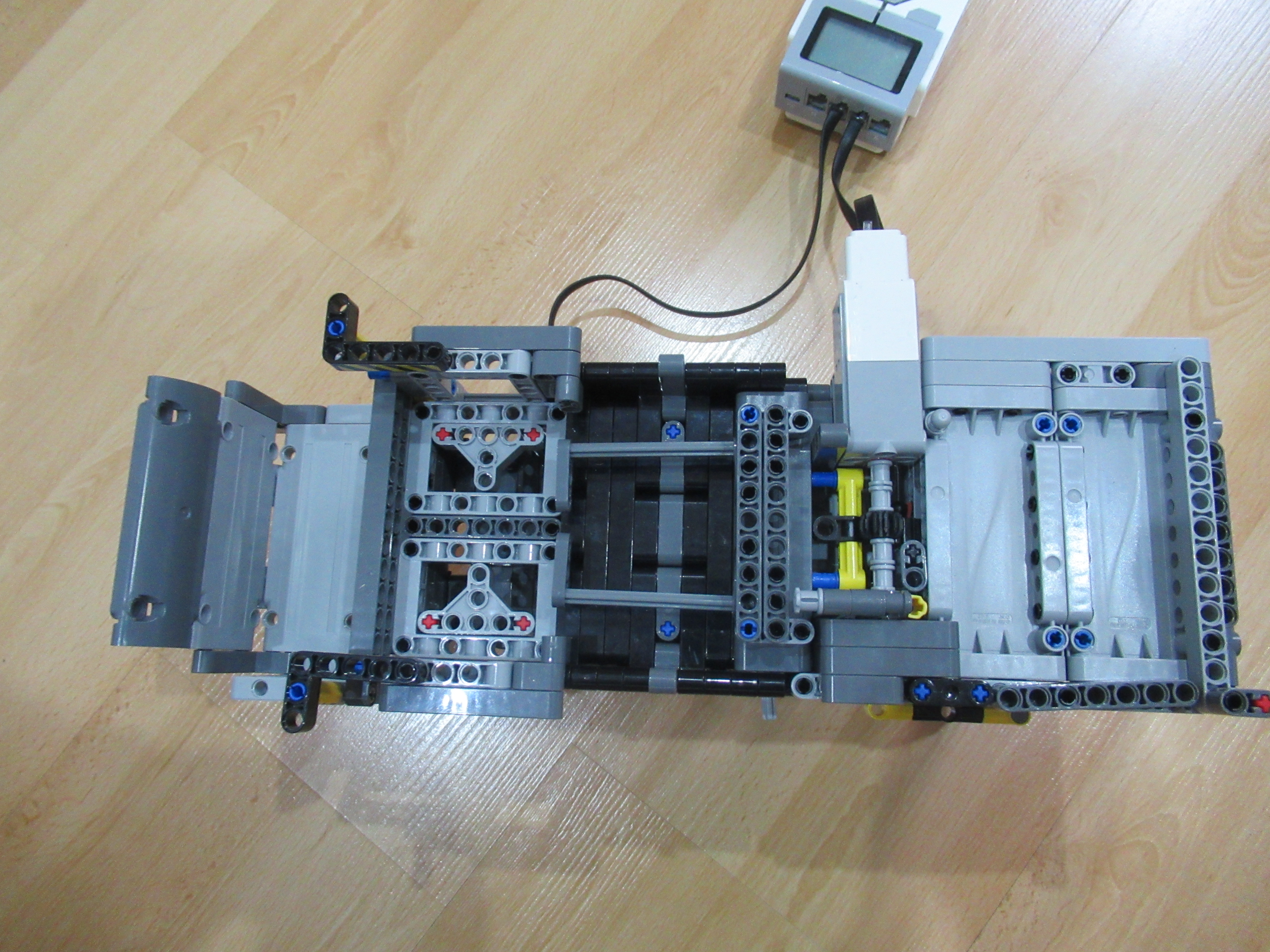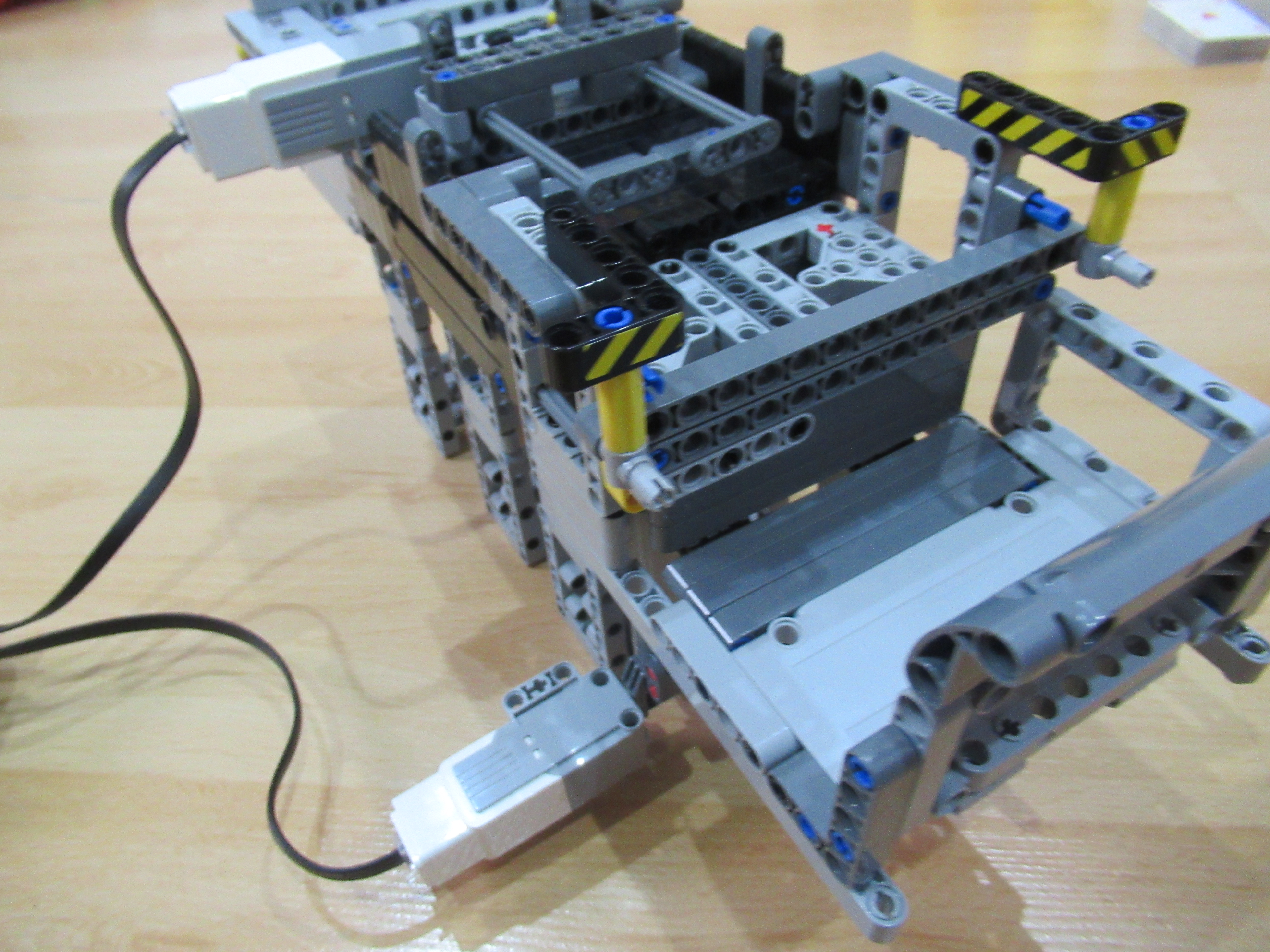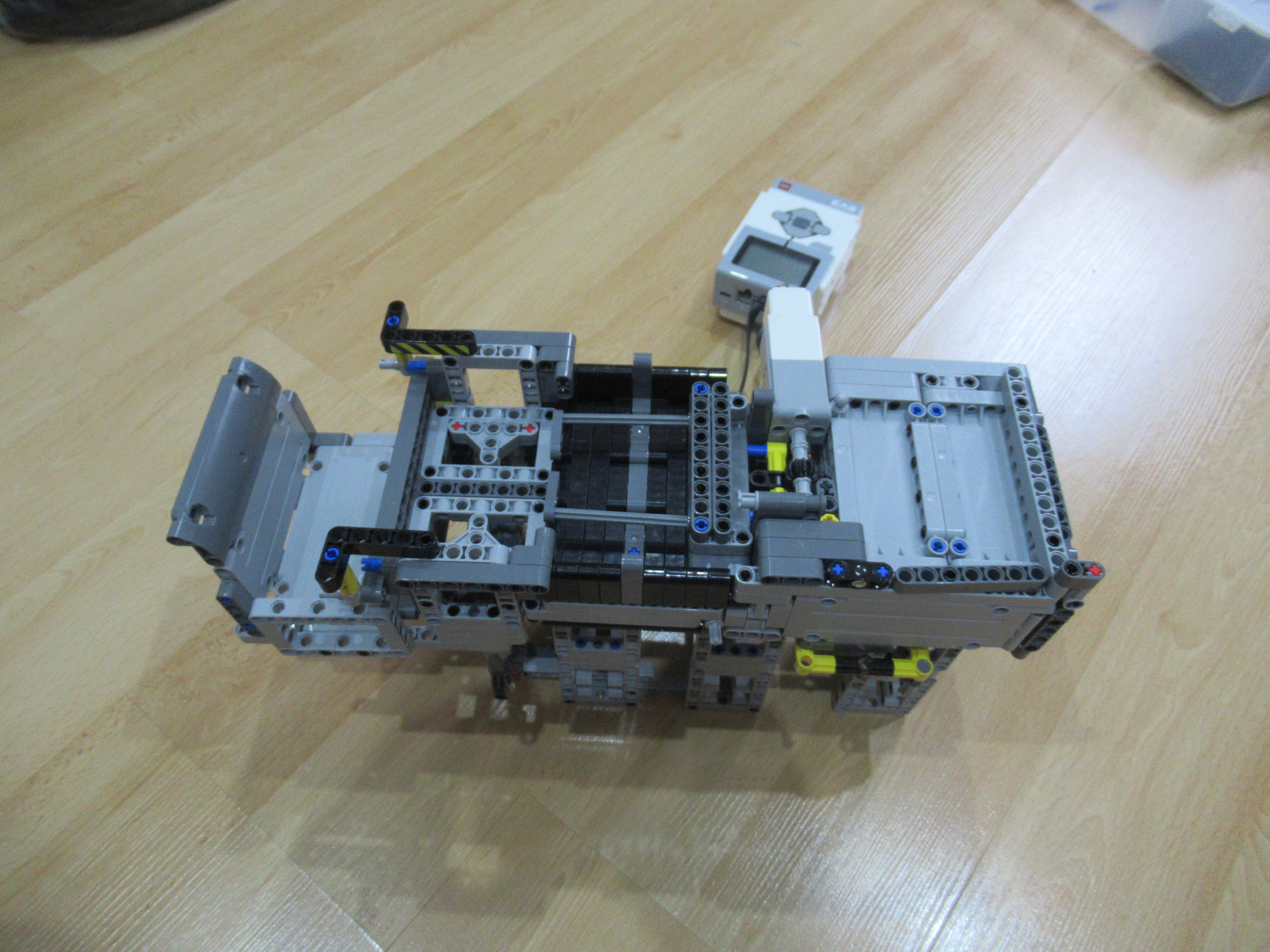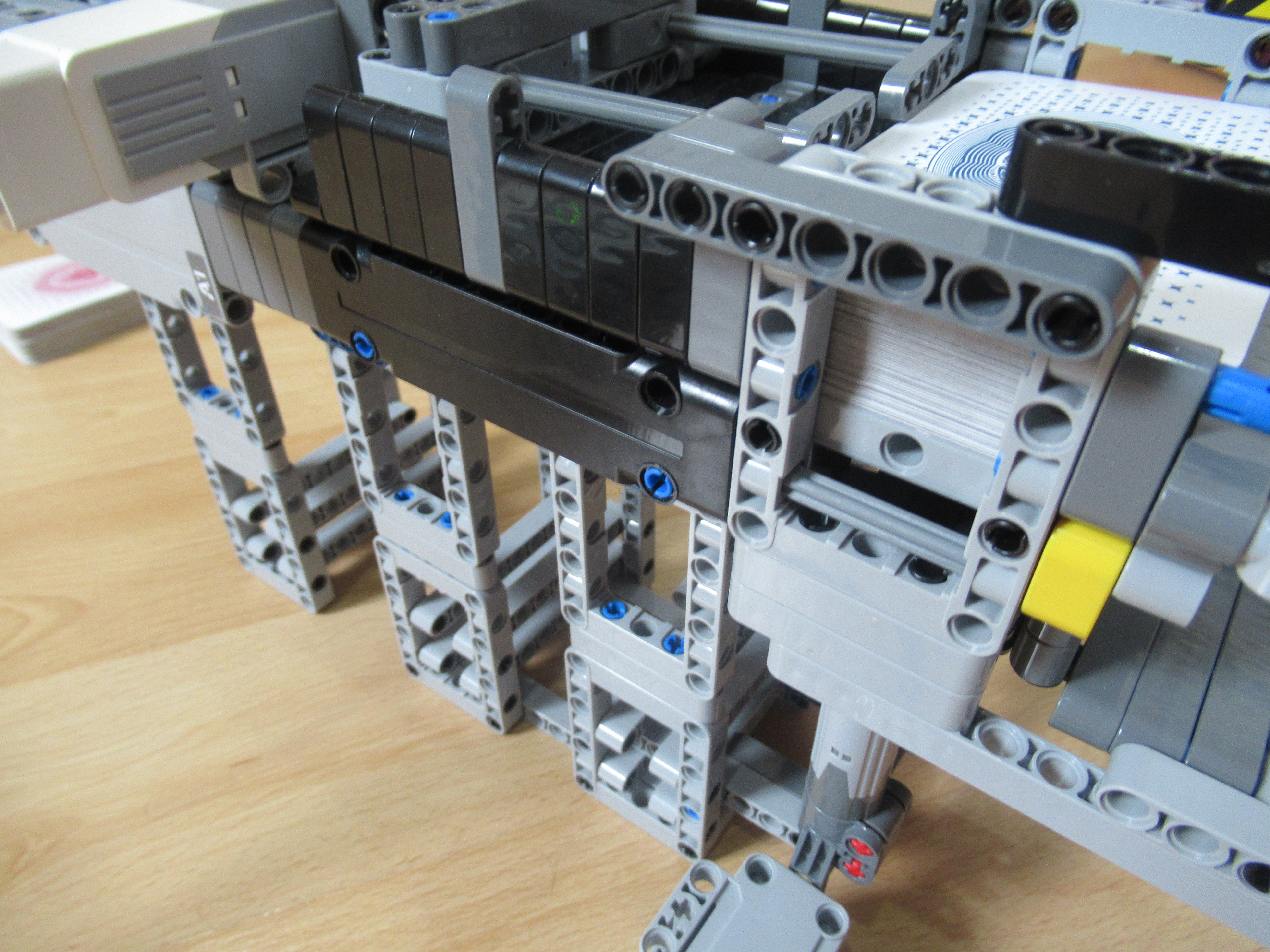 Náš robot sa skladá z dvoch médium motorov, z ktorých jeden má za úlohu zhadzovať niekoľko vrchných kariet zvrchu balíčku kariet a druhý mu ten balíček postupne dvíha hore, aby mohol zhadzovať karty, ktoré ešte treba premiešať.