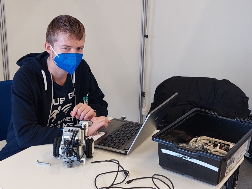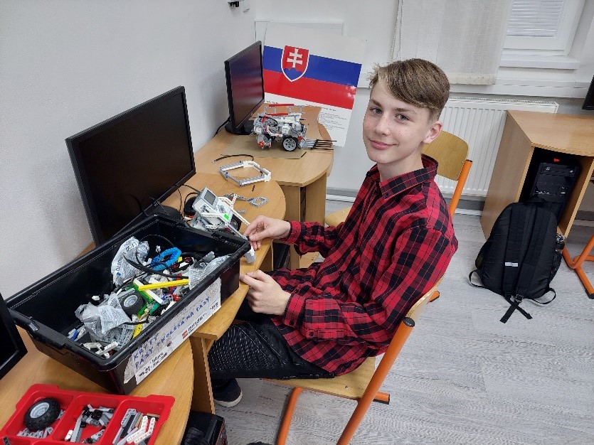 Prikladáme aj naše fotky. Ospravedlňujeme sa, sú z archívu – začiatok tohto školského roka. Obaja sme v karanténe a tak sa nevieme spolu odfotiť. Robotické stavebnice nám doniesol pán učiteľ. Staviame a konzultujeme spolu online.