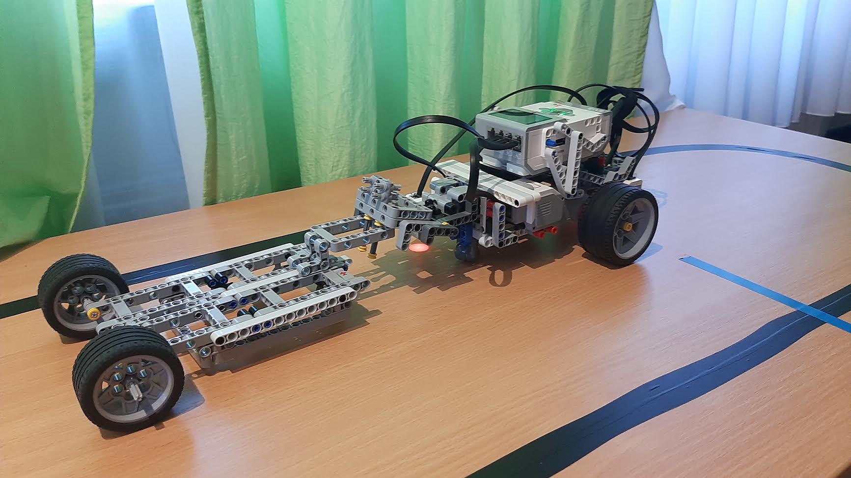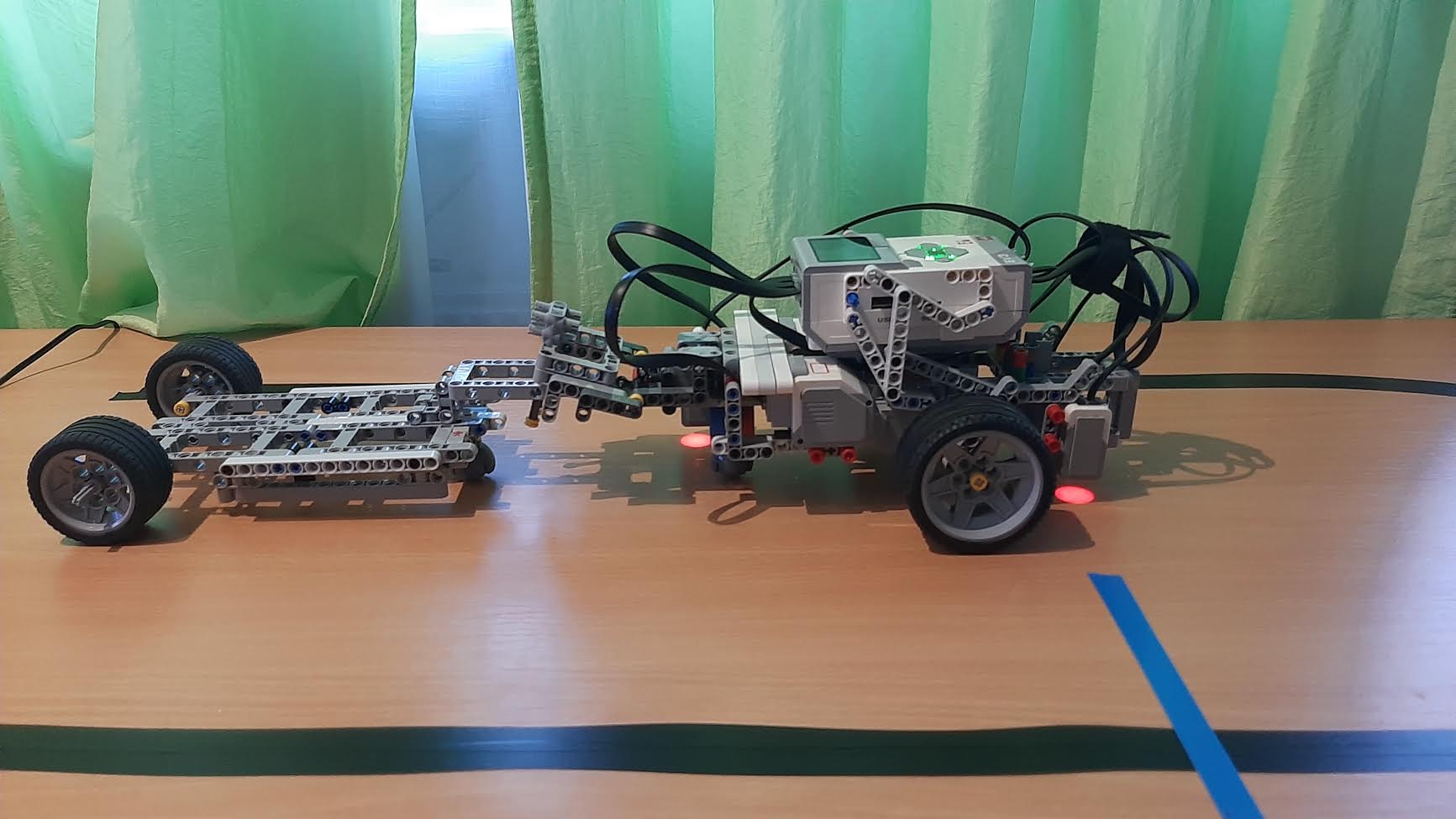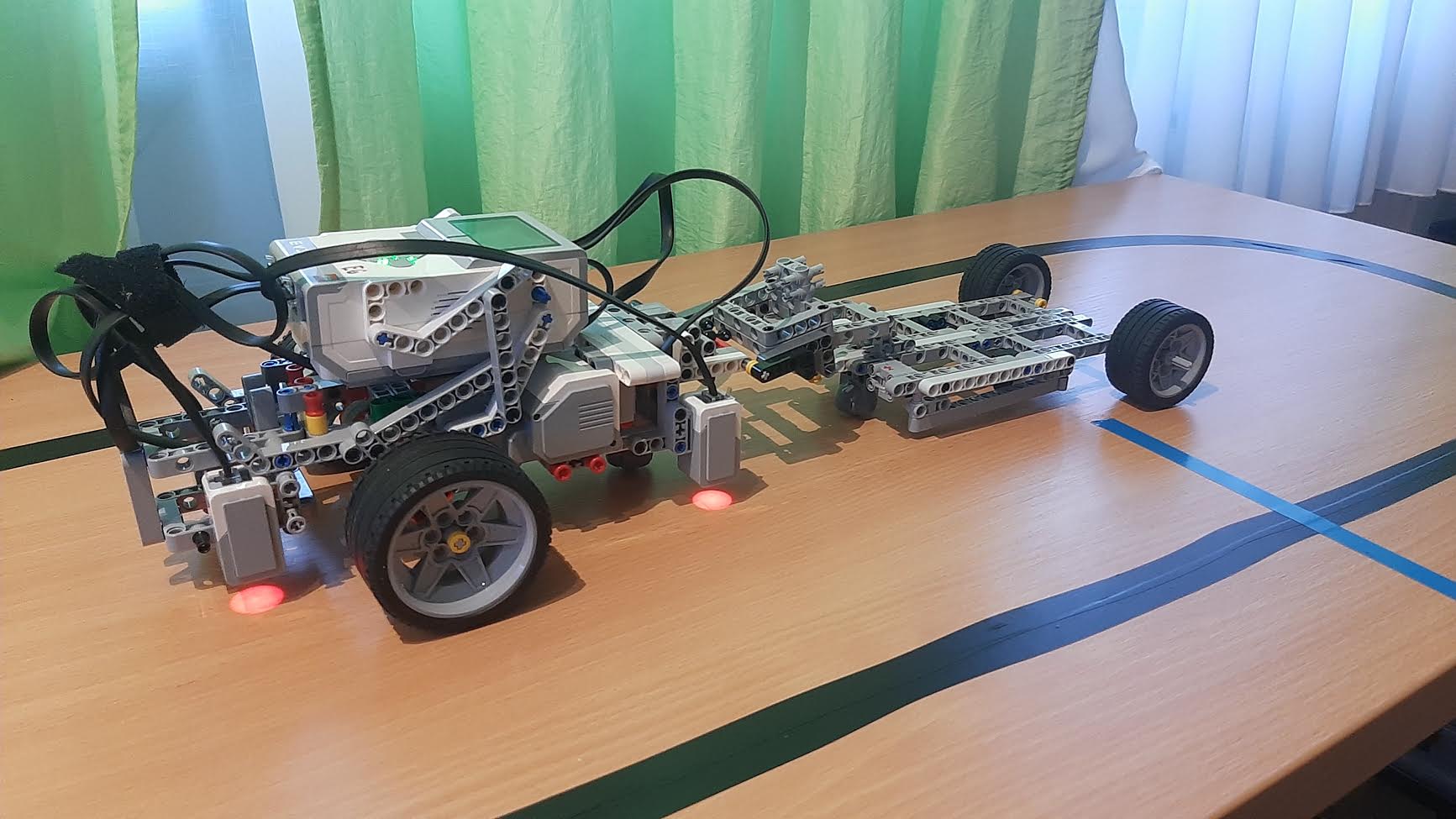 Robotický vozík na prevoz batožiny a výstroje pre športovcov sme zostrojili, tak aby dokázalo samé odpojiť pripojený neriadený vozík na batožinu. Samotné odpojenie prebehne po kontakte robotického vozíka s modrou čiarou. Odpojenie je realizované "odháknutím" prípojného vozíka na batožinu a jeho ponechanie na vykládku. Robotický vozík pokračuje - vracia sa nazad po ďalší vozík. Podobným systémom sa dá robotický vozík dokončiť aj na napojenie ďalších neriadených vozíkov na batožinu.