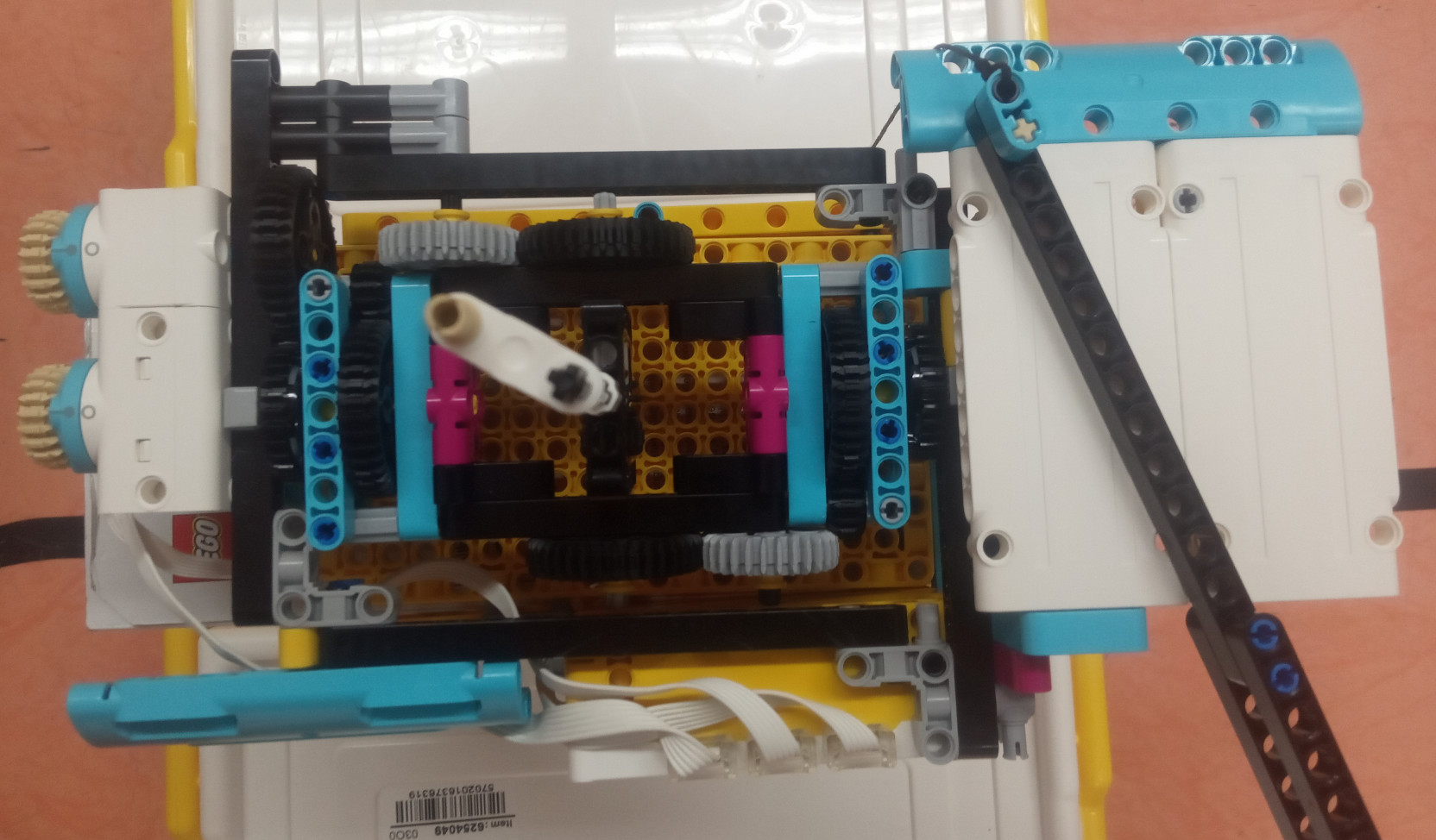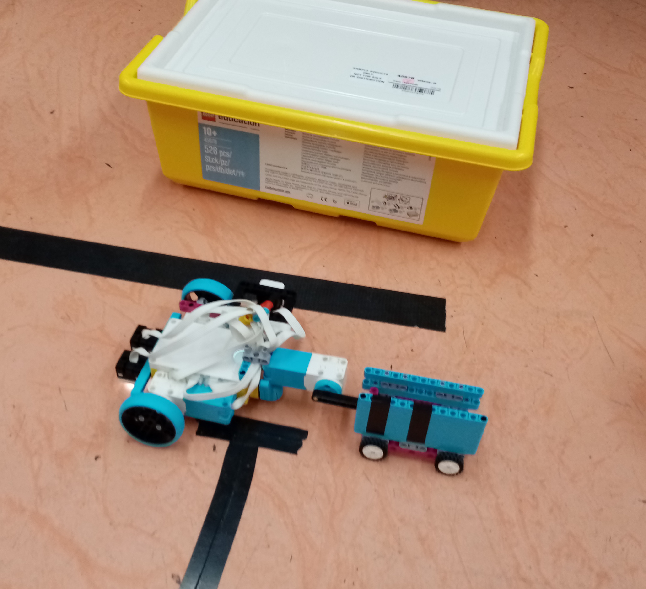 Náš robot má dva svetelné senzory na sledovanie čiary a jeden svetelný senzor na čítanie čiarového kódu. Na prichytenie vozíka k robotovi používa sklápacie rameno a na pohyb kolies dva motory. Svetelný senzor zaznamenáva tri úrovne jasu (vzduch, stenu vozíka a čiaru kódu). Do premennej si zaznamenáva počet čiar v kóde. Potom vezme vozík, napojí sa na čiaru na zemi a ide po nej. Keď oba svetelné senzory zaznamenajú na zemi čiaru zmenia premennú o -1. Keď oba senzory opäť narazia na čiaru a premenná sa vtedy rovná 0 robot vojde do výjazdu. Na konci výjazdu sa zastaví a stočí sa spolu s vozíkom koolmo naň.