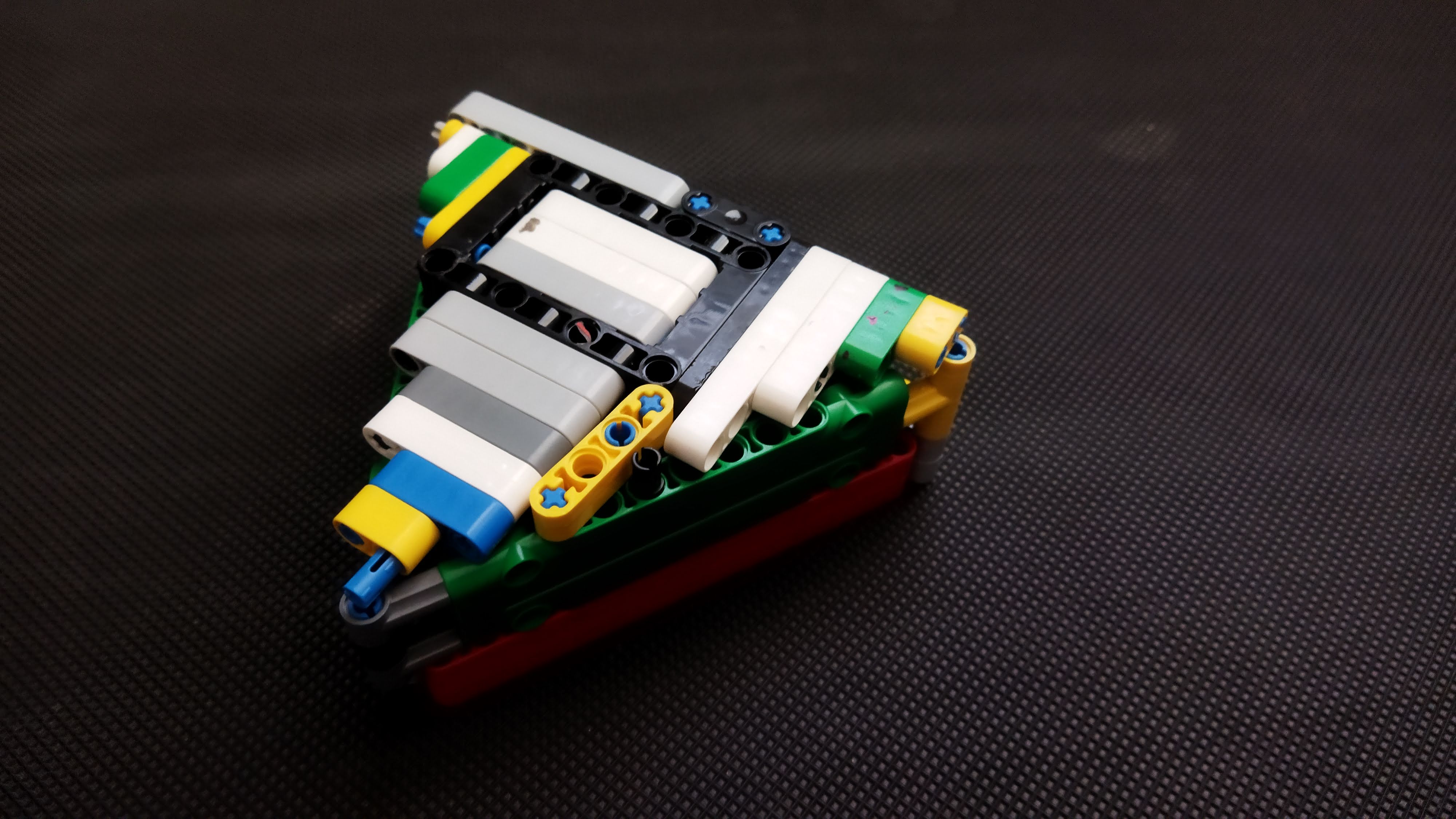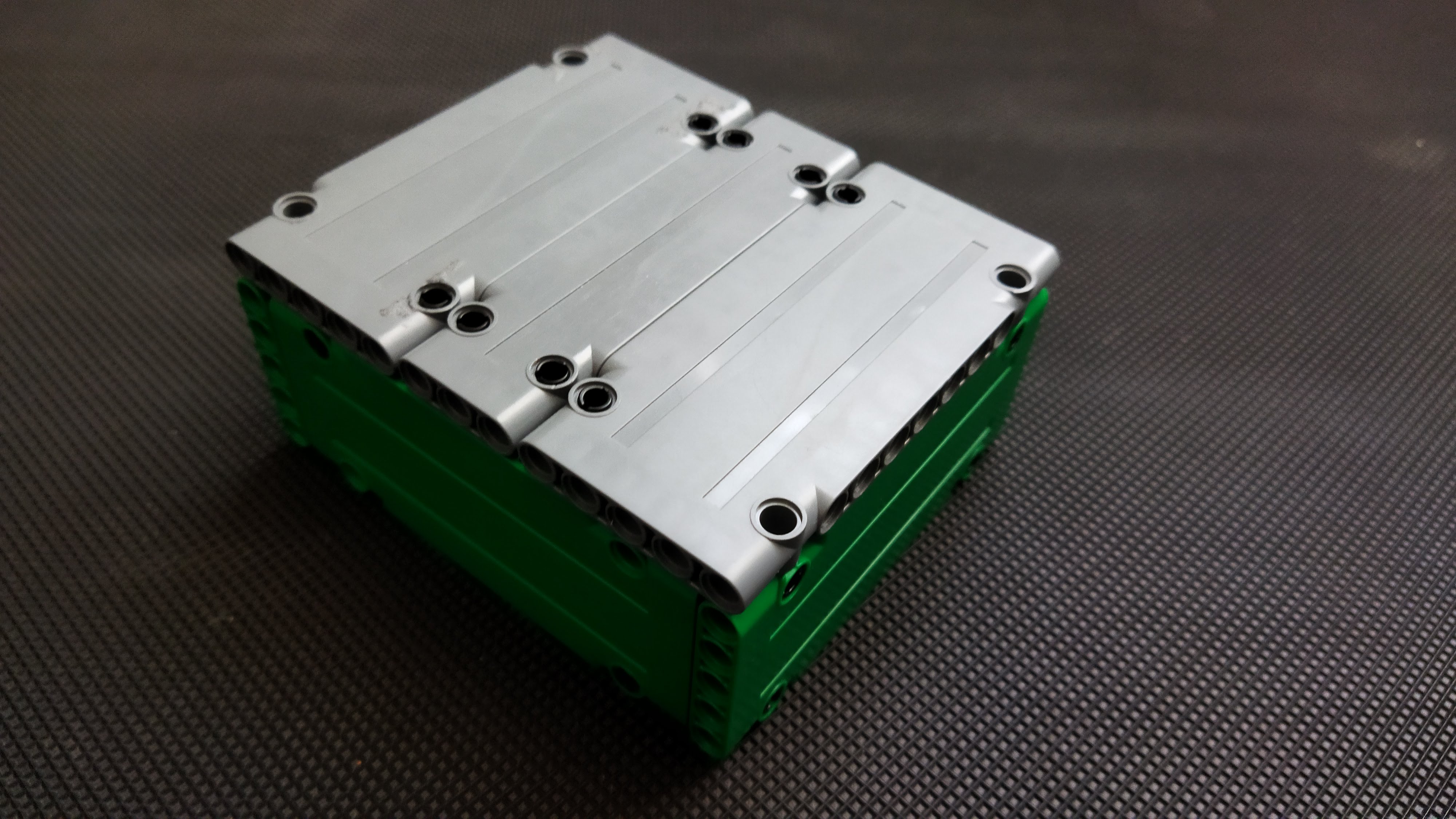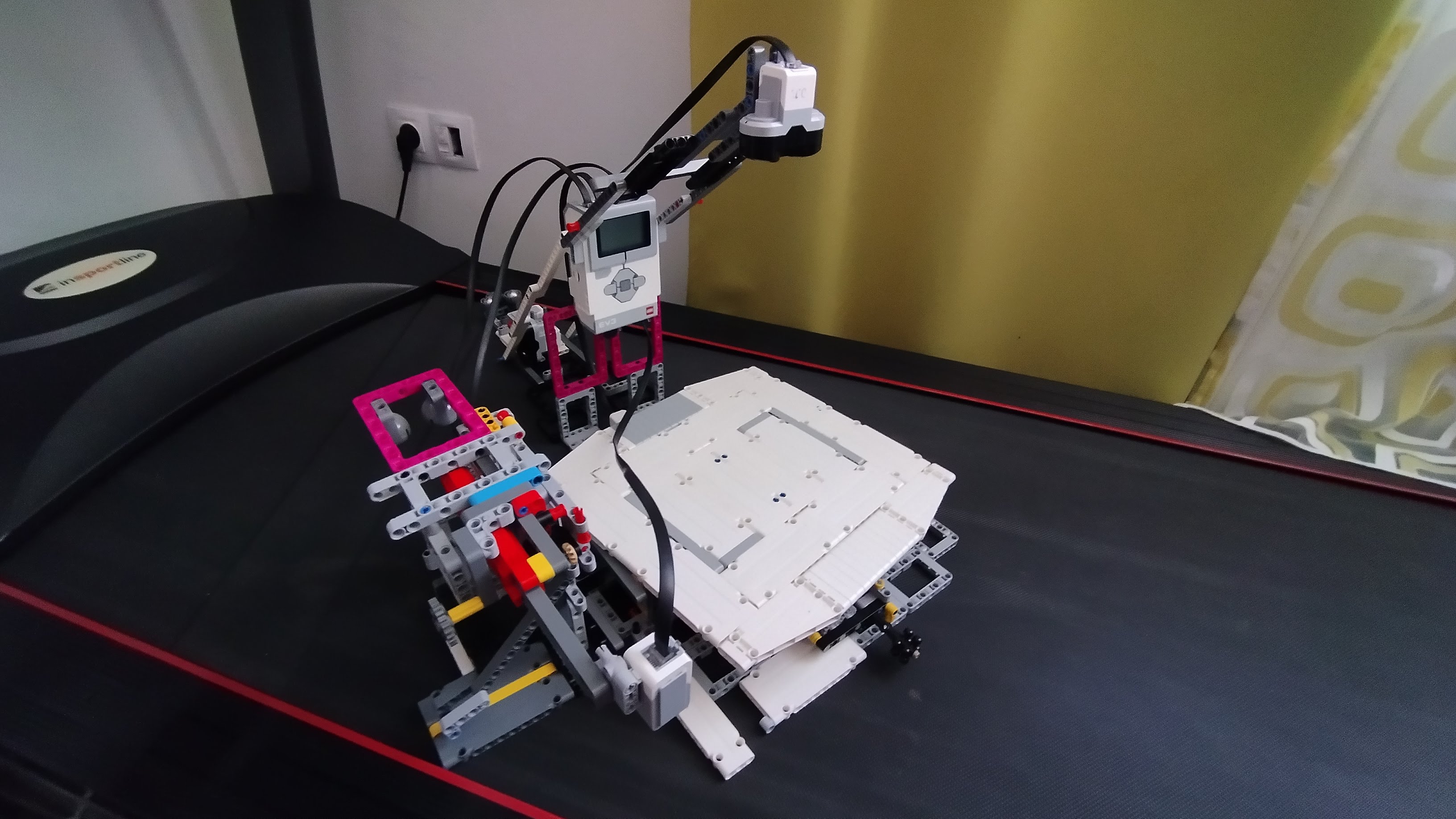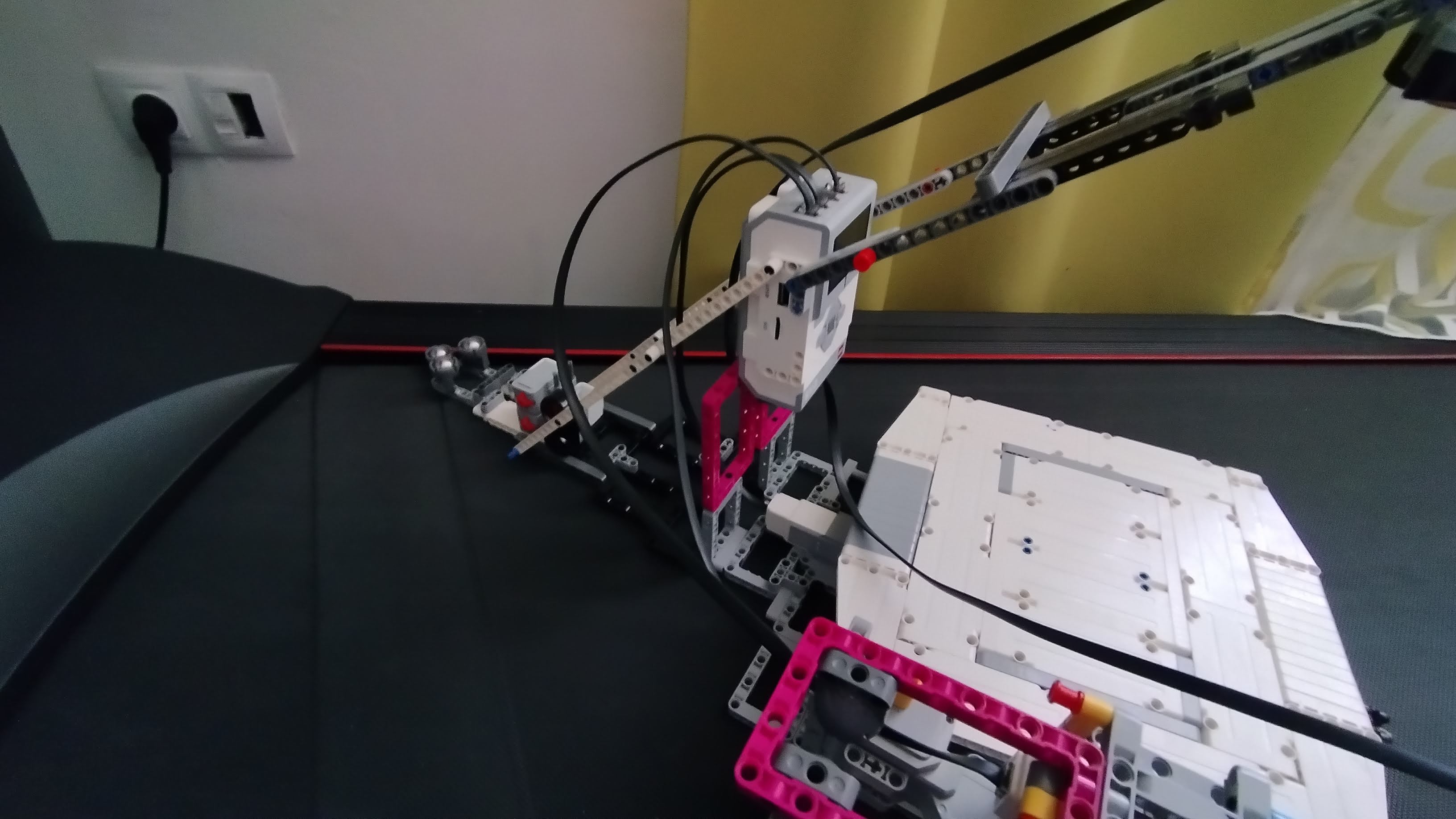 Náš robot sa skladá z otočnej podložky, ultrazvukového senzora ktorý je nad stredom podložky a vysúvacieho ramena ktoré sa vie pohybovať do strán + kocky, ktorá je na „veži“.