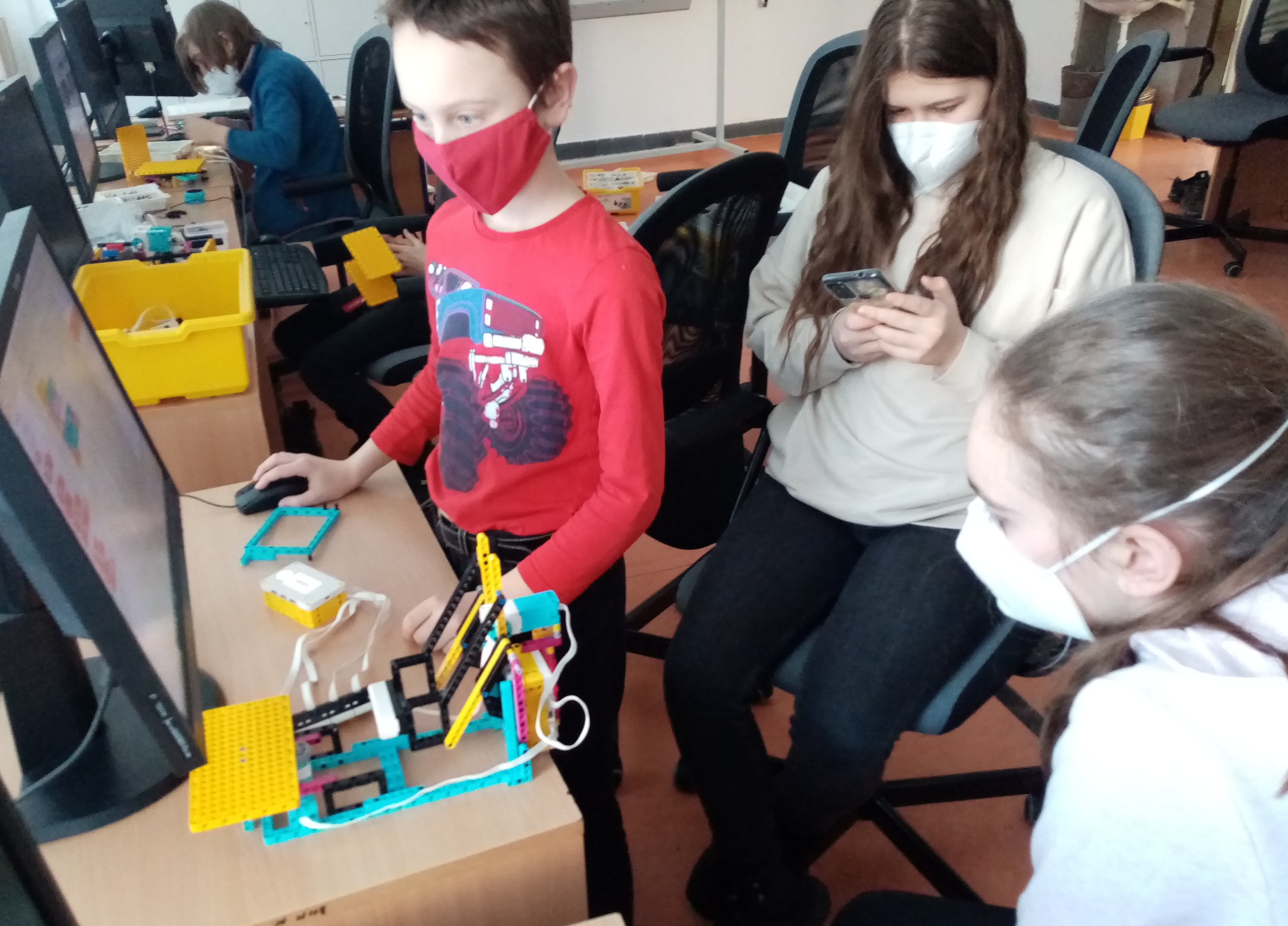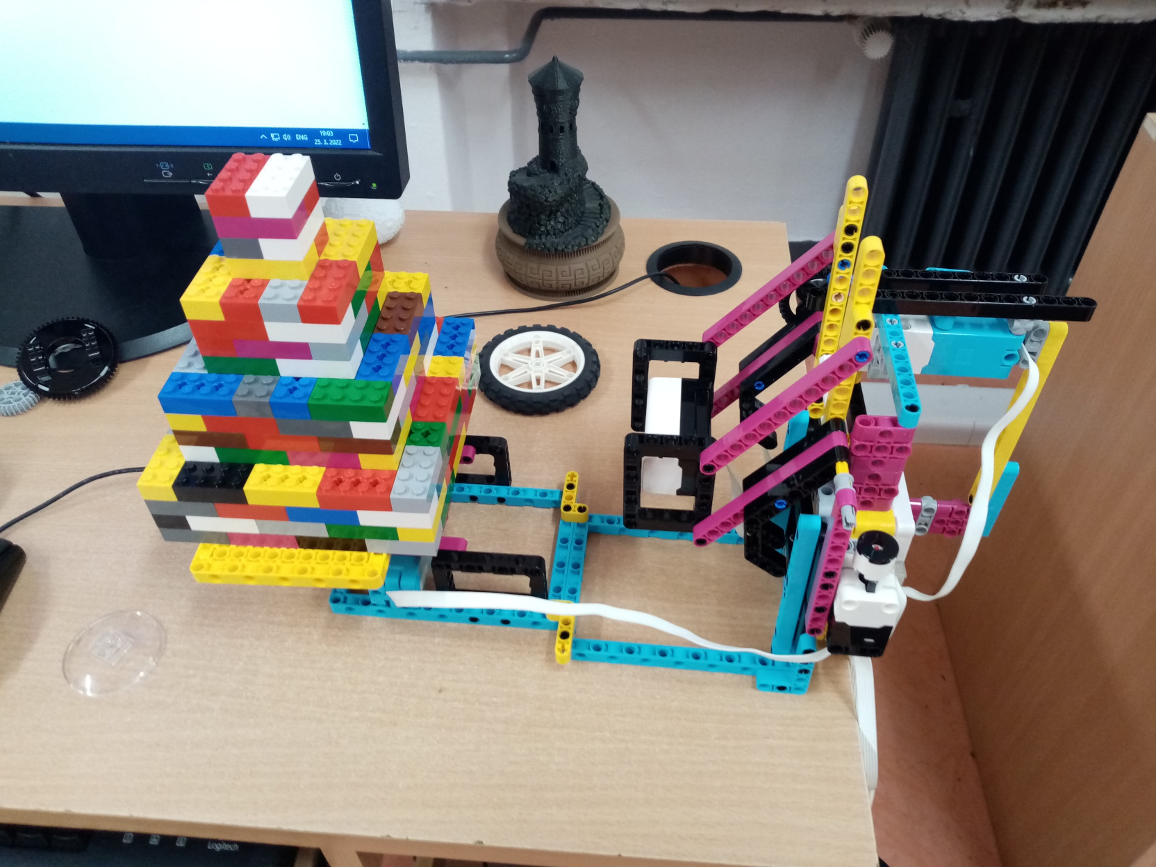 Robot sa skladá z otáčacej plošiny a ramena s ultrazvukovým senzorom. Senzor vždy zostane rovnobežne s držiakom vďaka kosodĺžnikovému tvaru ramena.Rameno je ovládané motorom so spomaľovacím prevodom. Tento motor je spojený s kockou, ktorá je súčasťou držiaka. Na opačnej strane konštrukcie je motor, ktorý pomocou ozubených kolies s prevodom 28:60 otáča plošinu, na ktorej je položený skenovaný predmet. Pred skenovaním sa ultrazvukový senzor nakalibruje podľa rovnej steny, keďže okrem pohybu hore-dole vykonáva aj pohyb dopred-dozadu. Hodnoty naskenované pri kalibrácii budú následne odčítané od novonaskenovaných hodnôt predmetu. Ultrazvukový senzor sa pohybuje smerom hore pričom zaznamenáva 40 hodôt vzdialeností a potom sa vráti naspäť dole. Následne sa plošina otočí o dvanástinu celej otáčky plošiny (64.29 stupňov) a senzor nasníma a pripíše nové hodnoty. Všetky hodnoty sa zapisujú do listu, ktorý má ale istý limit zapísaných hodnôt, a preto sa skenovanie predmetu musí rozdeliť na dve časti. Po každej časti treba aktuálny list ručne exportovať do textového súboru, ktorý potom Python načíta. Po naskenovaní aj exportopvaní druhej časti predmetu, python spracuje údaje na súradnice a pokúsi sa predmet nakresliť pomocou čiar. Na informatike sme sa učili python a kreslili sme v Tkinter, tak sme použili ten. Niektoré príkazy nám pomohol vedúci nájsť na internete. Program zobrazí predmet zo 6 rôznych strán - vždy predný a zadný profil. Ak je niektorý bod priďaleko, tak sa vynechá. Niekedy senzor predmet nezachytí. Po stlačení tlačidla python ukáže ďalšiu stranu. Obrázky sme aj ručne ofarbili. Proces skenovania trvá cca. 5 minút.
