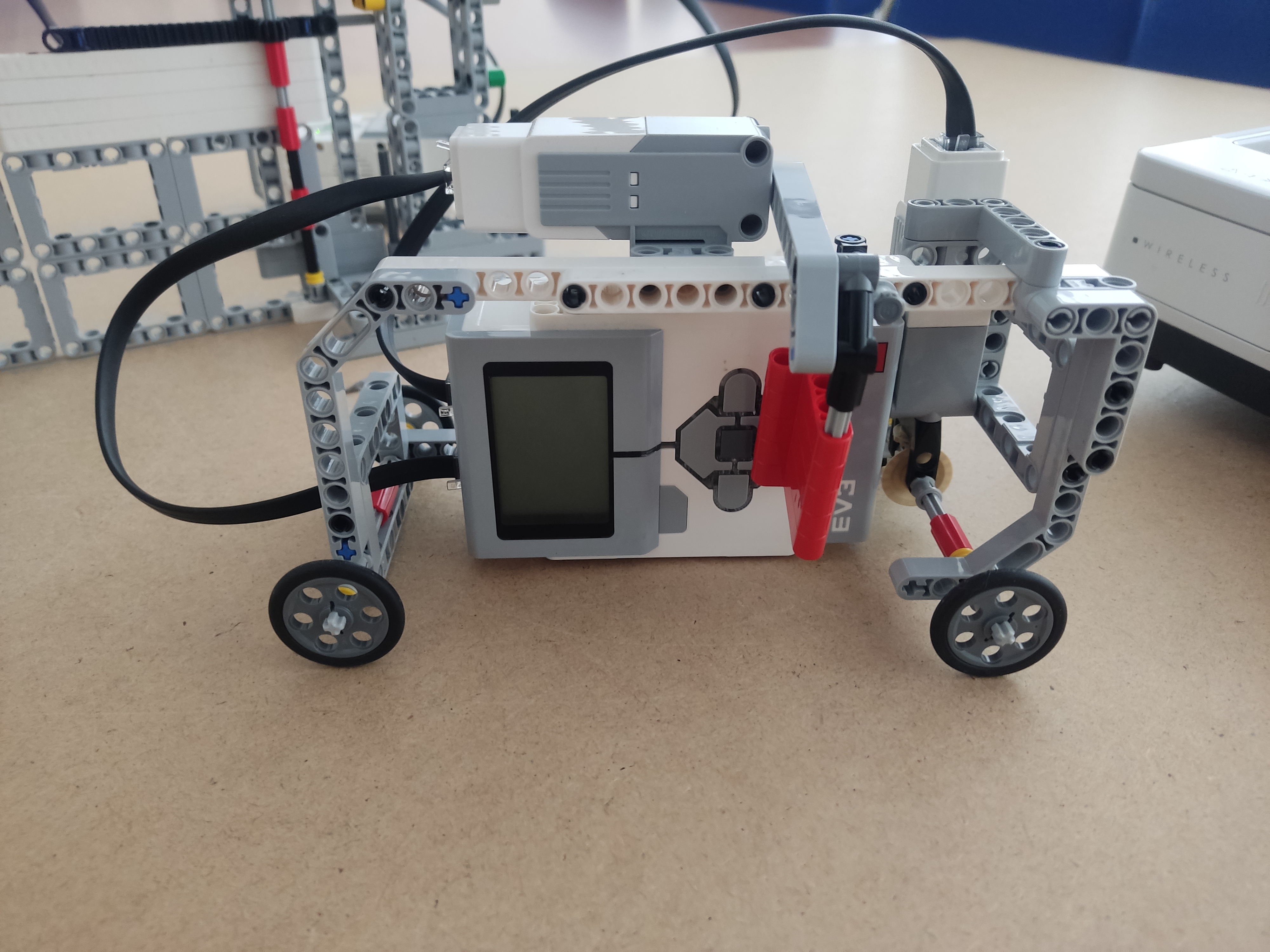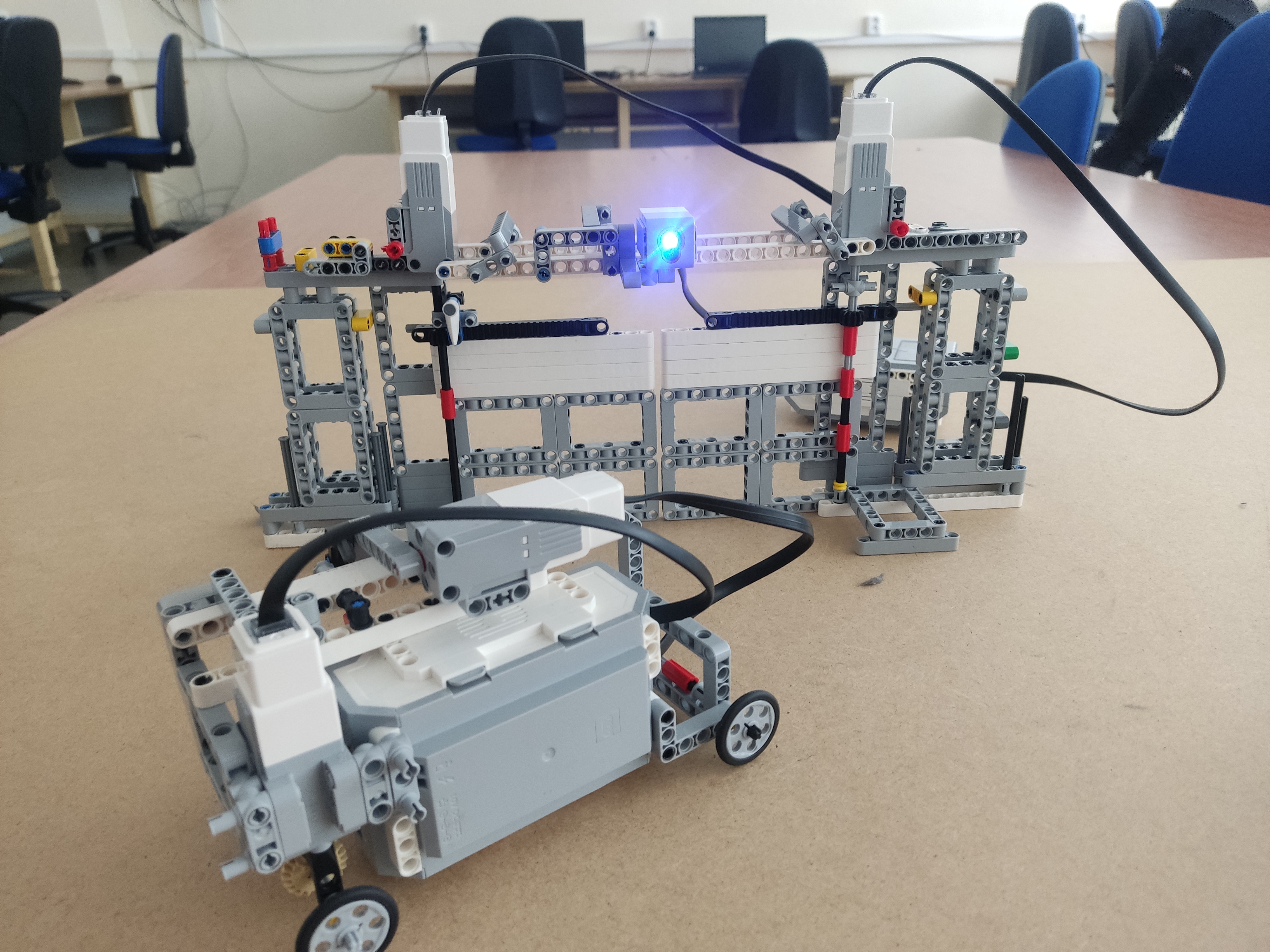 Program, ktorý sme vytvorili je veľmi jednoduchý robot ide dobredu o určitu vzdialenosť. Zastaví pred bránou, aby dal znamenie. Malý motor sa otočí o konkrétny počet stupňov, aby bol vo výške farebného senzora. Farebný senzor zaznamená, že ide o červenú farbu, spustí motory a otvorí bránu.