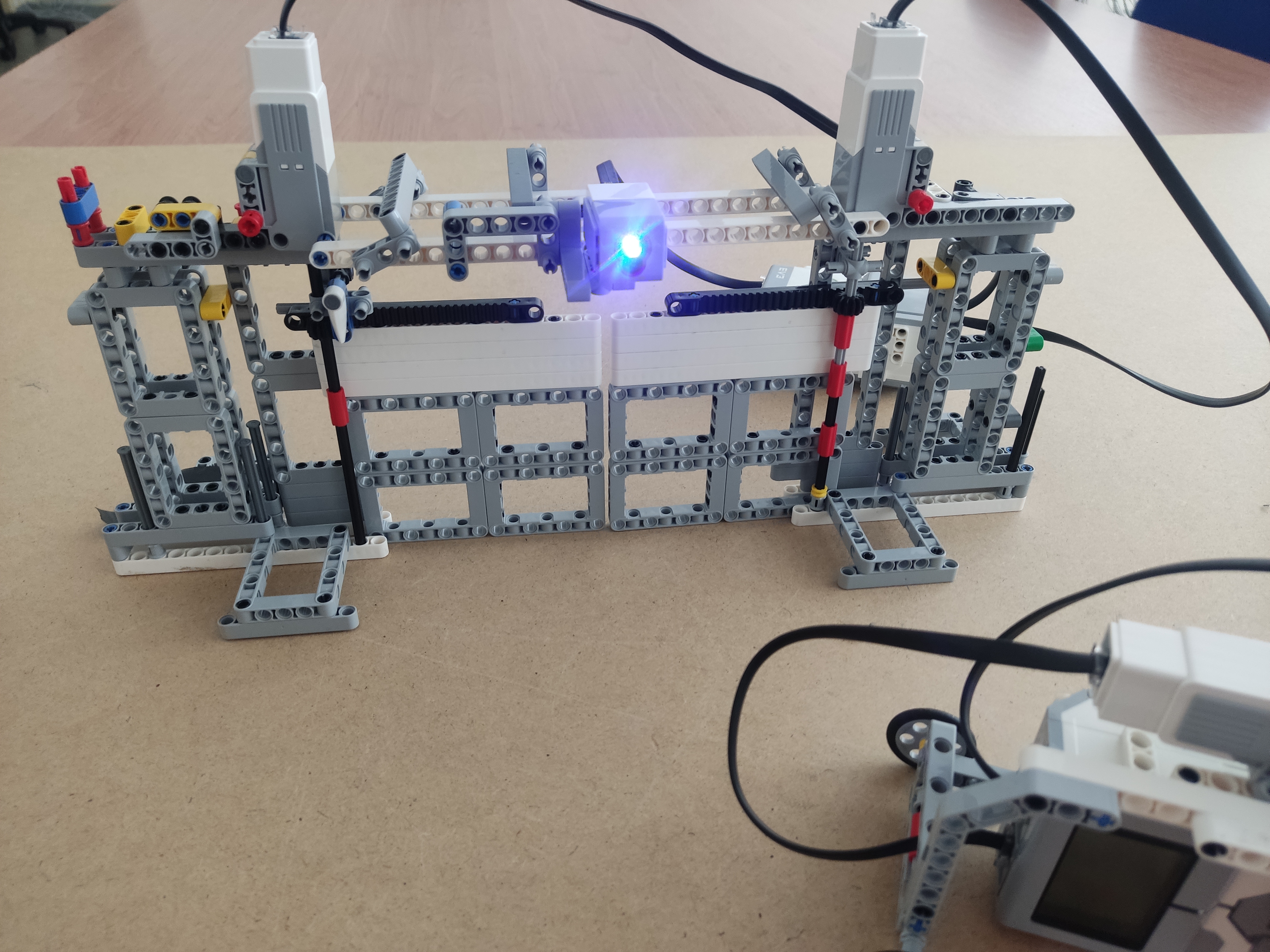 Našu bránu sme vytvorili, aby sa otvárala horizontálne. Použili sme pri otváraní brány ozubený hrebeň a ozubené koliesko. Postavili sme jednoduchého robota s prevodmi, ktorý pomocou malého motora otáča ramenom a ukazuje červenú vlajku. Touto červenou vlajkou dáva znamenie farebnému senzoru, aby otvoril bránu na 8 sekúnd.