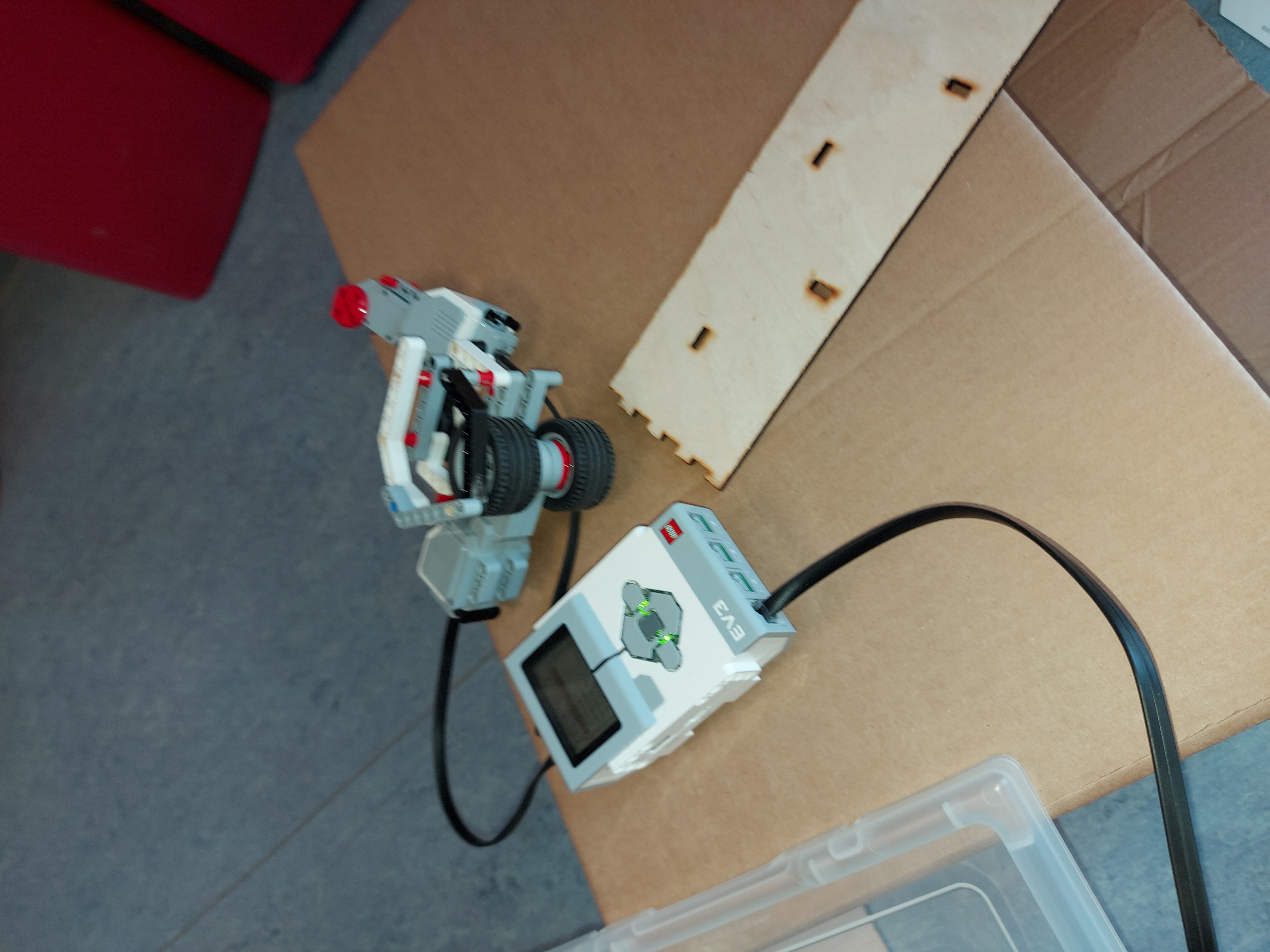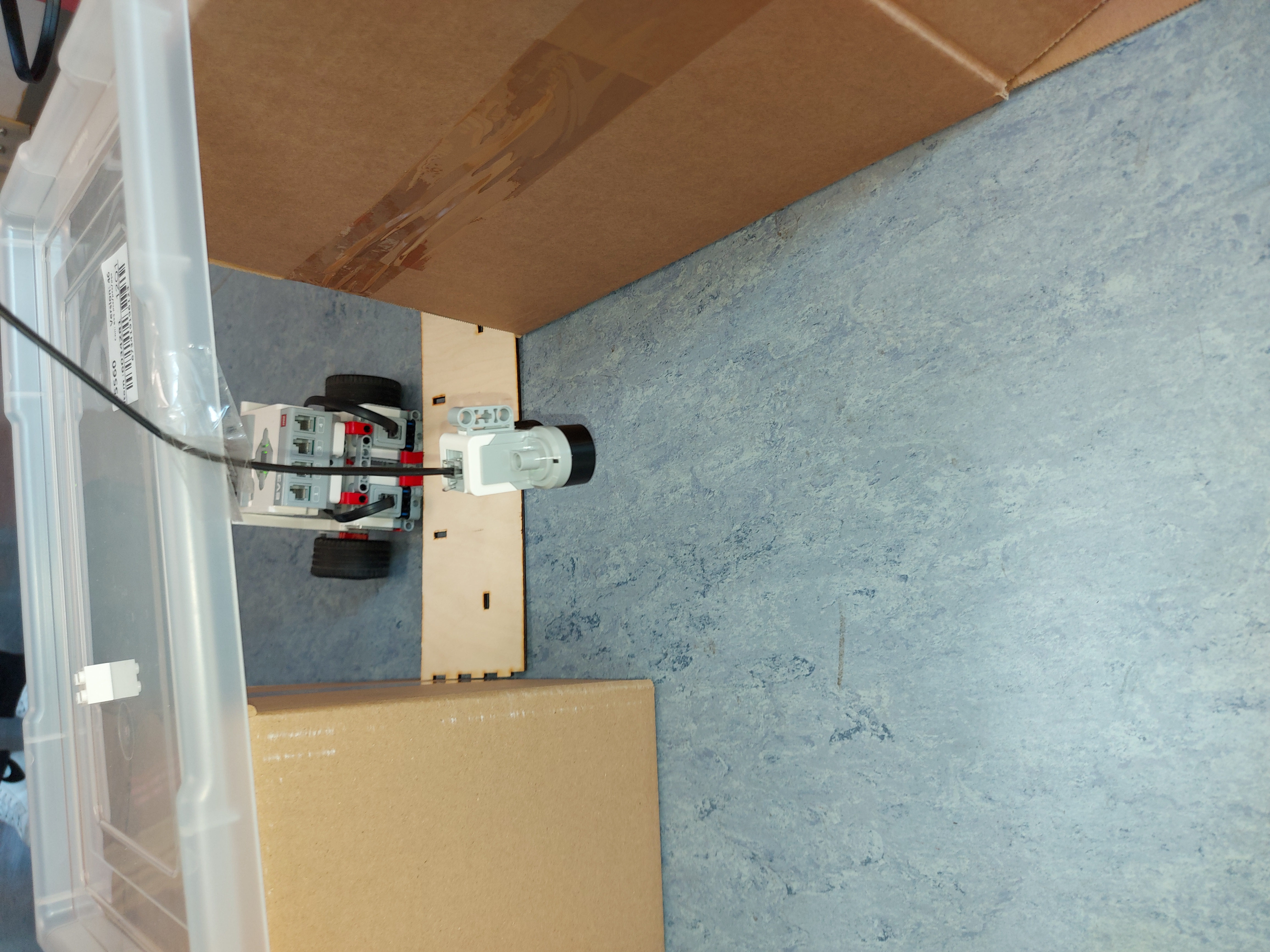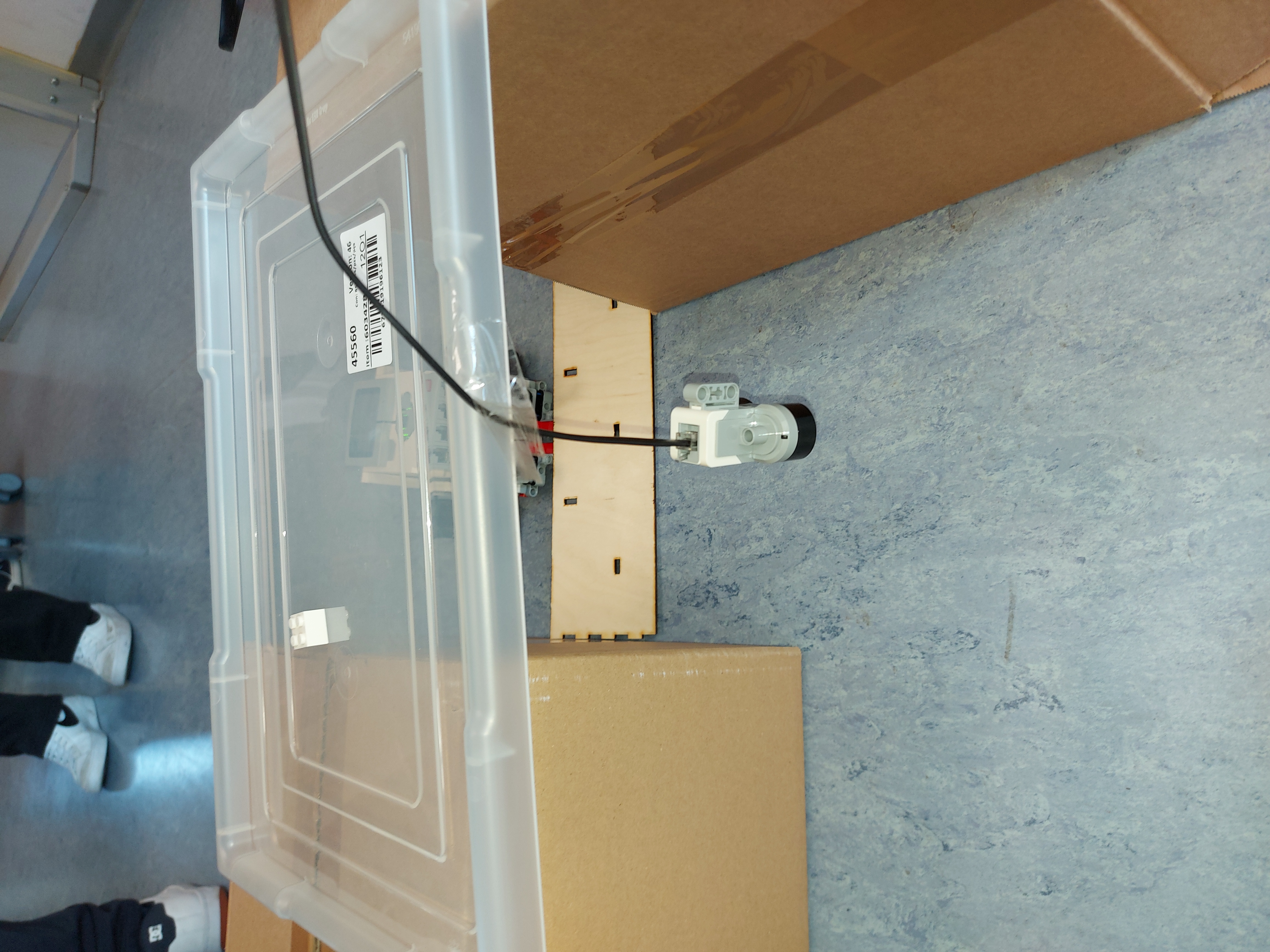 Wir haben uns wieder für die Hasenaufgabe entschieden. Hierfür haben wir einen Motor mit Reifen verwendet, der das Holztor von links nach rechts schiebt. Wir haben vor dem Dach einen Bewegungssensor geklebt und ihn so programmiert, dass er sobald sich etwas in seinem Sensorstrahl bewegt, einen Befehl an den LegoComputer sendet und der dann die Reifen zum Drehen bringt, welche schließlich das Tor nach links schieben.