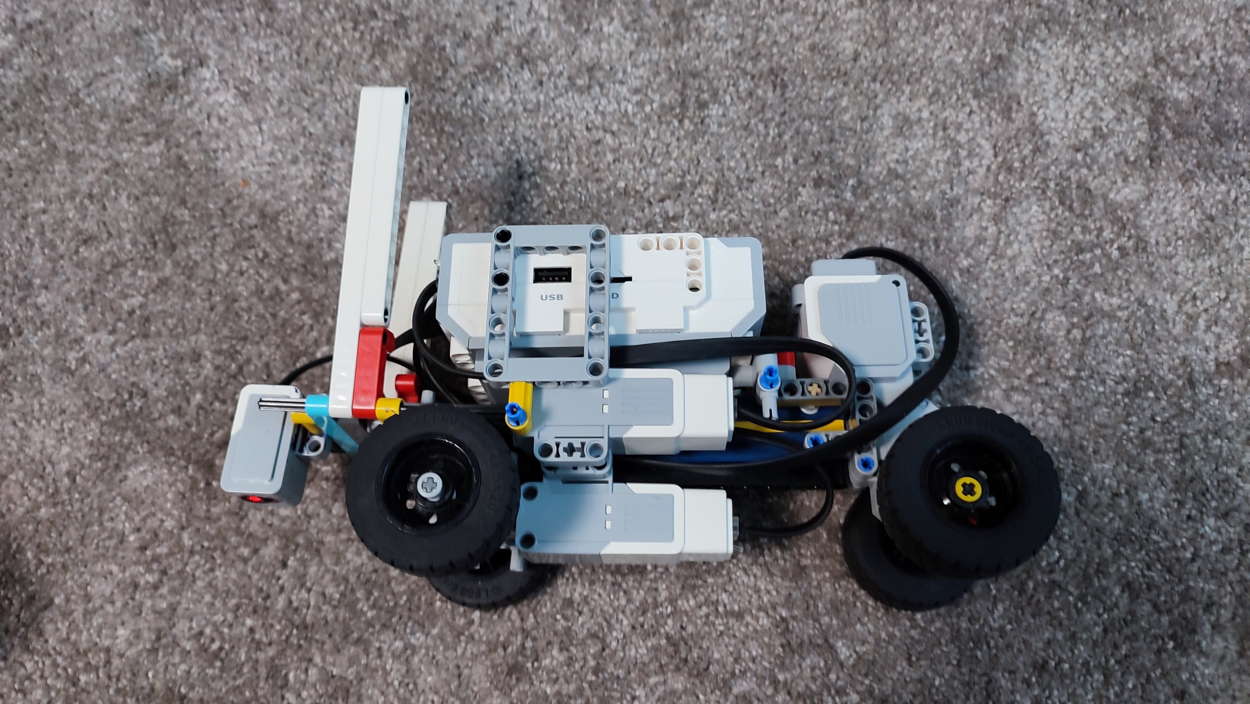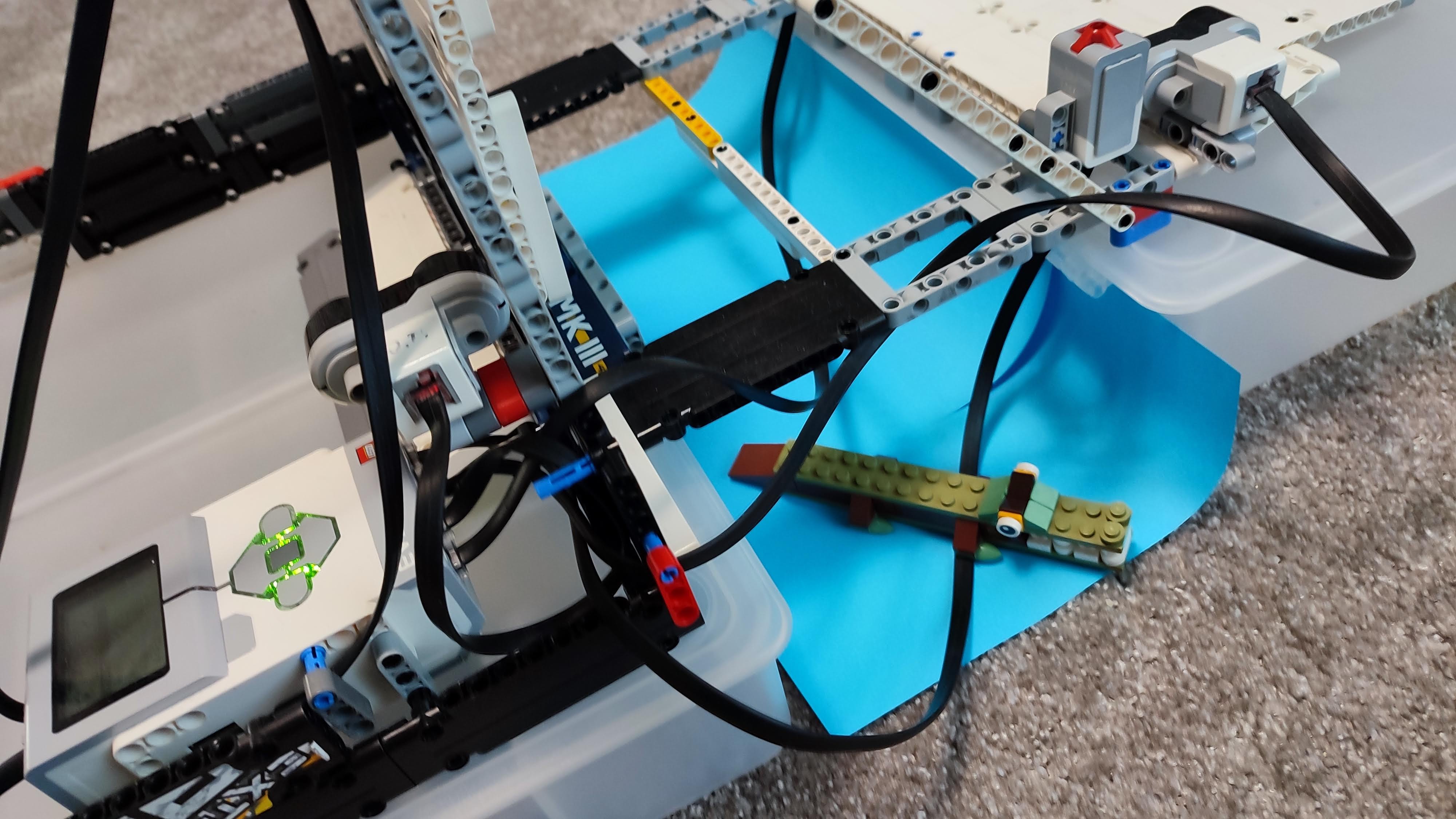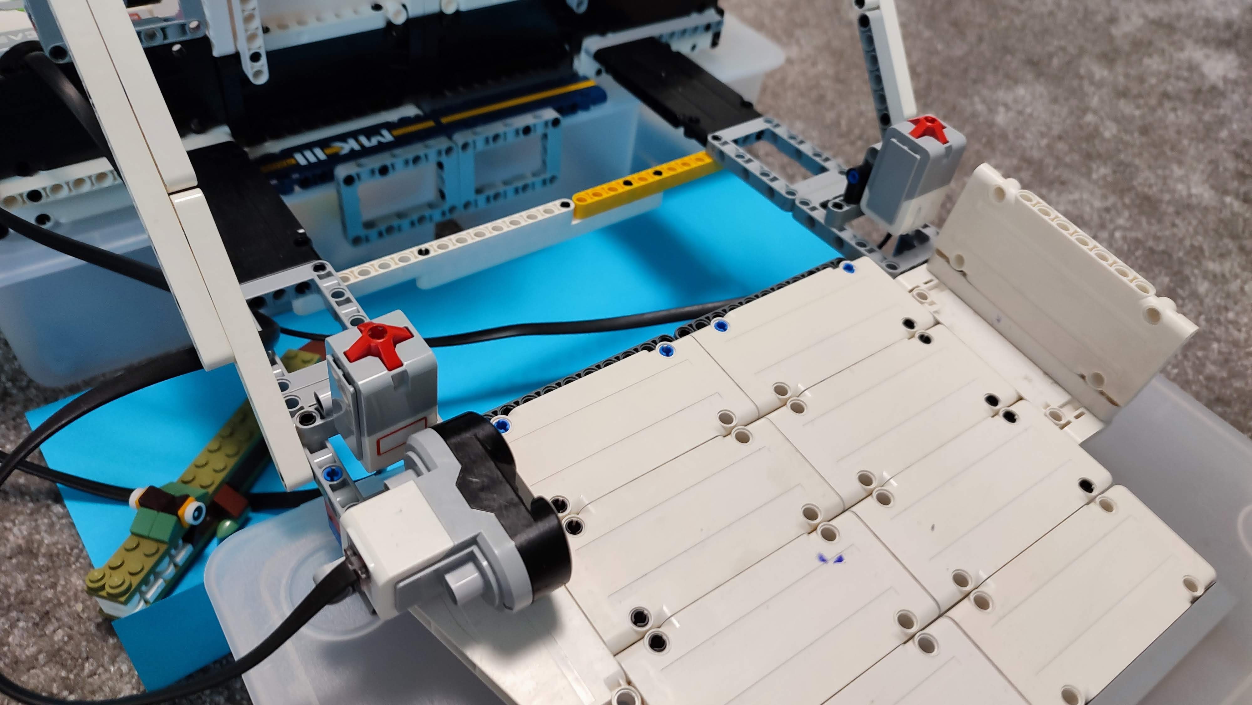 Najprv sme postavali plochu o ktorú sa brána oprie keď je v dolnej polohe. A následne sme postavali rampu (časť po ktorej robot prechádza) a to čo vedie z jednej strany na druhú keď je rampa zdvihnutá. Potom sme postavali hradby a dve spojené veže ktoré s pomocou dvoch medium motorov dokážu pritiahnuť rampu do hornej polohy. Na plošine po ktorej robot prechádza ku priepasti sme dali dva touch senzory na ktoré auto naťuká heslo a jeden ultrazvukový senzor ktorý meria či tam robot reálne je a ak by tam robot nebol tak brána autu pošle cez Bluetooth správu že mu nespustí most a auto tým pádom nepôjde dopredu. Ale ak robot naťuká heslo a brána uvidela senzorom robota tak pošle robotovi signál že môže prejsť. Keď robot ide do pevnosti tak brána čaká kým druhý ultrazvukový senzor uvidí robota a potom sa brána zavrie.