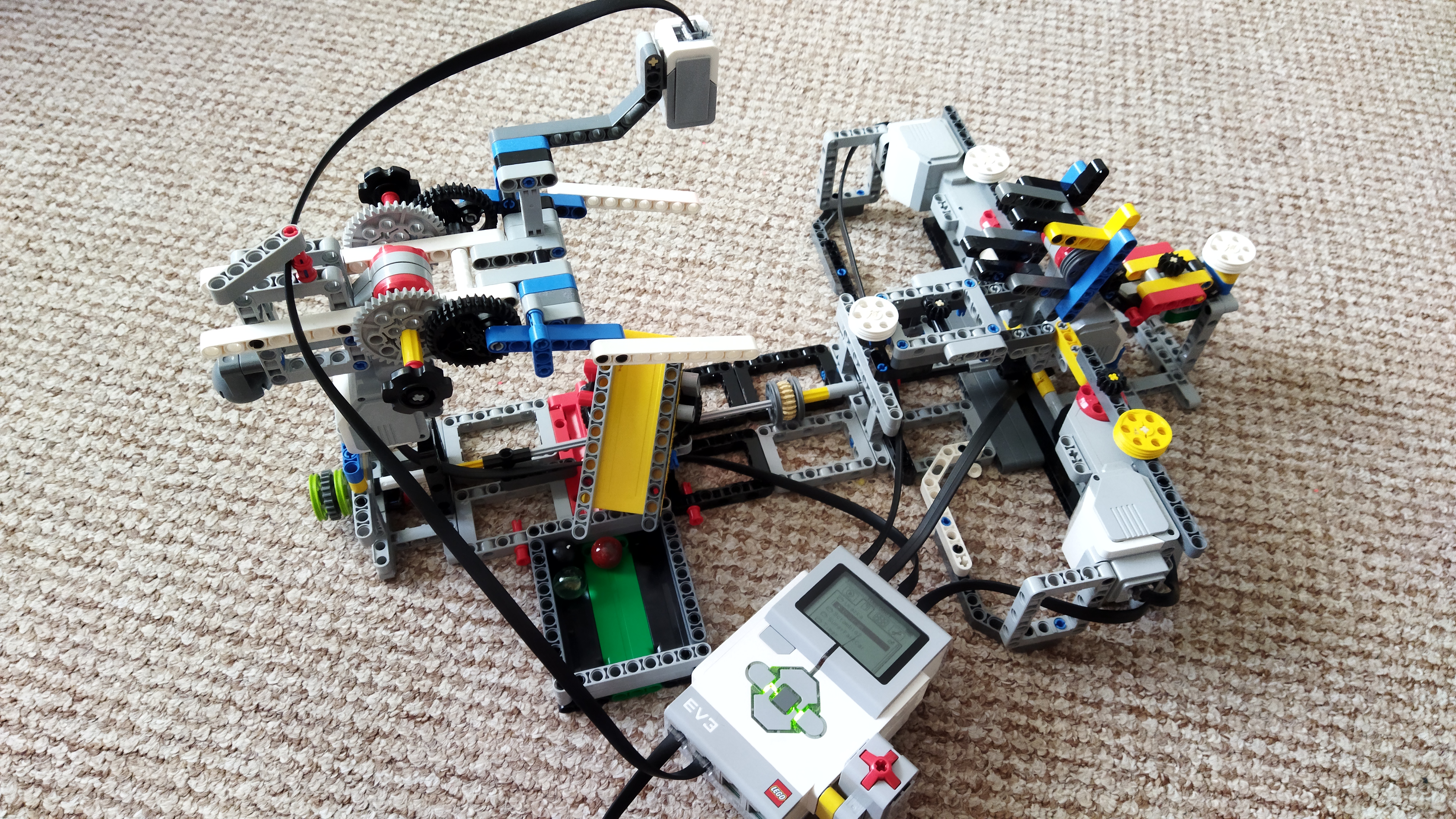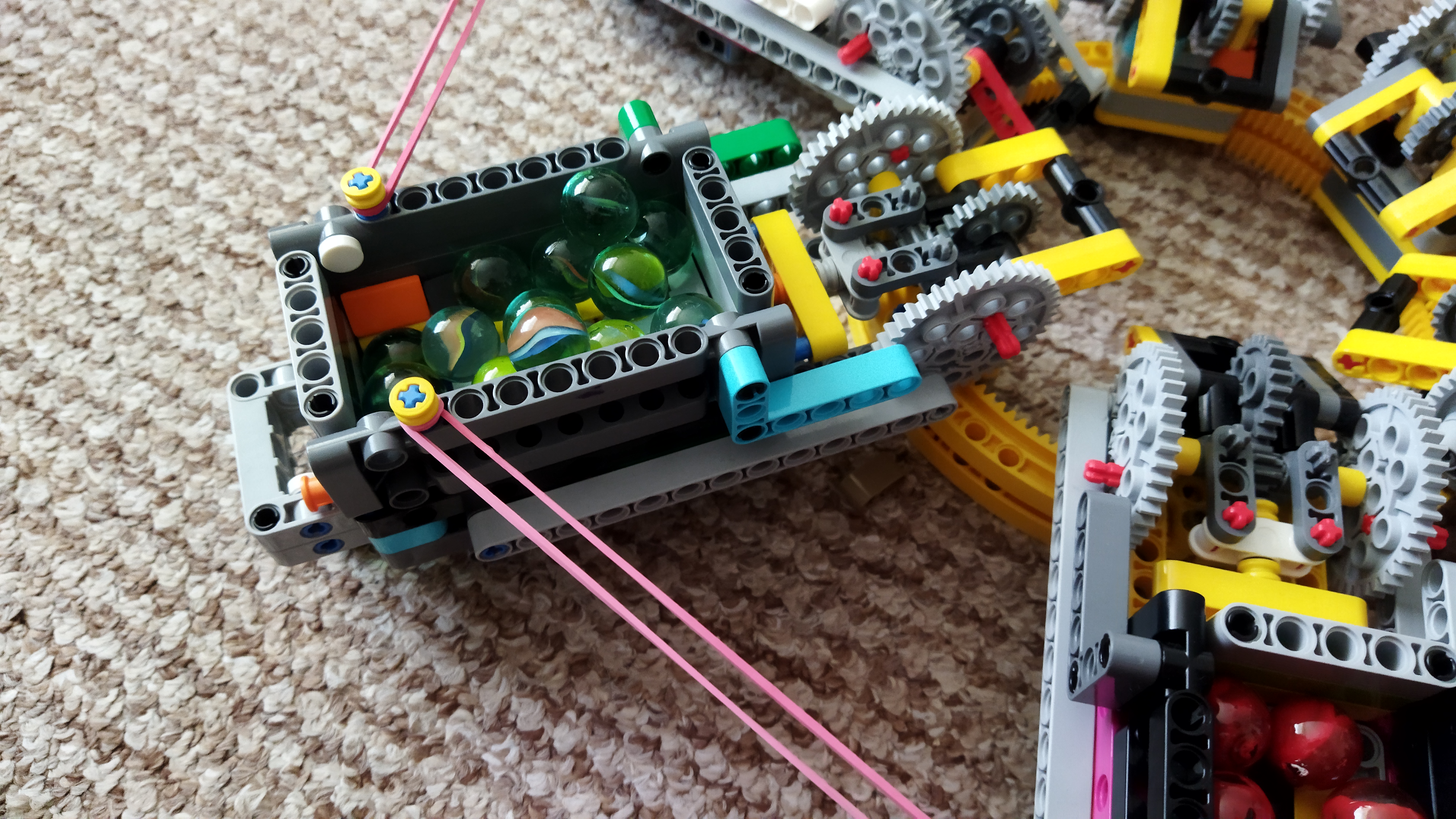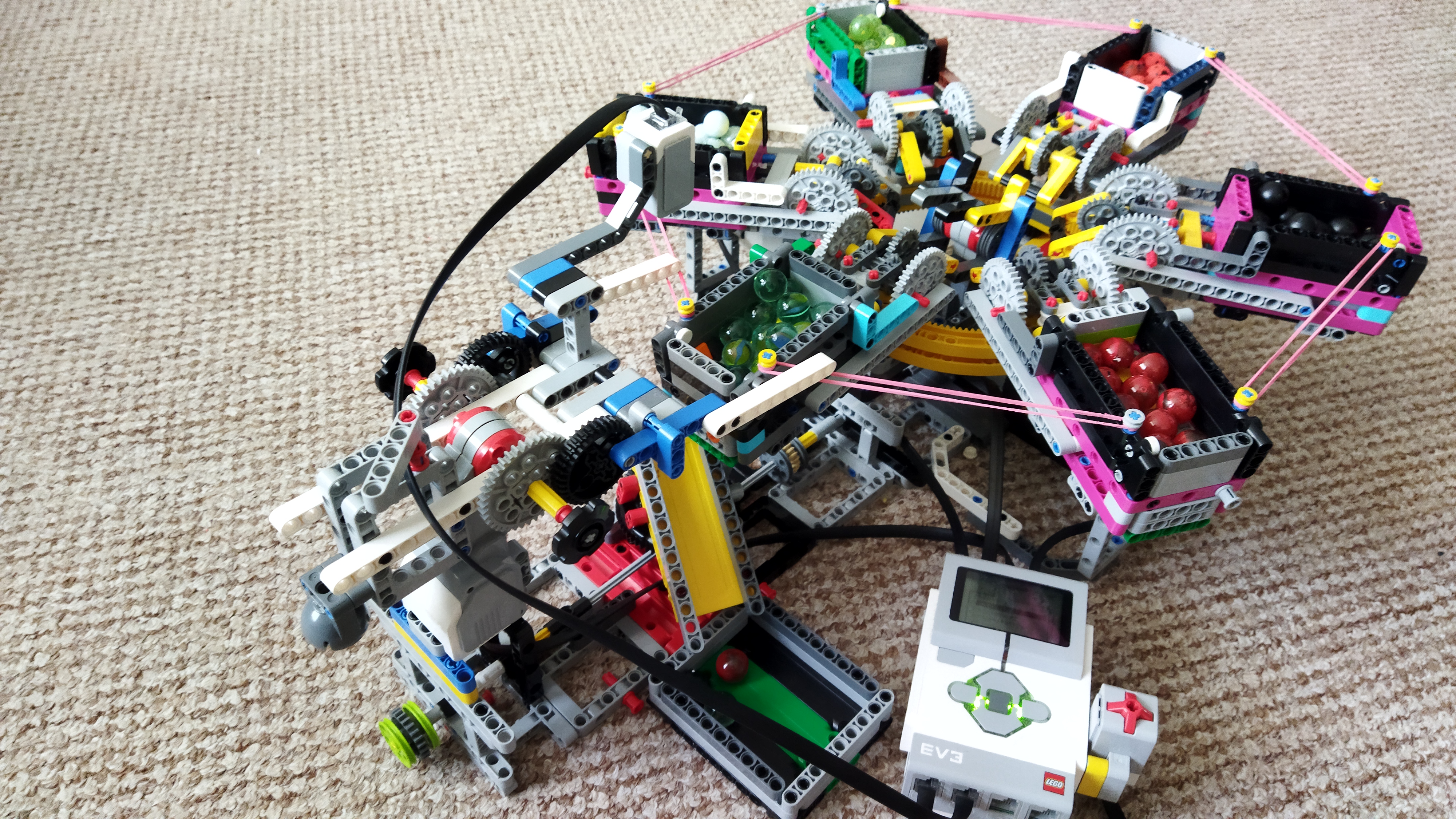 Najprv sme vymysleli vysúvací mechanizmus na sklenené guličky správnej veľkosti. Potom sme ho prerobili tak, aby sme vysúvanie a zasúvanie vedeli ovládať pohybom páčky. Urobili sme 5 ďalších kópii a plánovali sme ich dať vedľa seba, aby okolo nich chodil vozíček, ale potom nás napadlo dať ich do kruhu, aby ich mohol vysúvať jeden motor. Po postavení konštrukcie sme zistili, že musíme prirobiť nejaké „drncátko“ aby guličky zapadávali do otvoru na vydávanie.