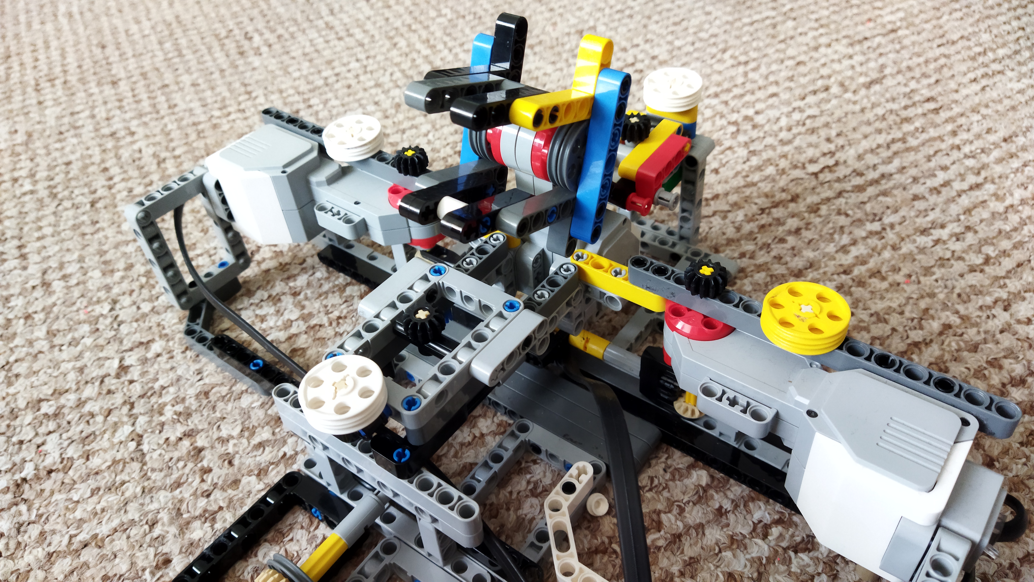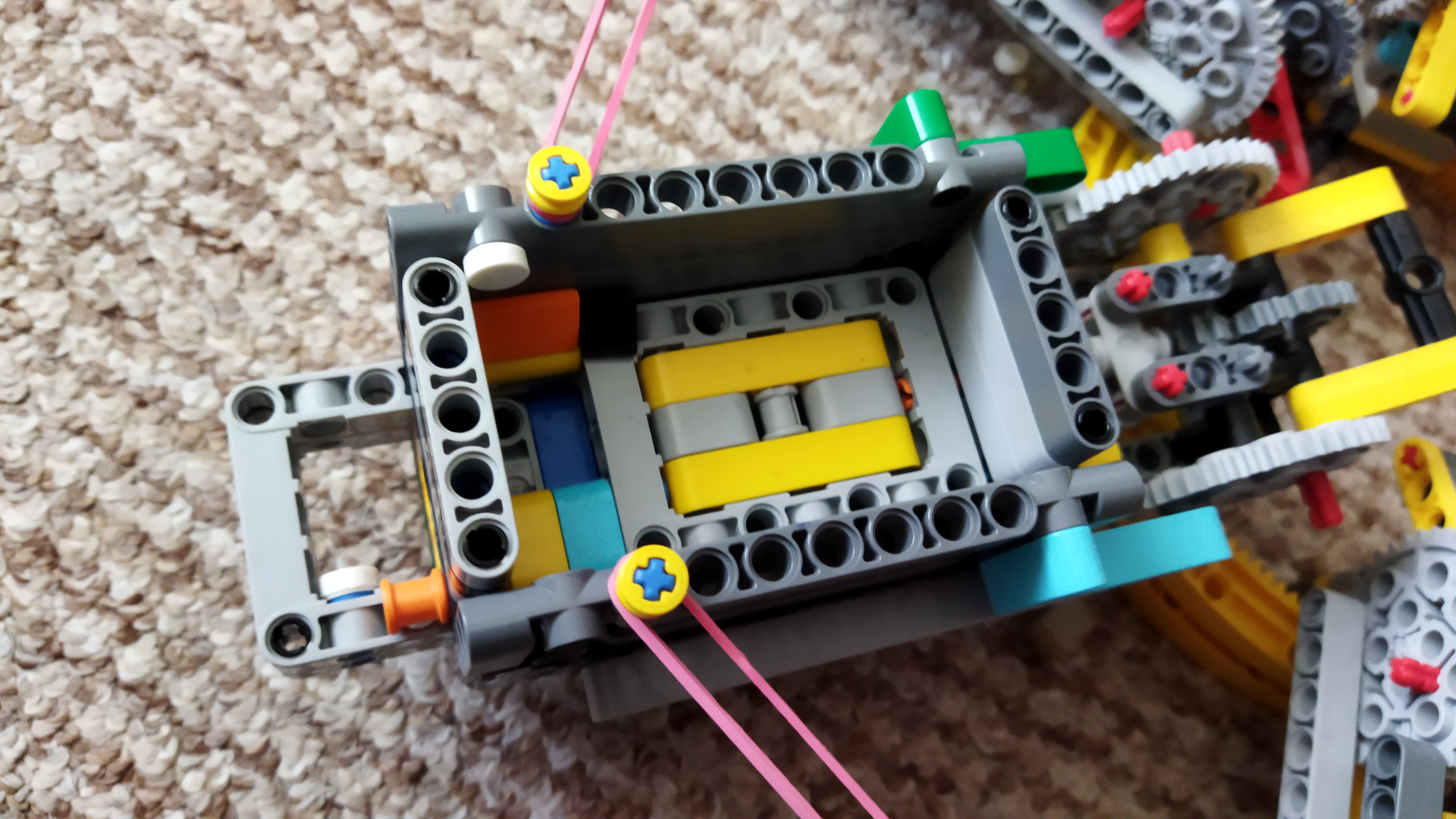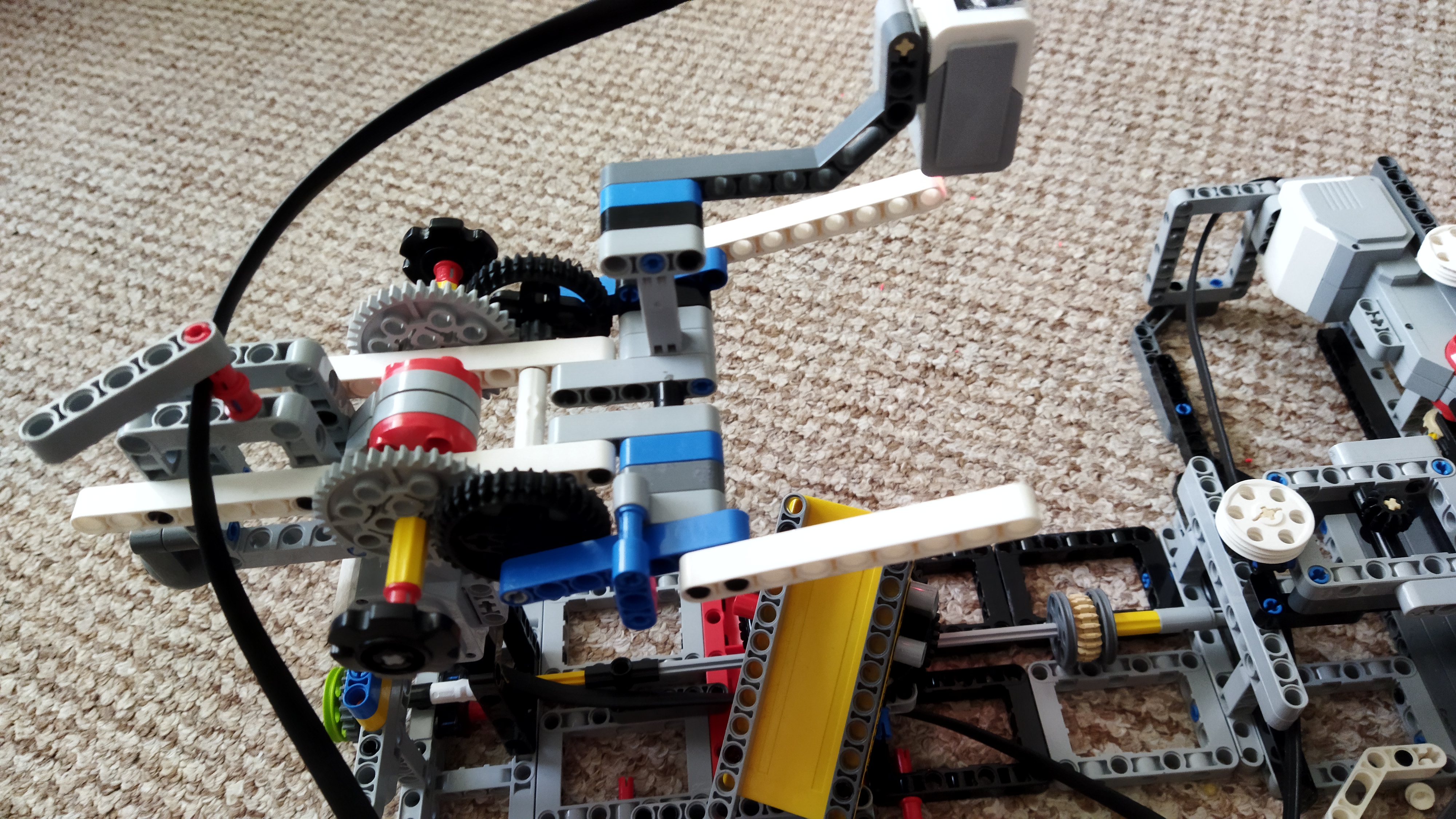 Najprv sme vymysleli vysúvací mechanizmus na sklenené guličky správnej veľkosti. Potom sme ho prerobili tak, aby sme vysúvanie a zasúvanie vedeli ovládať pohybom páčky. Urobili sme 5 ďalších kópii a plánovali sme ich dať vedľa seba, aby okolo nich chodil vozíček, ale potom nás napadlo dať ich do kruhu, aby ich mohol vysúvať jeden motor. Po postavení konštrukcie sme zistili, že musíme prirobiť nejaké „drncátko“ aby guličky zapadávali do otvoru na vydávanie.