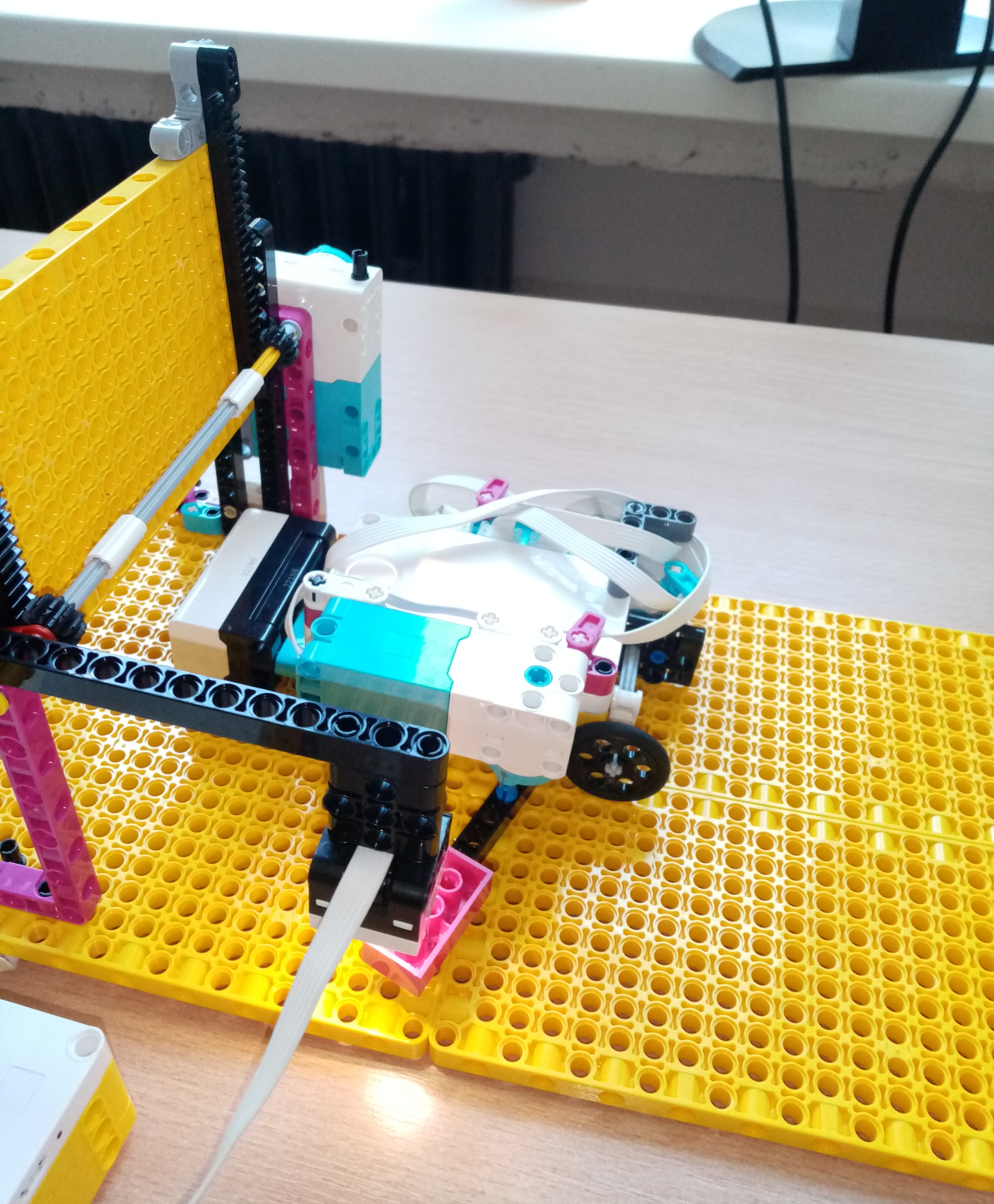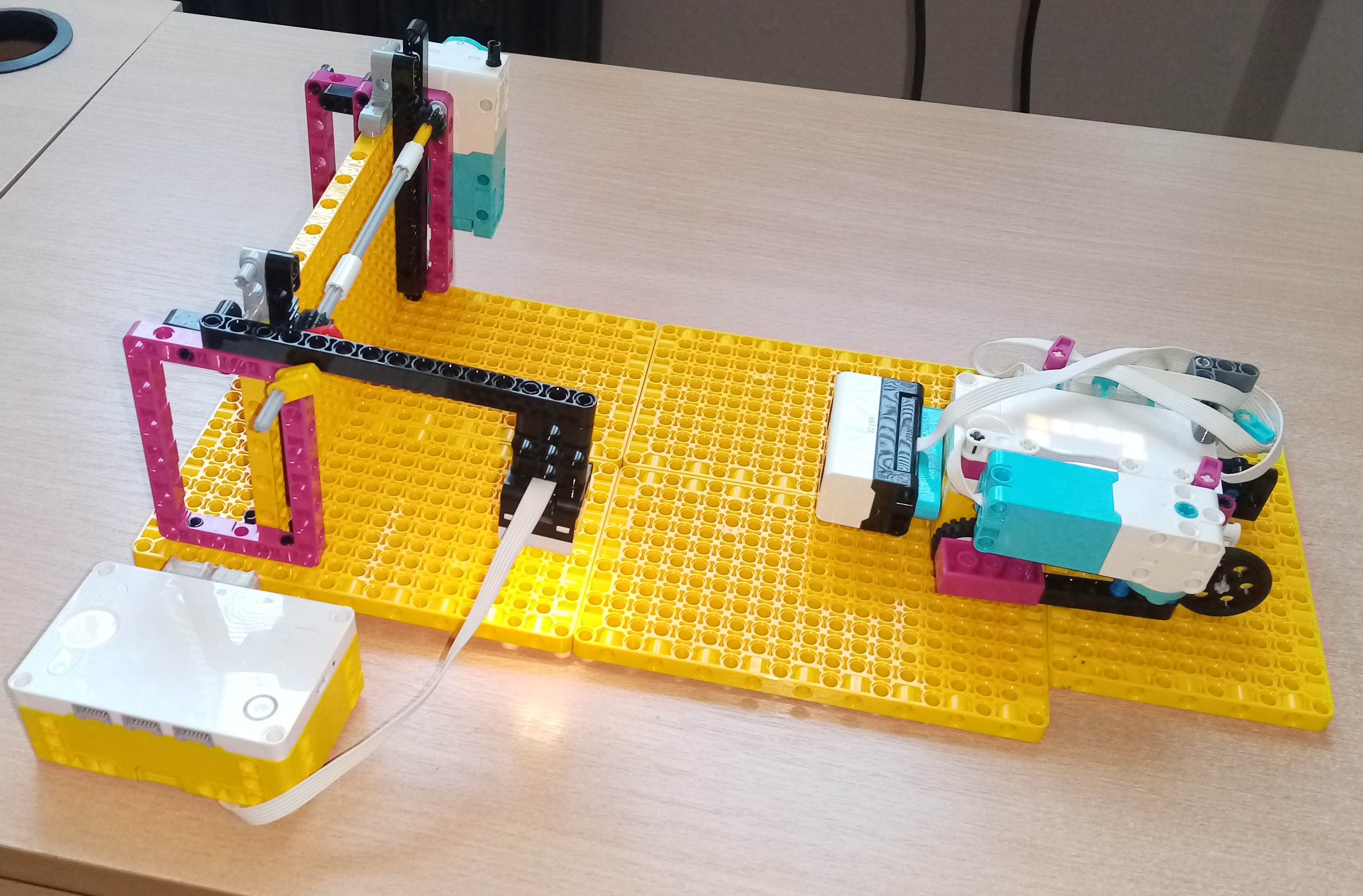 VOZIDLO: funguje na spôsobe dvoch motorov, s tým že jeden poháňa samotné vozidlo a druhý poháňa rameno ktoré vystrčí farebnú kocku. Na prednej strane robota je ešte ultrazvukový senzor, ktorý určuje vzdialenosť. DVERE: fungujú na princípe jedného motora, ktorý poháňa samotnú bránu a senzore, ktorý zaznamenáva farebnú kocku.