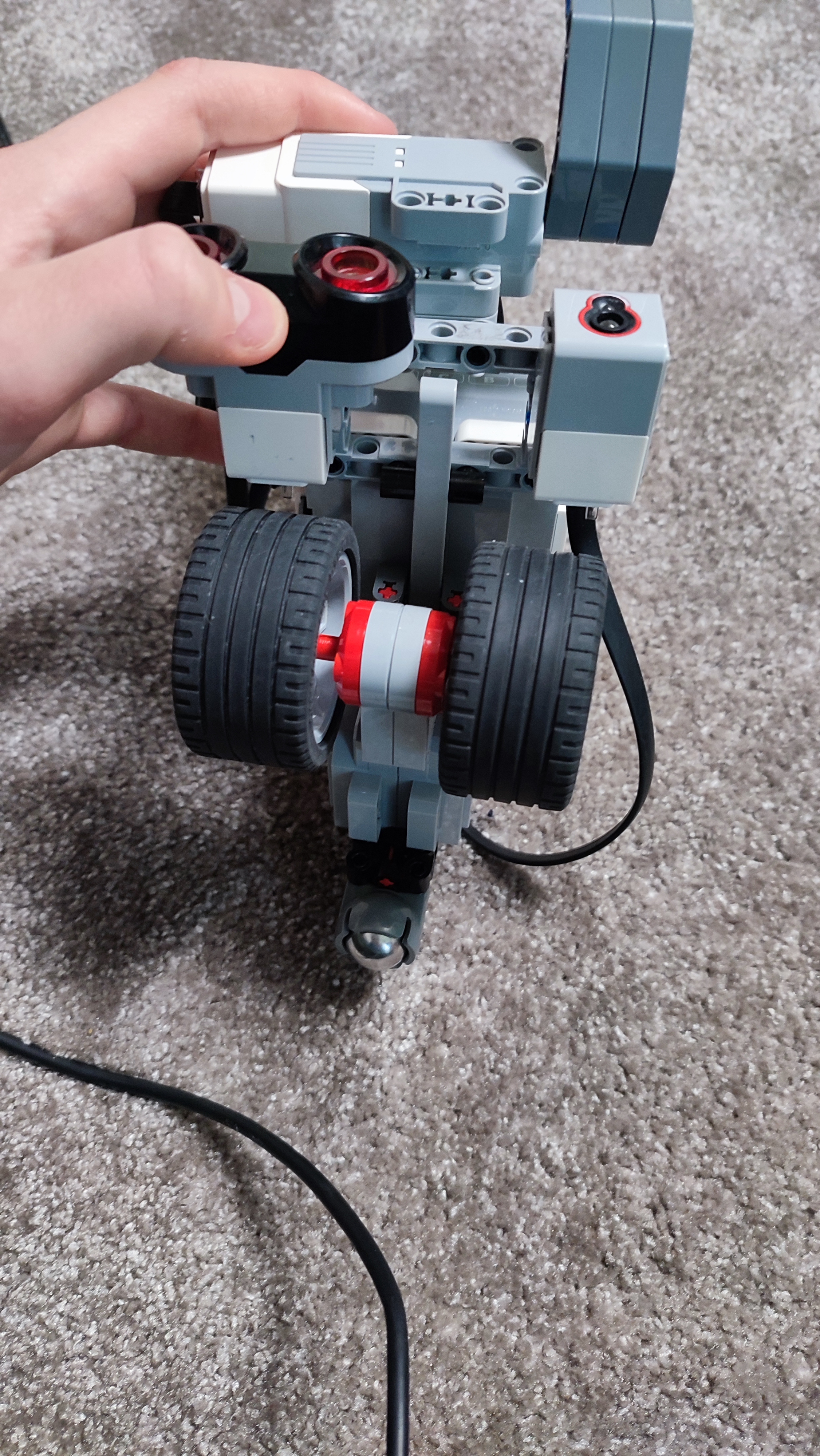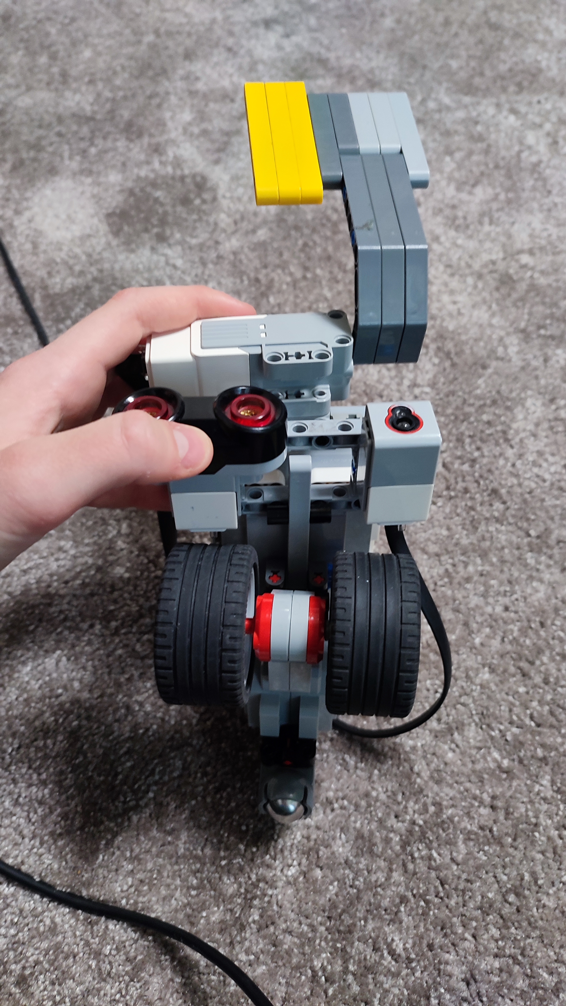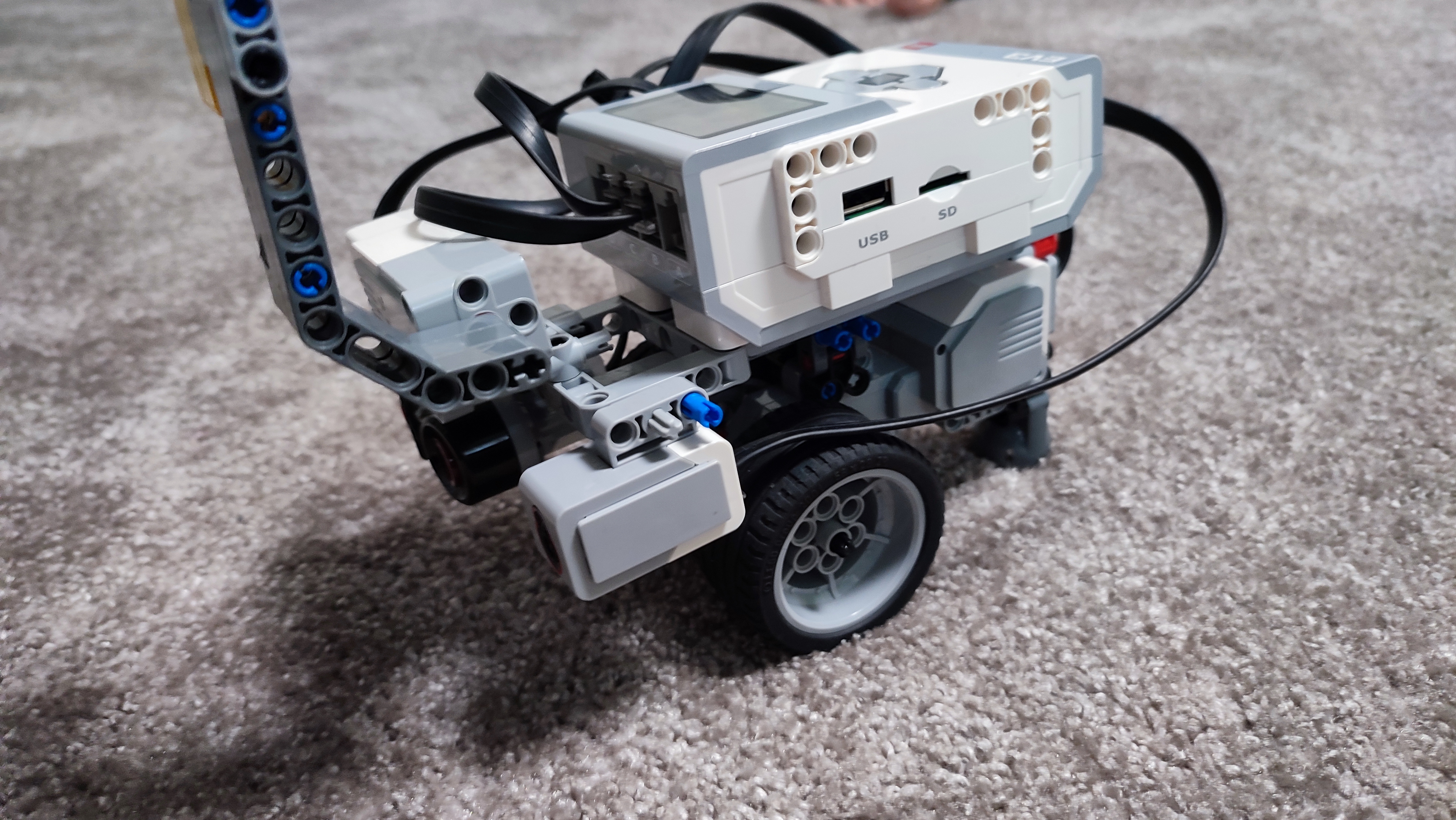 Naše auto sa skladá z jedného large motora, z jedného colour senzora, z jedného ultrazvukového senzora a z jedného medium motora.
