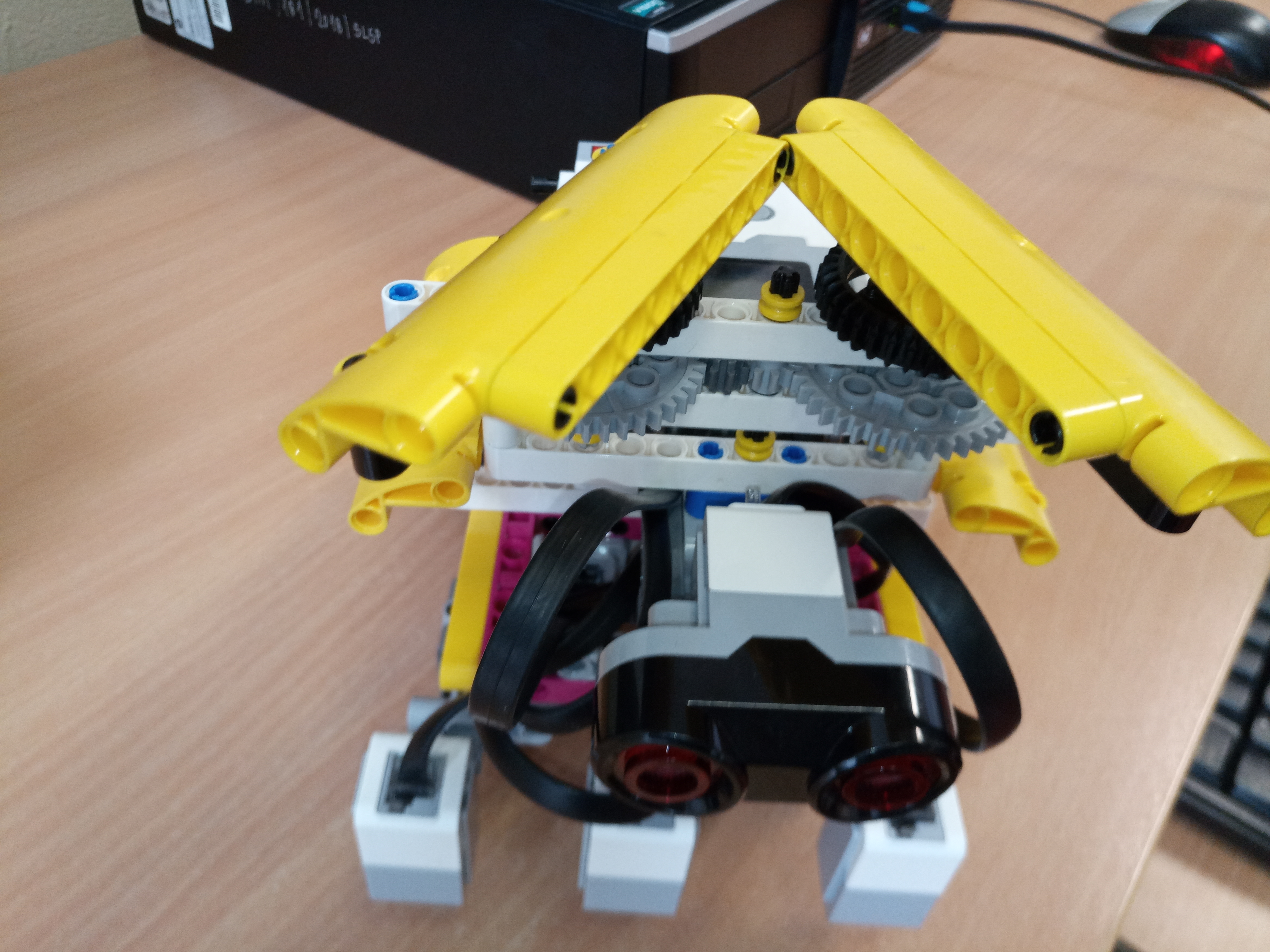 Pacman sa skladá zo žltej papule a žltého tela.Skladá sa aj z kocky EV3 a Color Senzorov. Má jeden malý motor na otváranie papule počas jazdy a prevody, aby na papulu stačil jeden motor. Otváranie papule sme dali do Myblocku. Ešte má USG senzor, aby našiel ducha. Keď nájde ducha blízko, dá sa na útek.