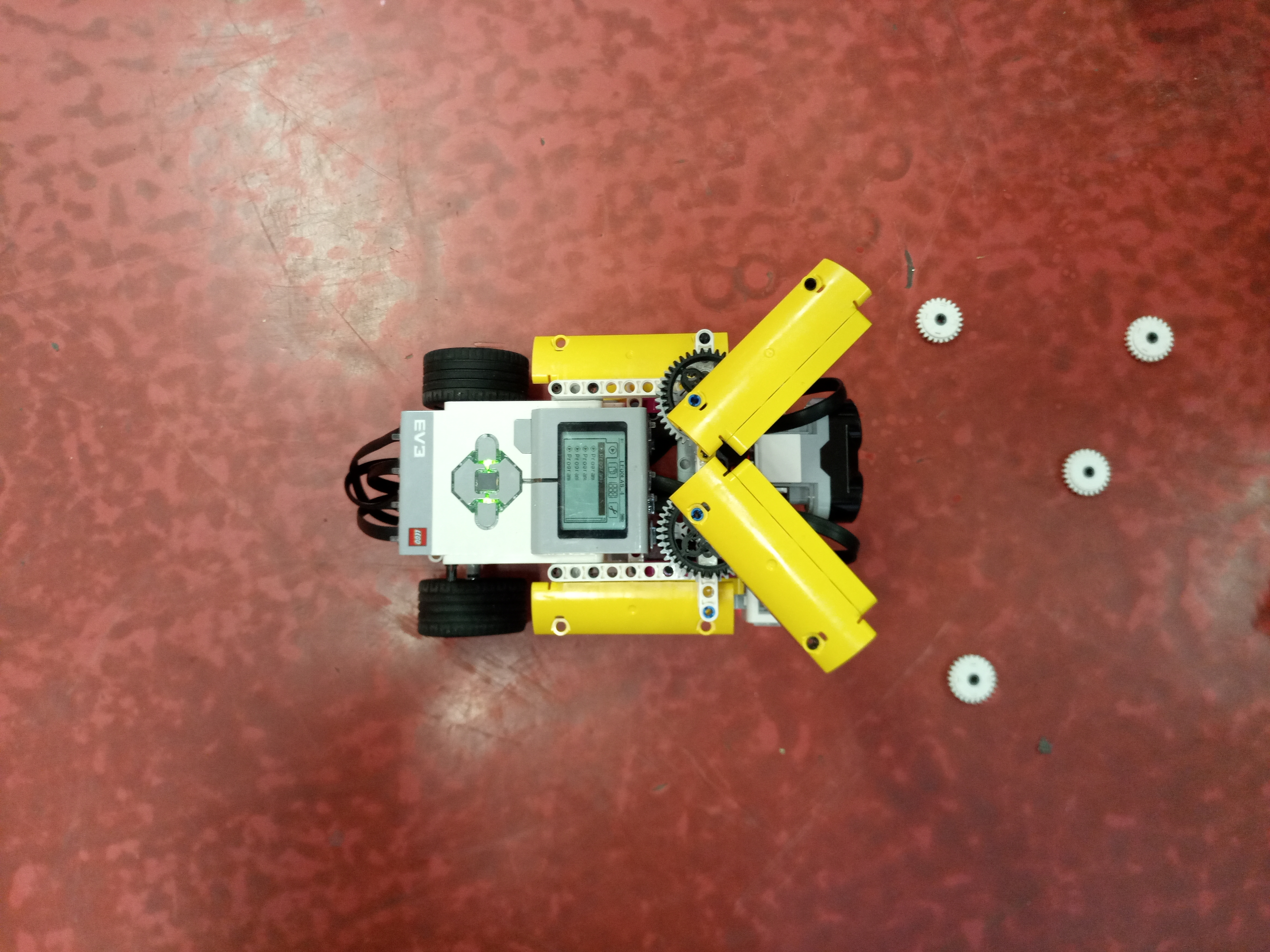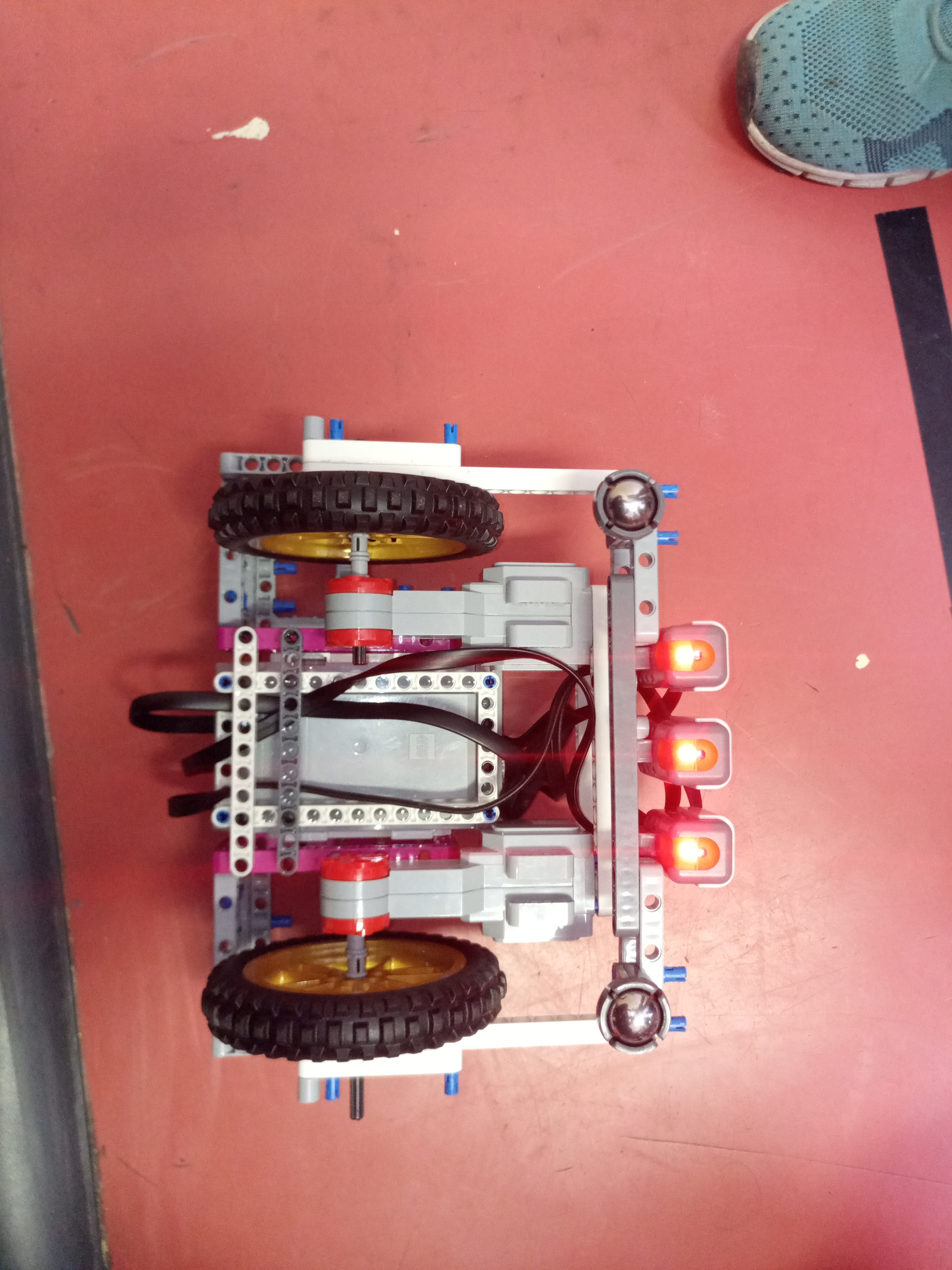 Náš robot sa skladá z 2 motorov, 1 EV3 kocky a 3 NXT svetelné senzory.