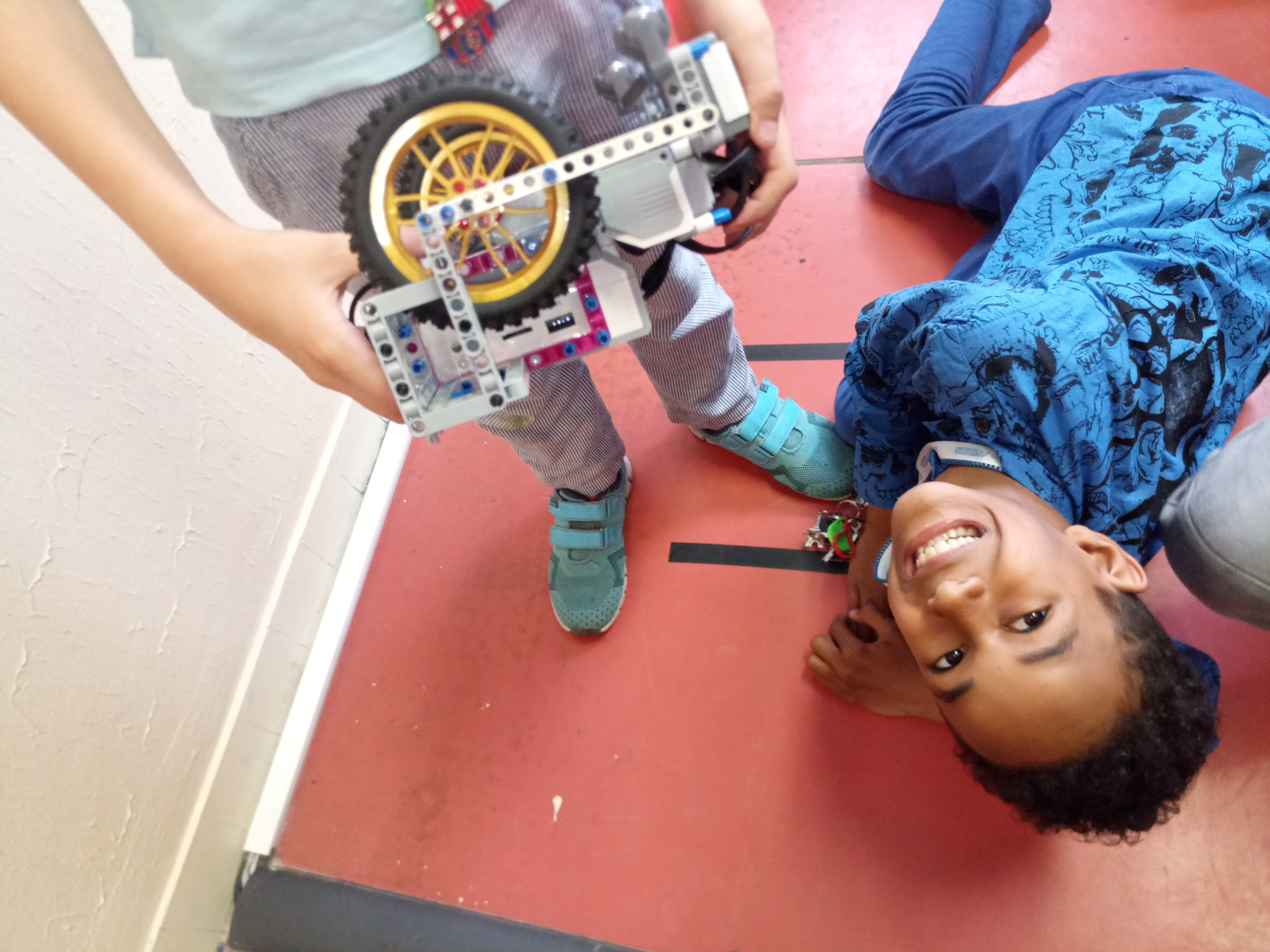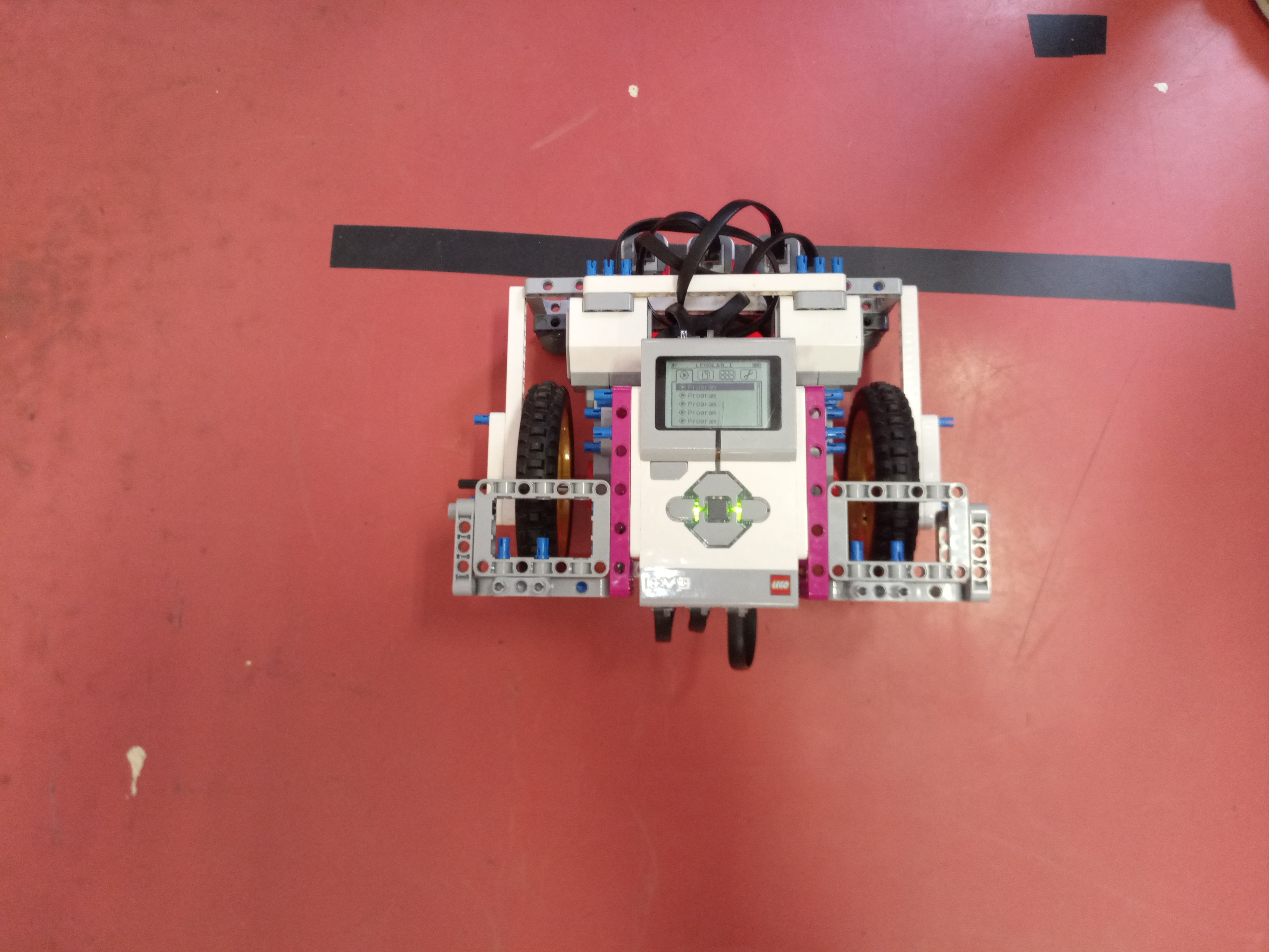 Robot ide kým nenájde čierny pás. Keď ho nájde zastaví sa a potom sa vyrovná tak, aby po poli chodil rovnobežne. To sme všetko strčili do MY block. Aby sa robot zarovnal vždy, tak sme ho nechali block opakovať viackrát. Potom ide cez pole, až kým nenájde druhú stranu poľa. Potom sa otočí a ide druhý pás. Raz sa točí vpravo, raz sa točí vľavo. Keď to spraví 4x, tak prešiel cez pole.