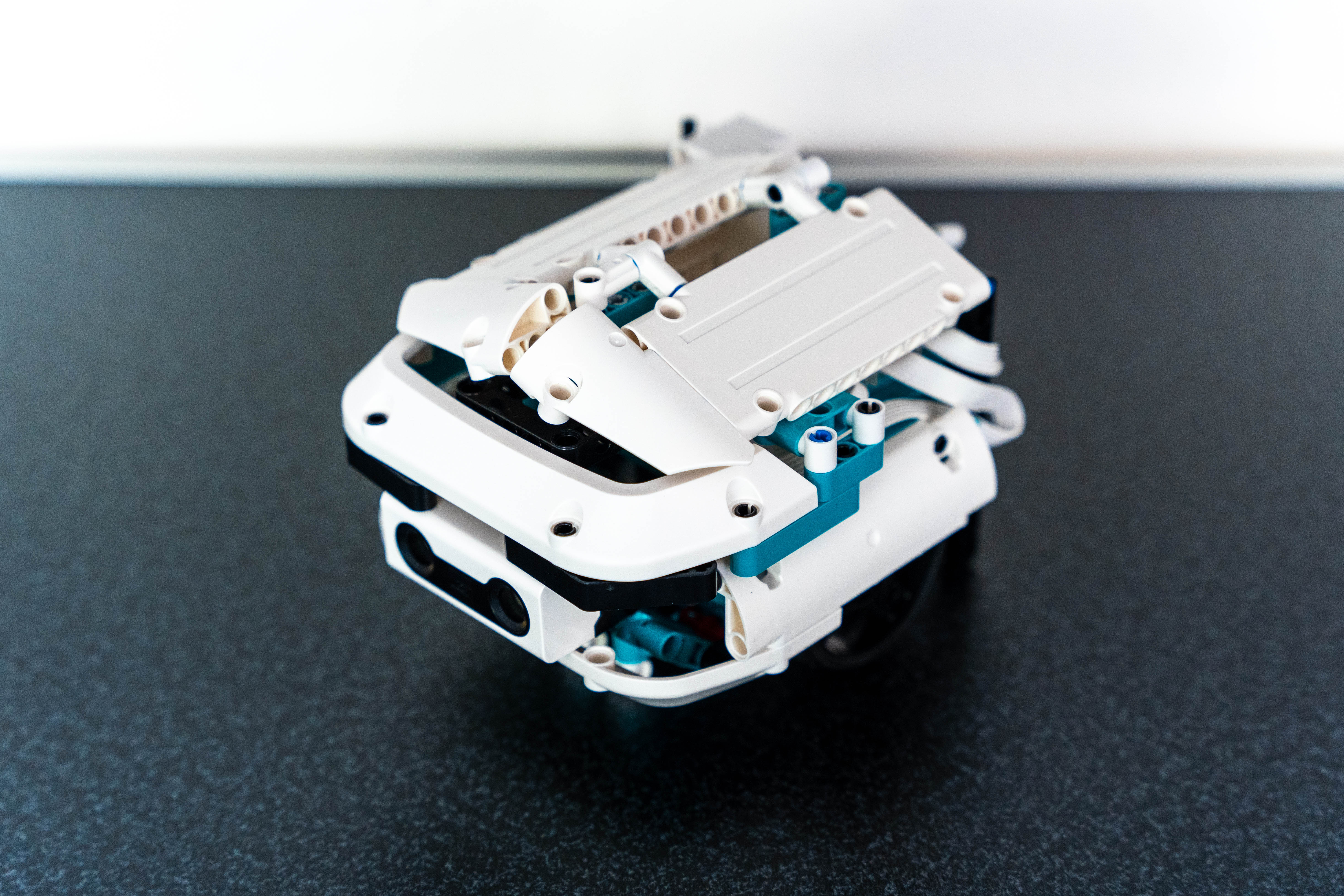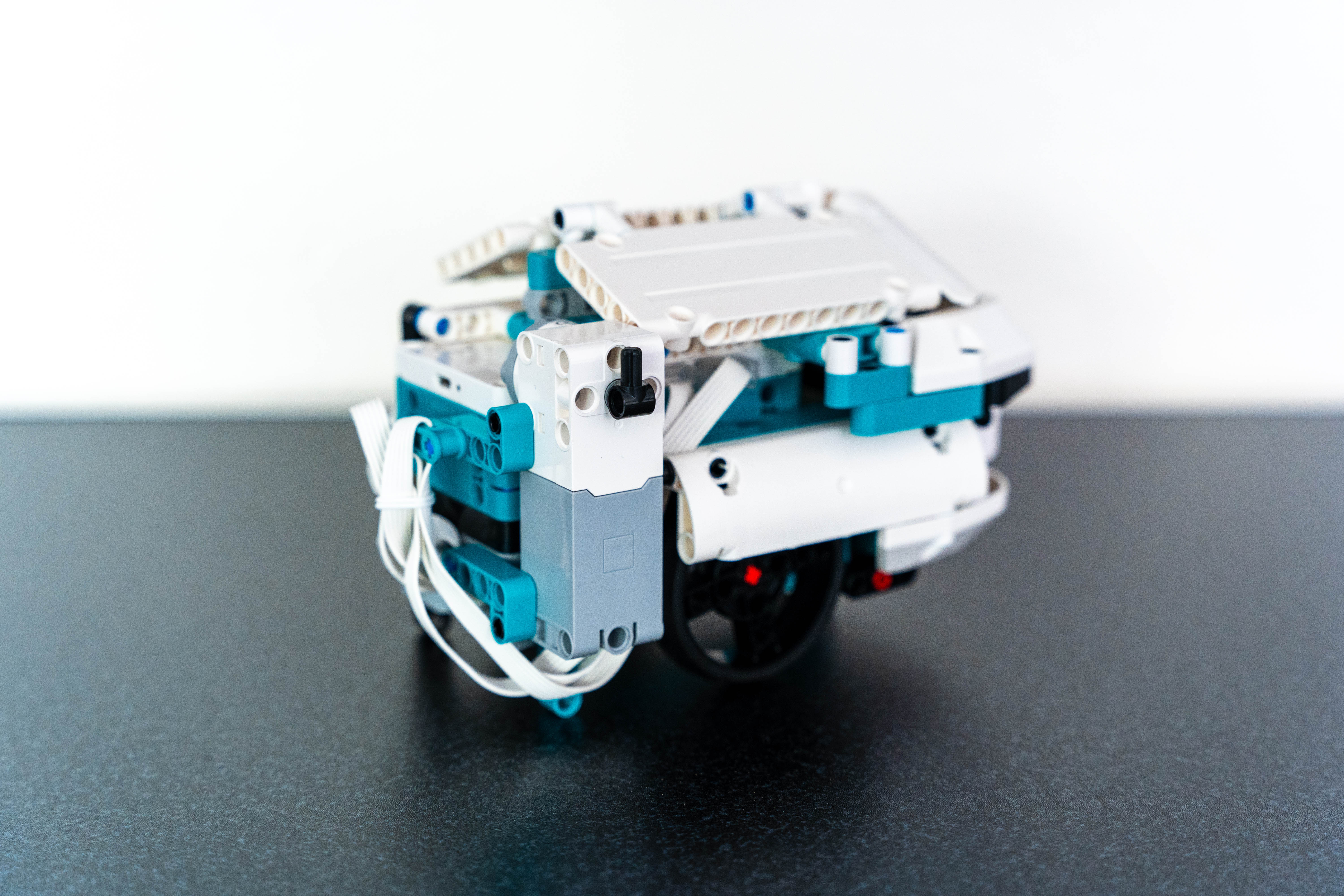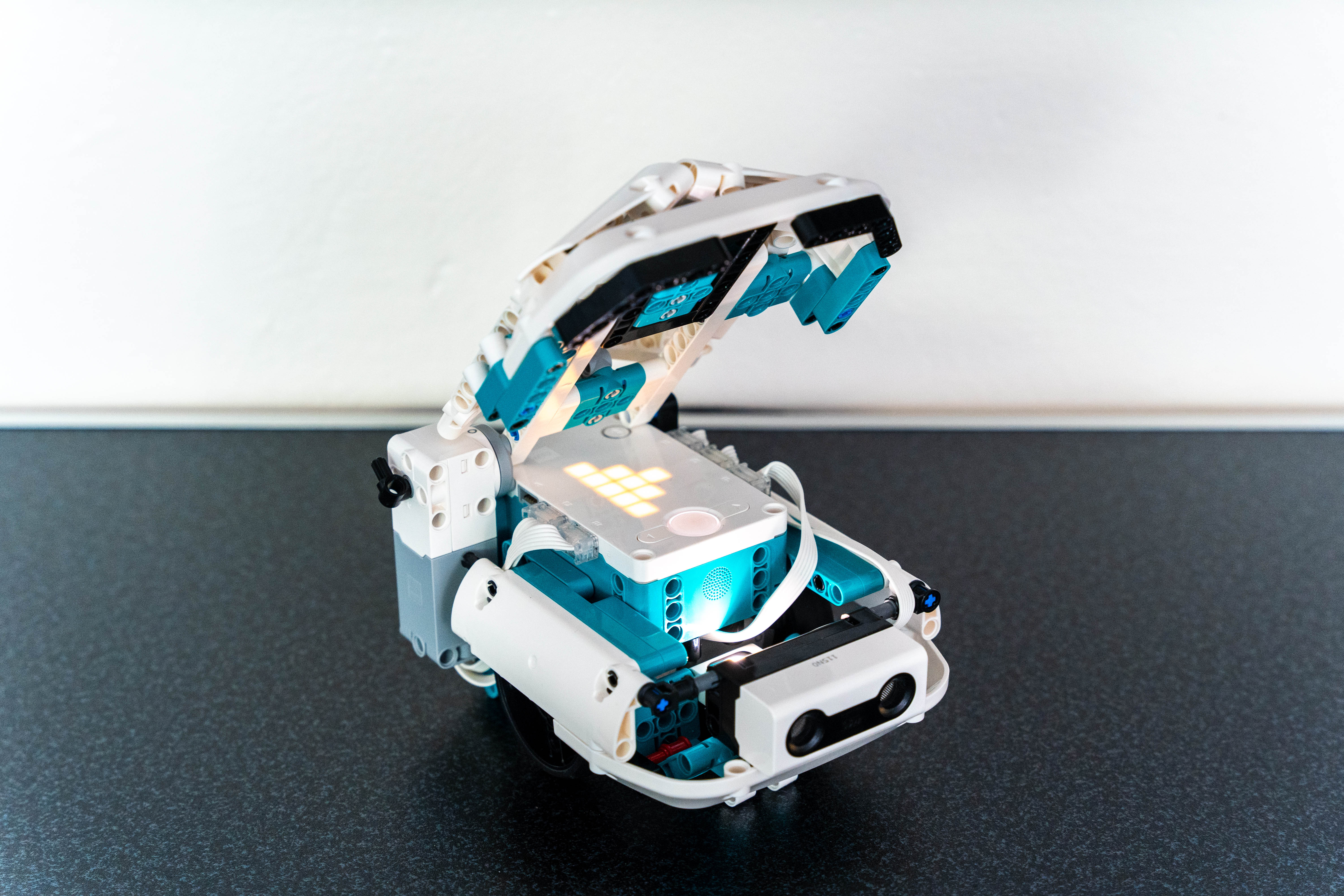 Na robota sme použili tri motory, senzor farby a senzor na meranie vzdialenosti. Ak do úst, ktoré sa stále otvárajú hore a dole vložíte čiernu maškrtu, robot vydá zvuk. Ak robot príde k niečomu až moc blízko, otočí sa.
