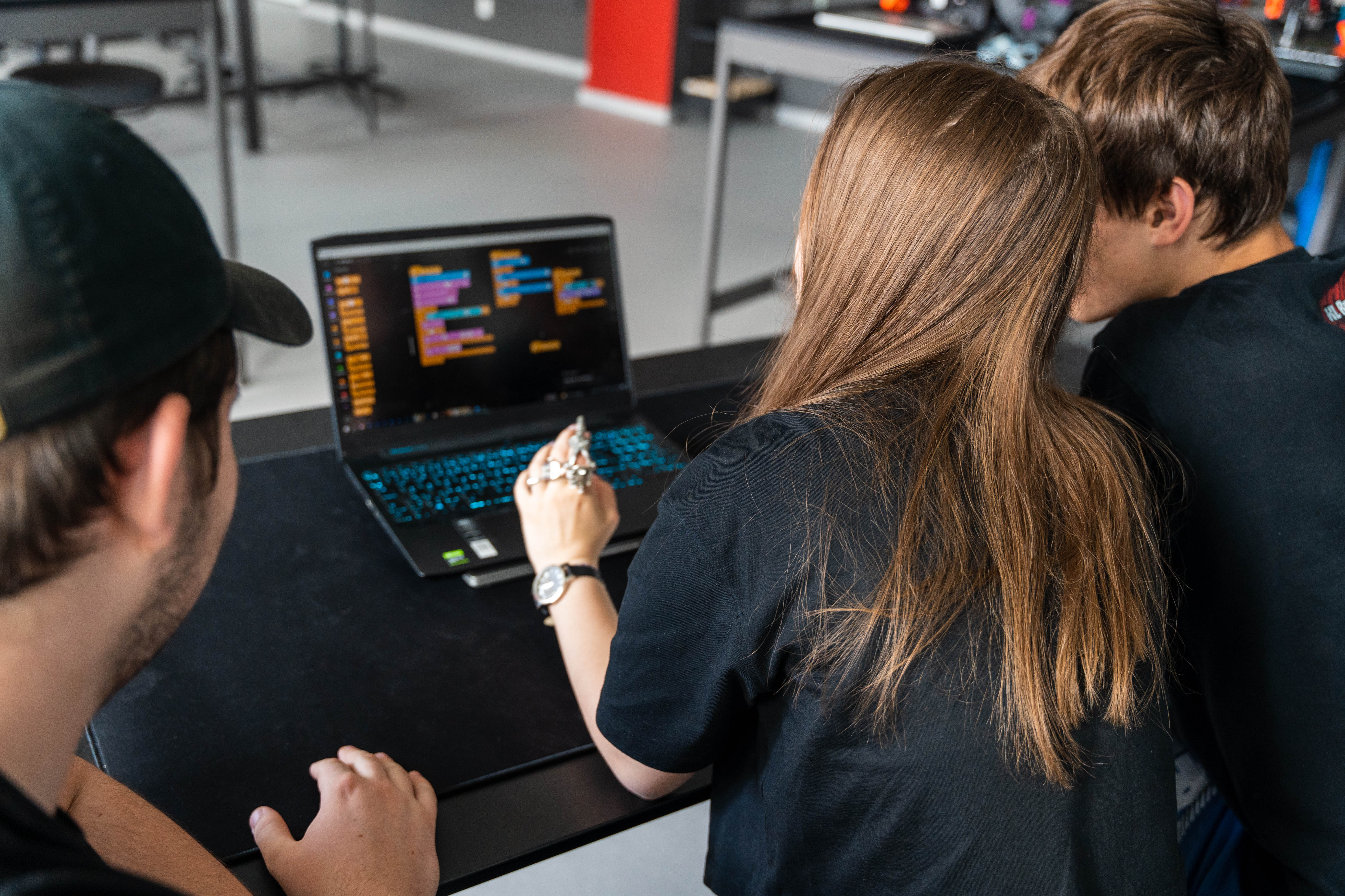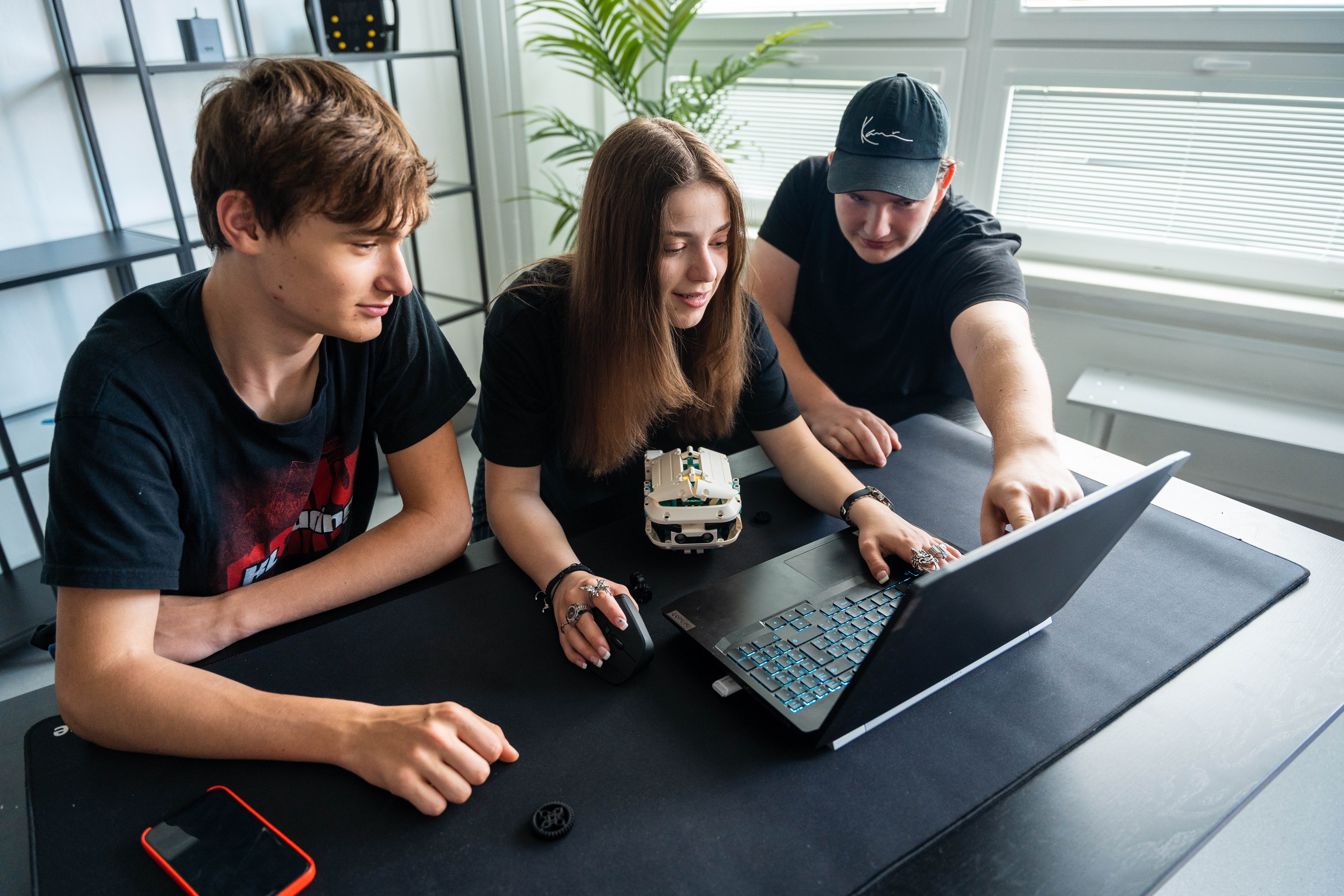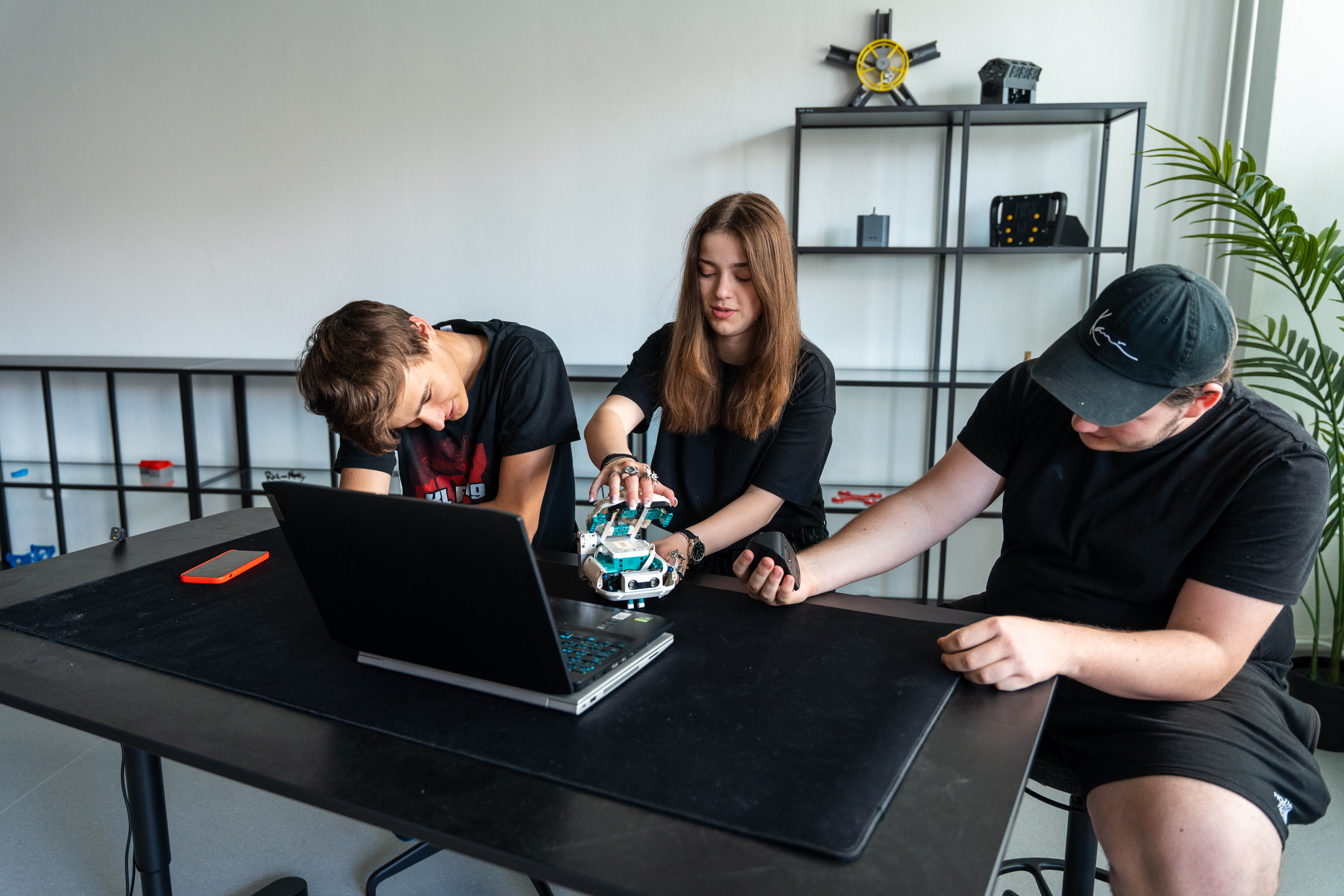 Na robota sme použili tri motory, senzor farby a senzor na meranie vzdialenosti. Ak do úst, ktoré sa stále otvárajú hore a dole vložíte čiernu maškrtu, robot vydá zvuk. Ak robot príde k niečomu až moc blízko, otočí sa.