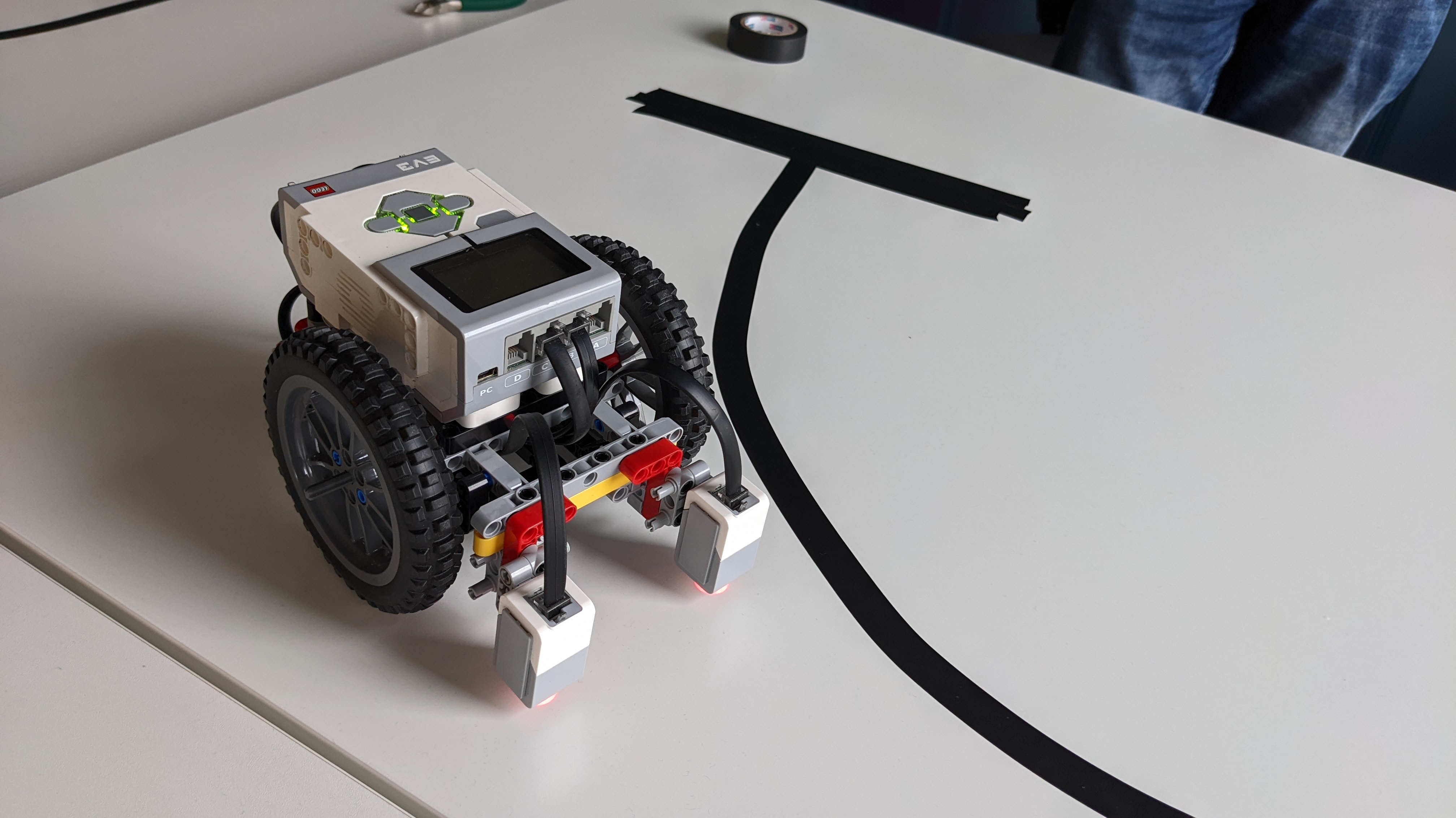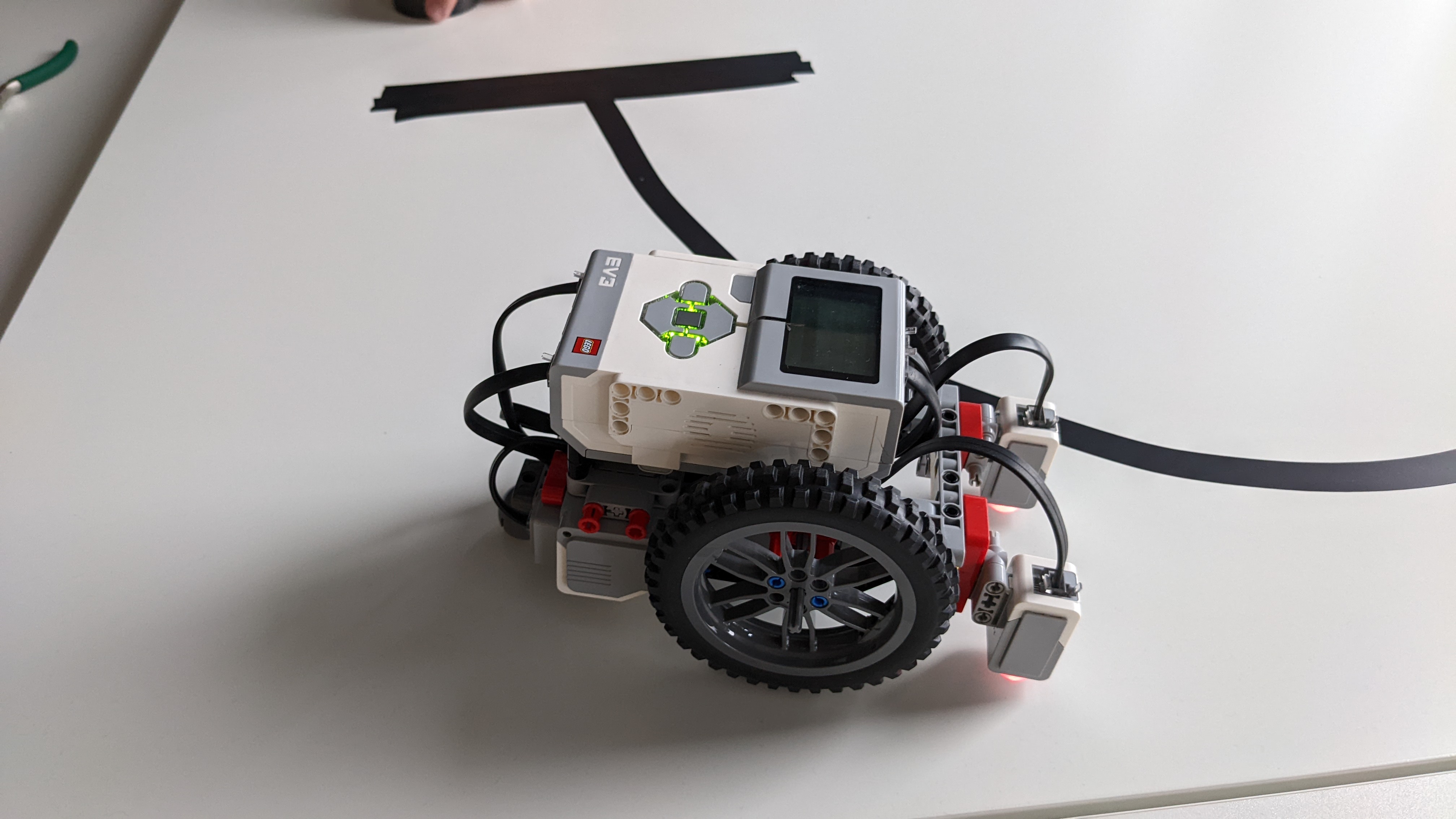 Stavba Robota:Robot sa skladá z ev3 riadiacej kocky, dvoch medium motorov zapojených do portov B a C,dvoch color sensorov zapojených do portov 1 a 4. Na medium motory sú pripojené veľké kolesáa zo zadu robota podobiera gulička.